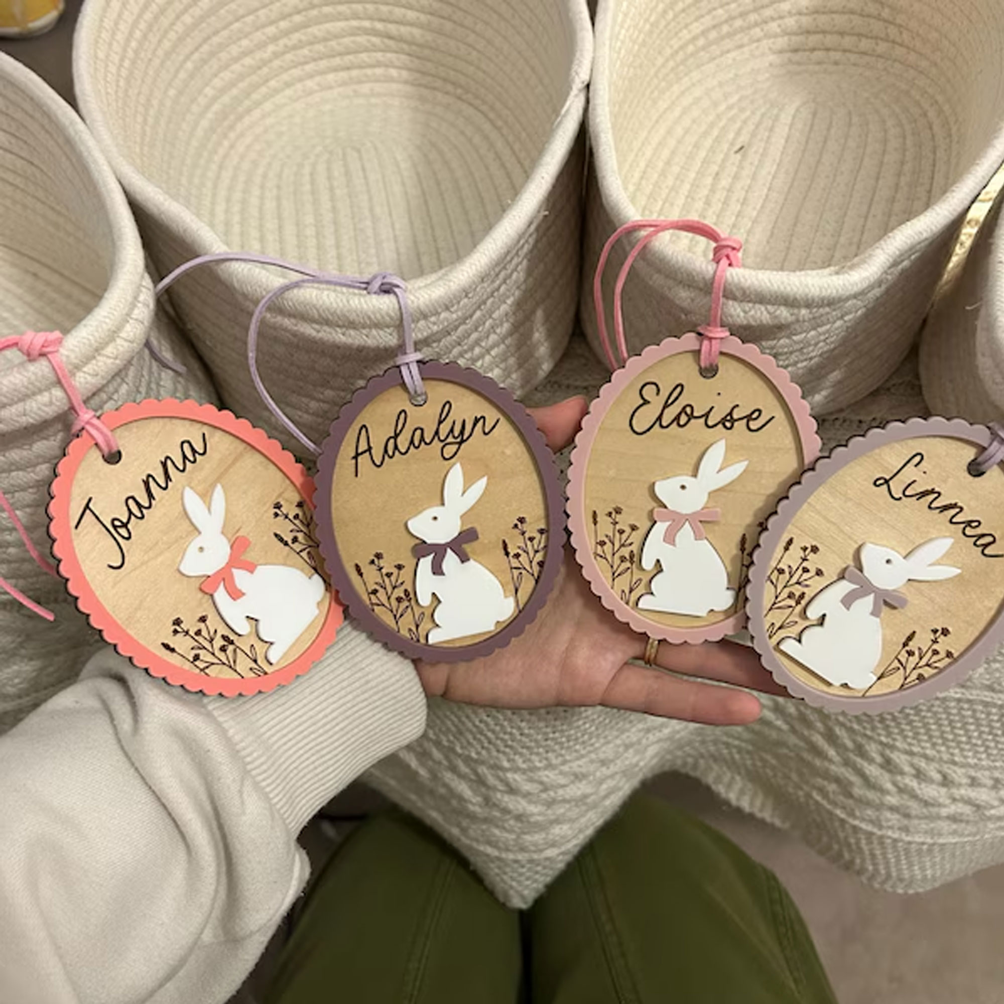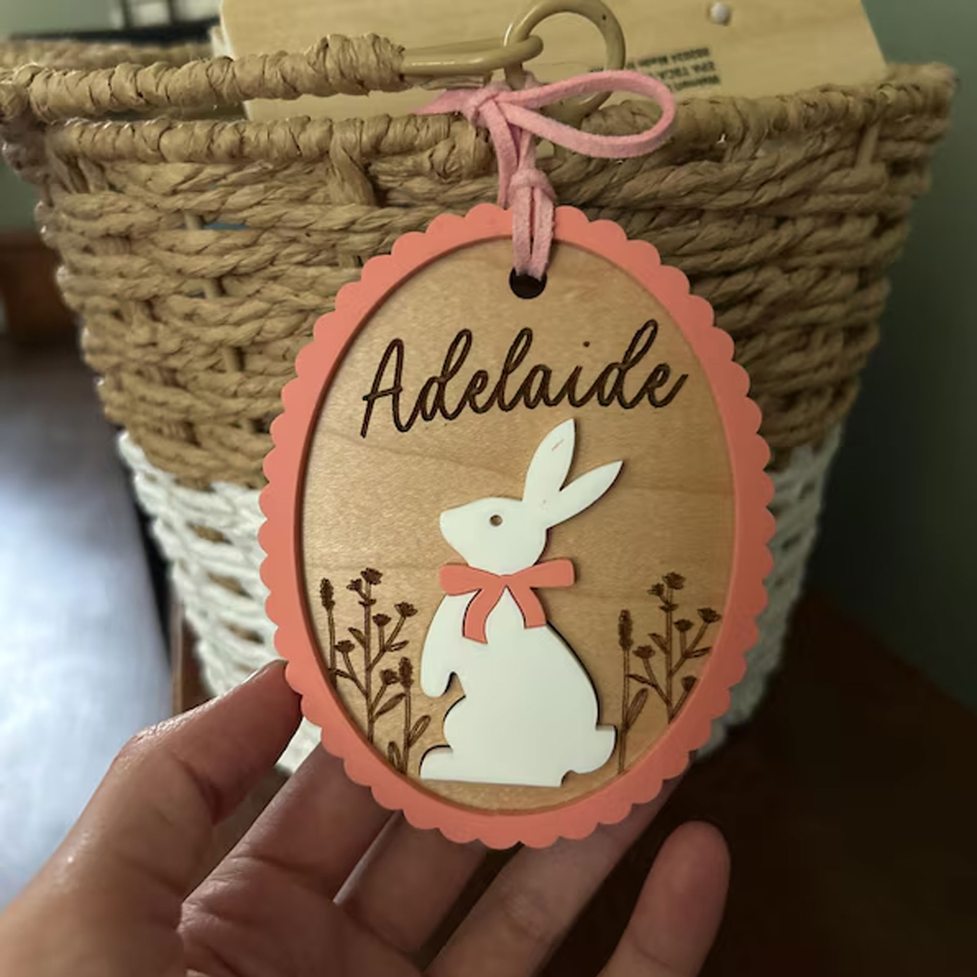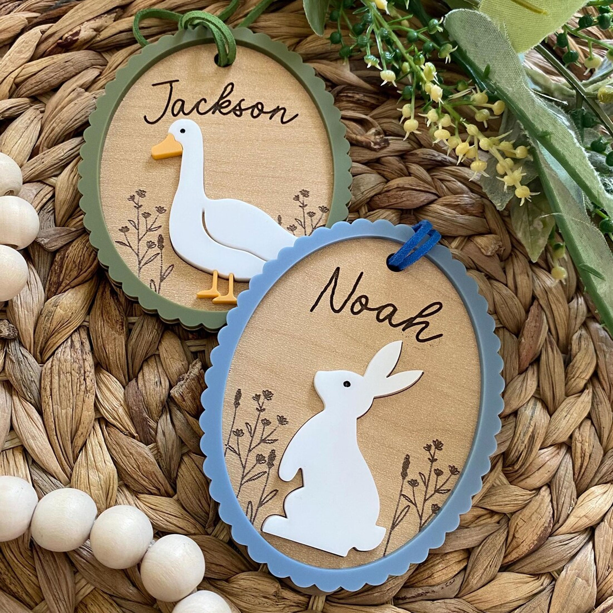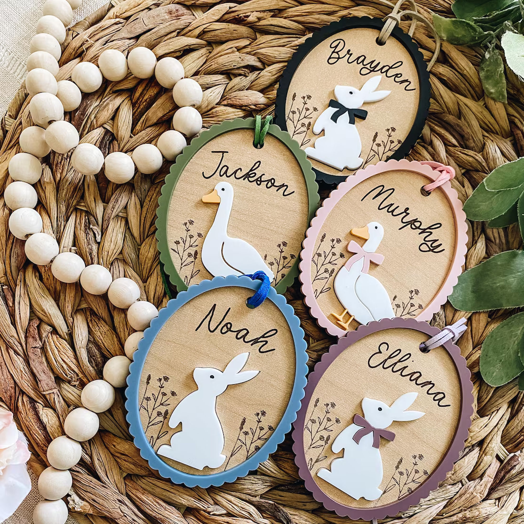 | Style | Custom 3D Engraved Name Floral Bunny Goose with Bow Easter Basket Tag |