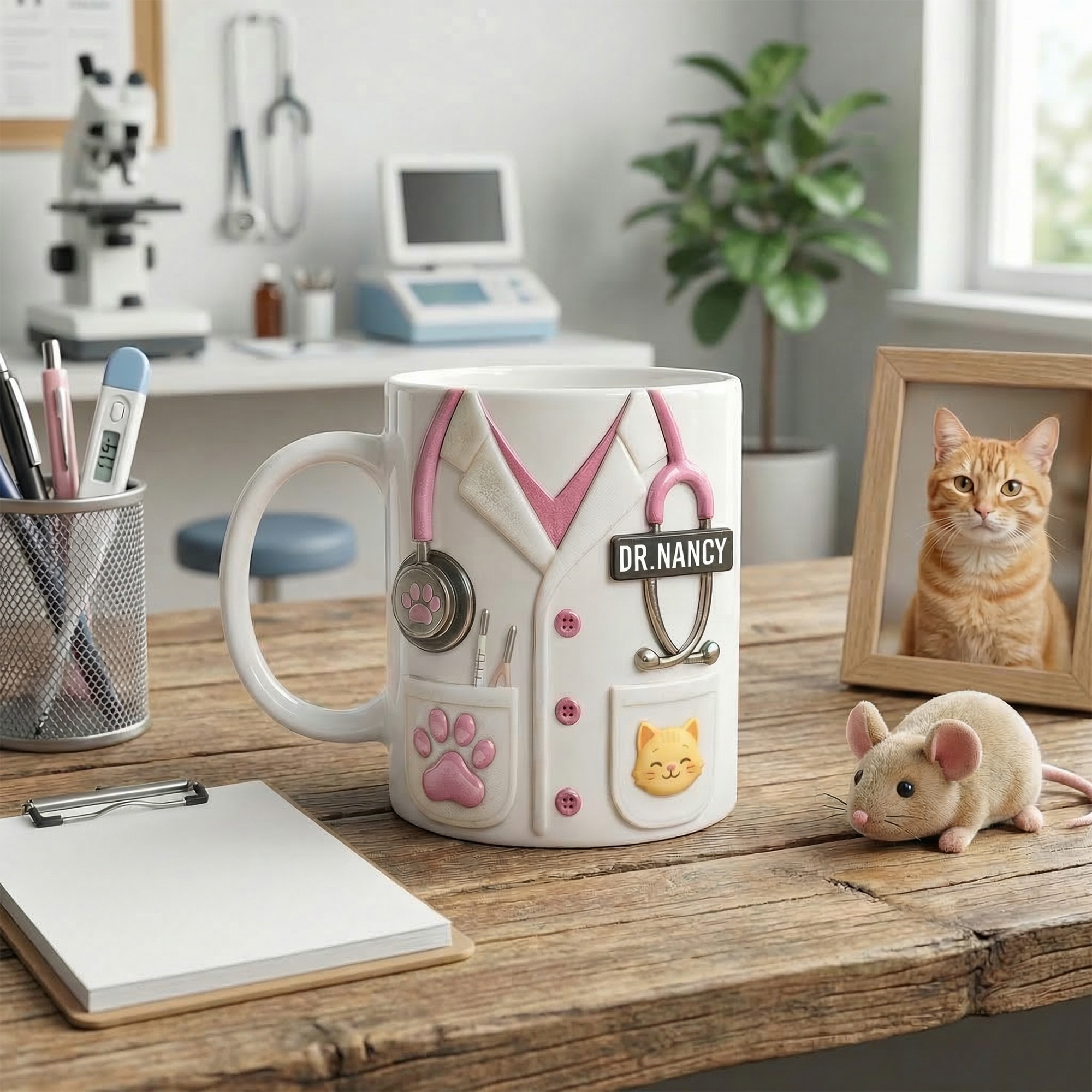 Veterinarian Theme Mug – This charming mug features a 3D design of a doctor’s coat with a stethoscope, pockets, and cute animal details like paw prints and a puppy face. The realistic accessories bring a playful yet professional touch, making it perfect for anyone who loves animals and healing.