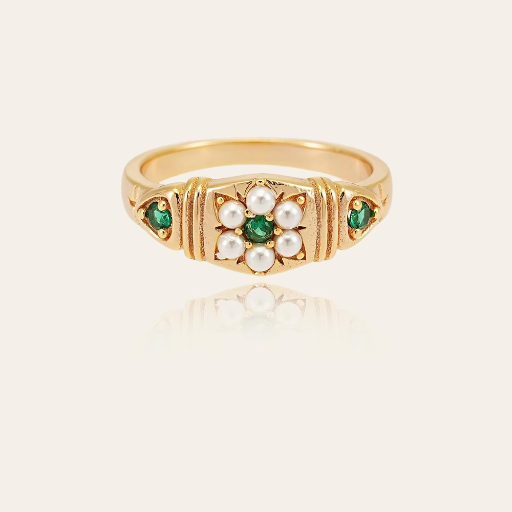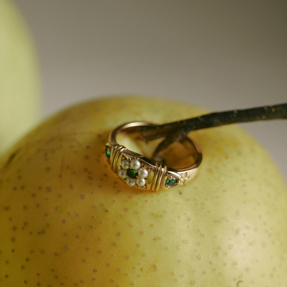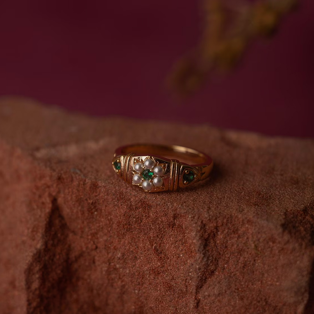 Timeless Floral Design - This exquisite custom vintage emerald pearl ring features a stunning floral motif. Its unique design beautifully combines emerald stones and lustrous pearls, creating a captivating and timeless piece.