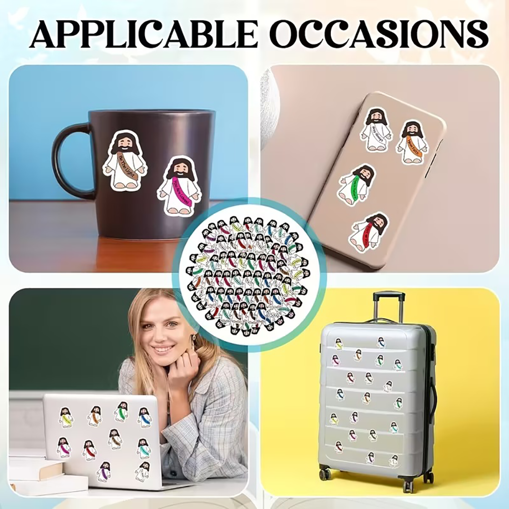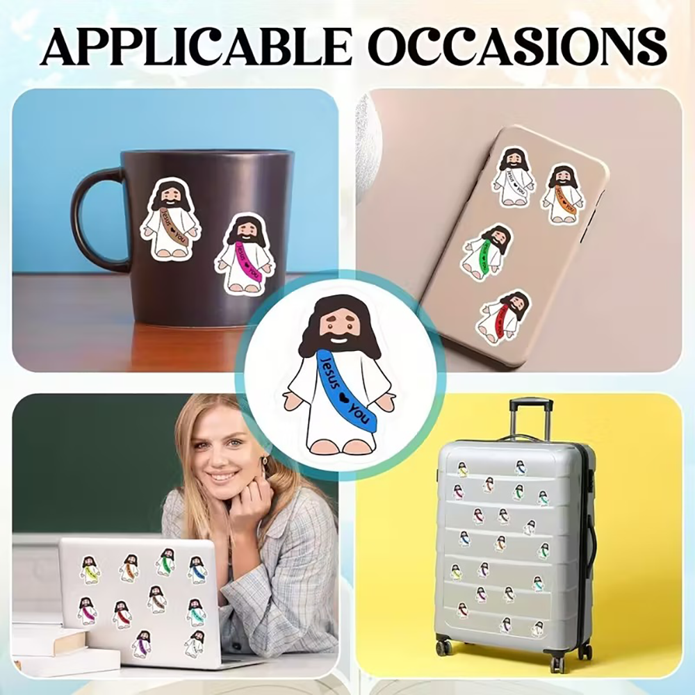 Faith-Based Fun - These adorable stickers feature a charming cartoon depiction of Jesus, complete with colorful sashes that carry uplifting messages like "Jesus Loves You," "Peace," and "Blessings." Perfect for spreading joy and faith!