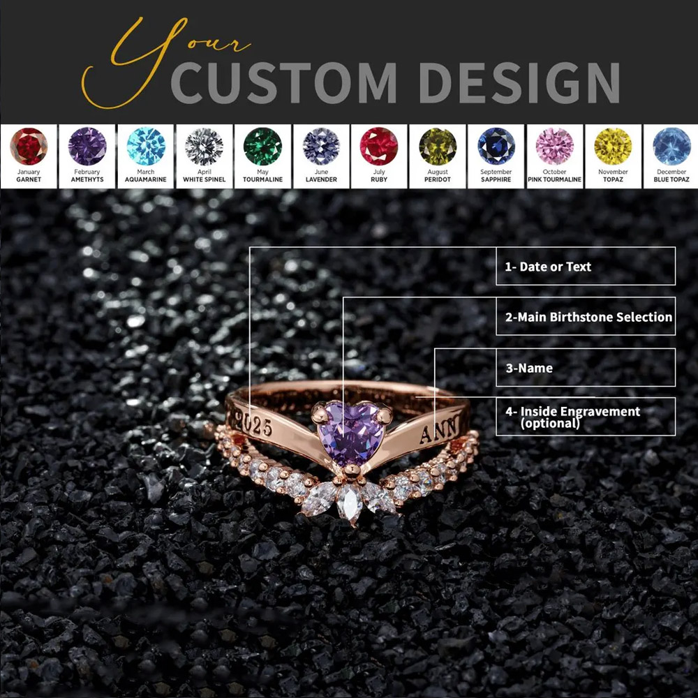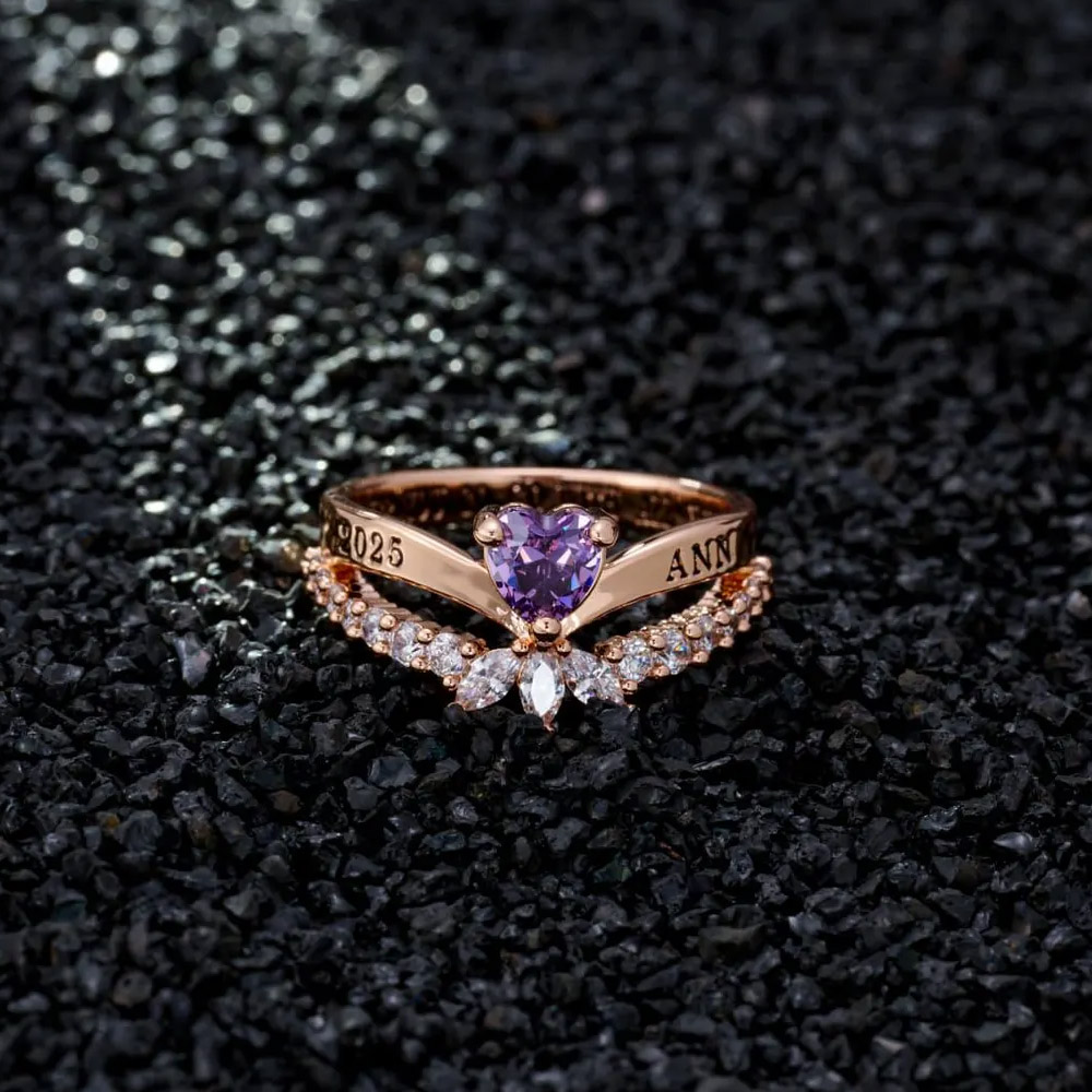Elegant Graduation Bouquet — A graceful heart-shaped birthstone sits at the center, flanked by delicate floral motifs and sparkling accent stones. The band curves like a wreath of honor, symbolizing achievement and new beginnings. Every detail is crafted to reflect pride, hope, and personal significance.