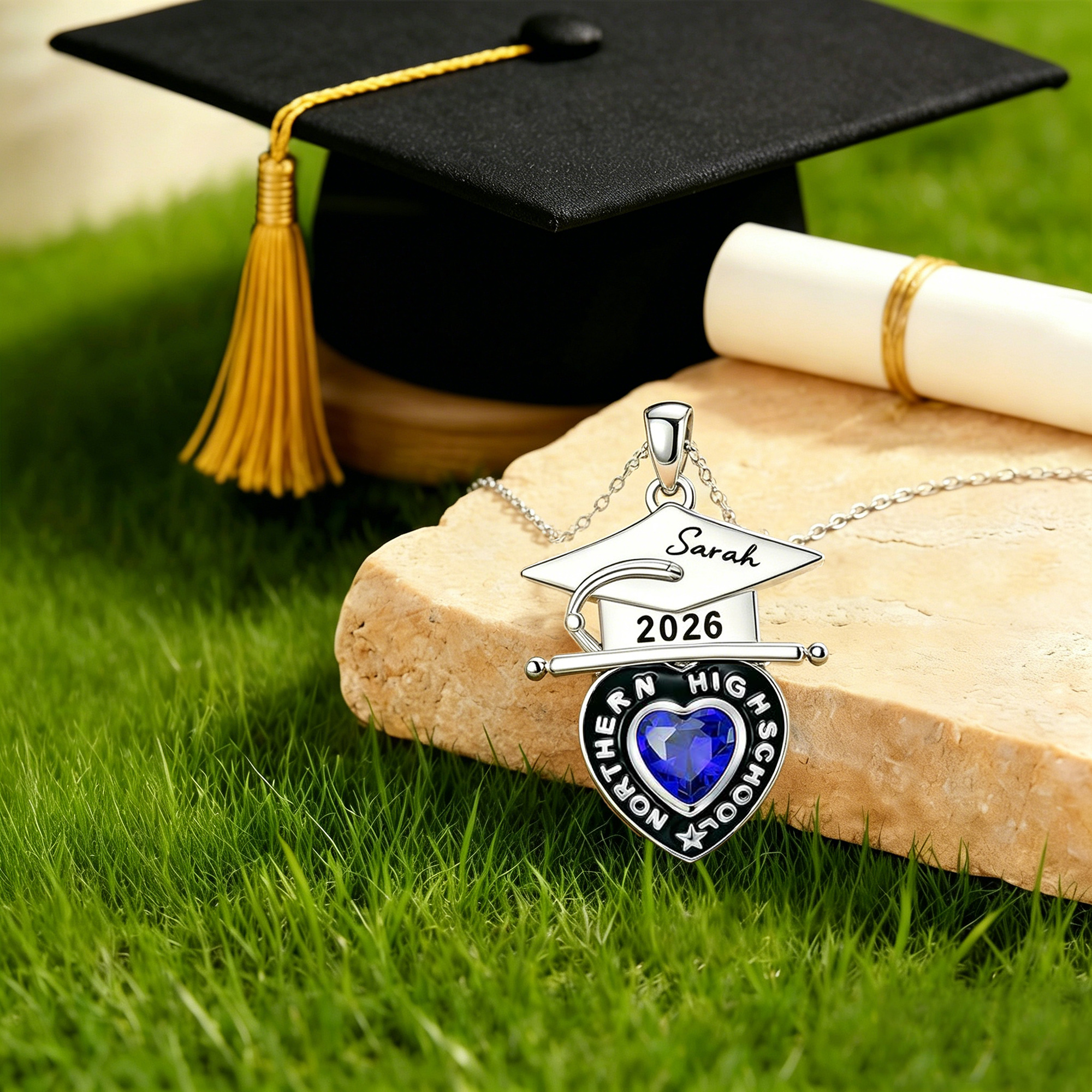 Symbolic Graduation – A delicate graduation cap rests atop a heart-shaped charm engraved with school name and year, while a vibrant birthstone at the center adds personal meaning—representing the graduate’s birth month or a cherished loved one’s.