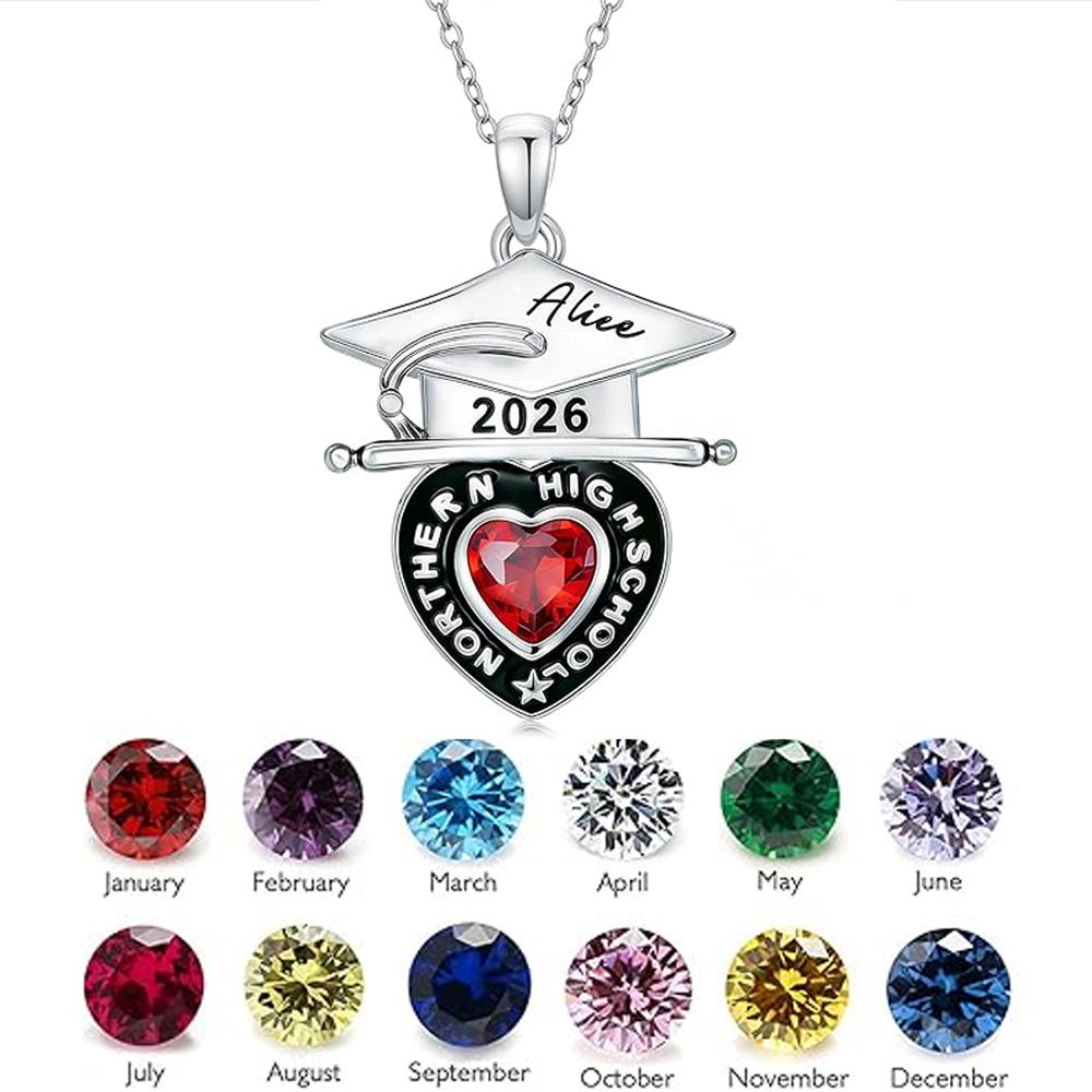 Custom Grad Cap Heart Birthstone Necklace with Name, Sterling Silver 925 High School College Class of 2026 Graduation Jewelry, Gift for Graduates
