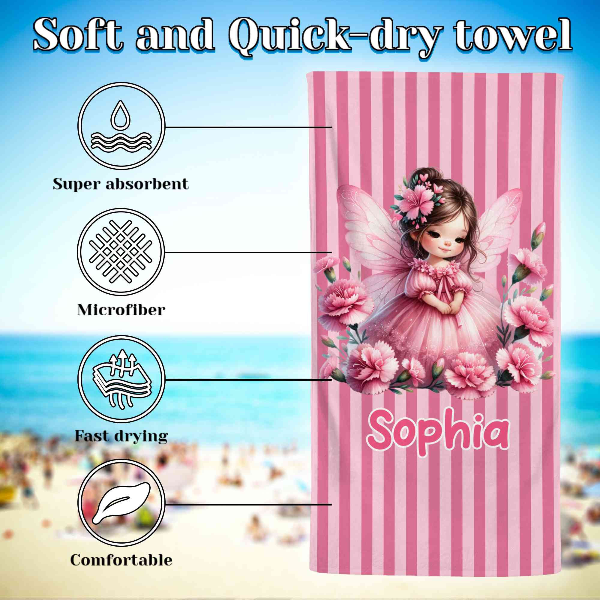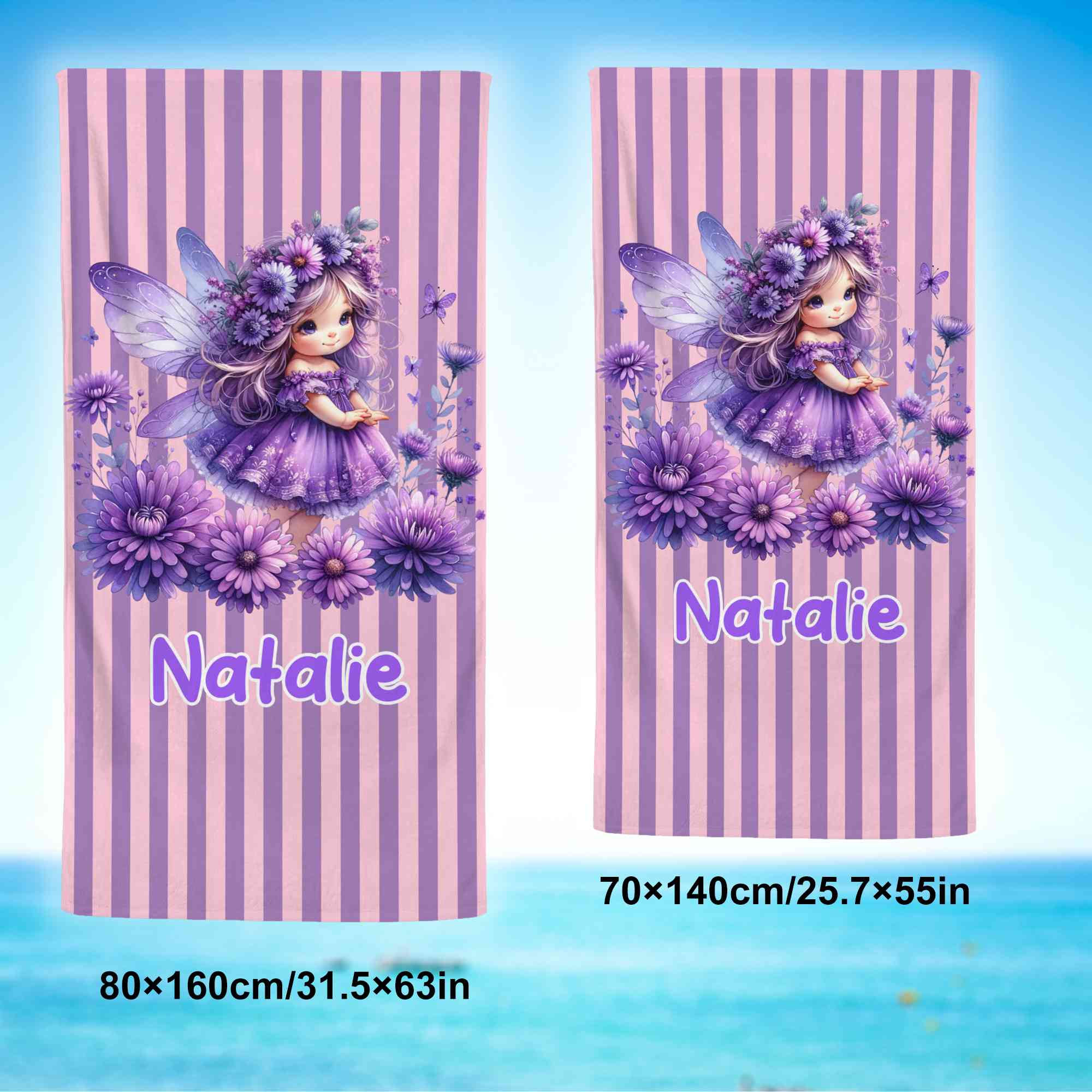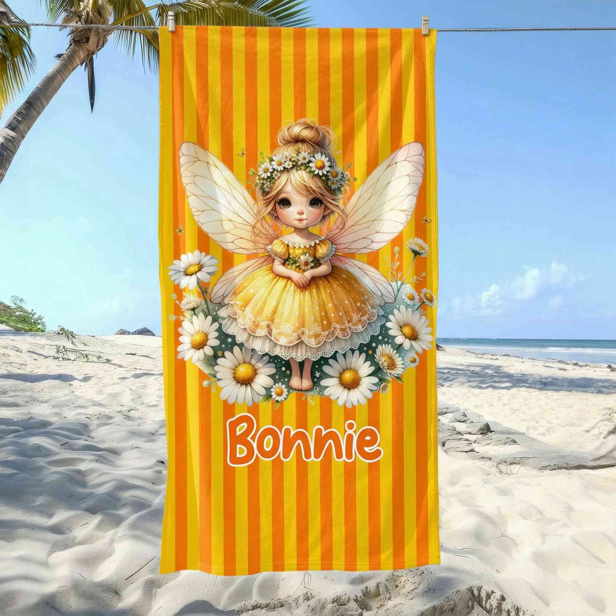 | Style | Custom Name Birth Flower Little Fairy Striped Beach Towel |