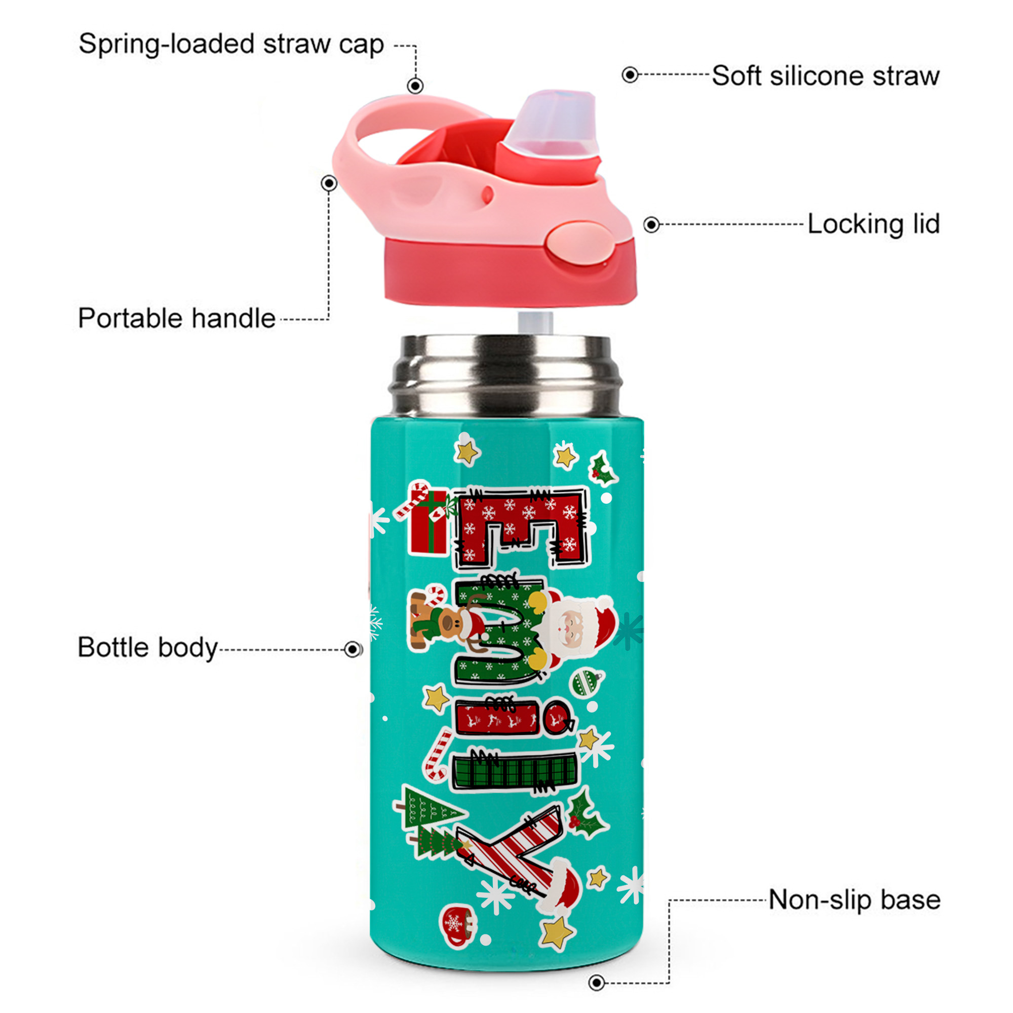 Festive Cartoon Design - This stainless steel water bottle features a fun and colorful Christmas-themed design with adorable cartoon characters such as Santa Claus, reindeer, and Christmas trees. Its bright patterns and playful style bring holiday joy to every sip, perfect for kids who love cheerful and lively designs.