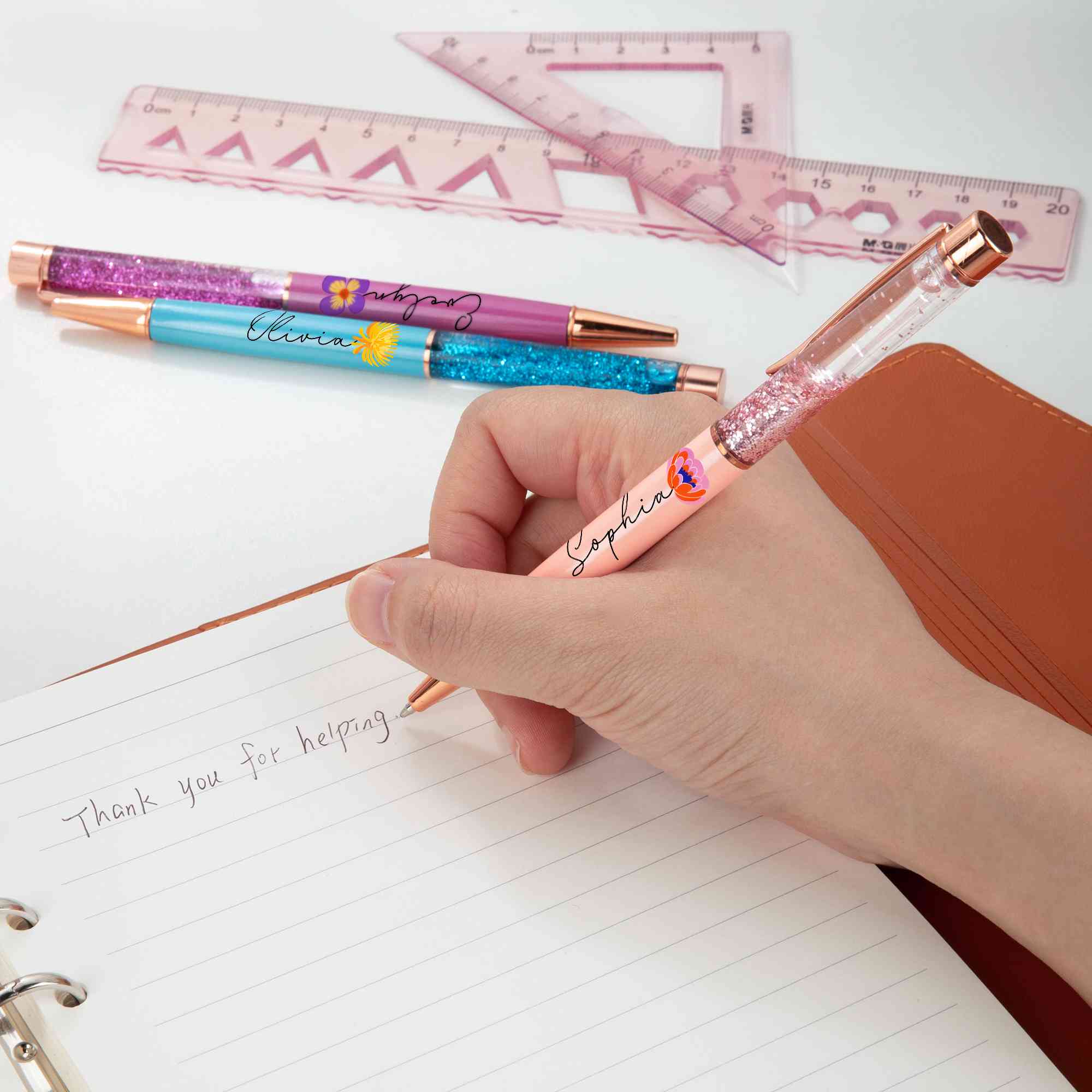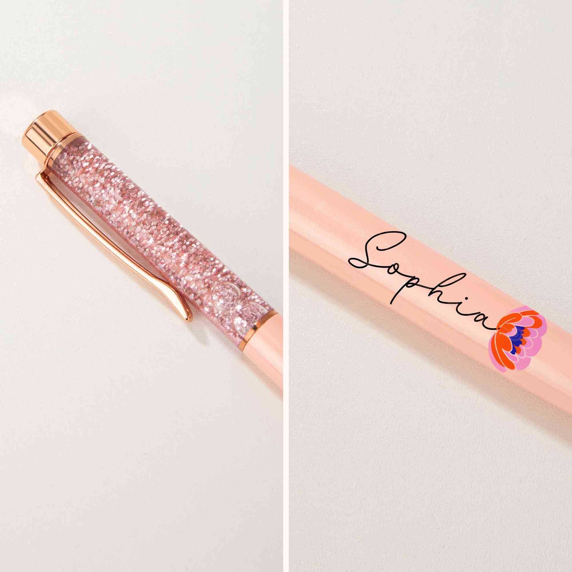 Birth Flower & Quicksand - This click pen features a vibrant birth flower illustration paired with a dynamic quicksand-filled barrel. The flowing glitter and colorful sands create a mesmerizing, bling effect that adds fun and personality to everyday writing.