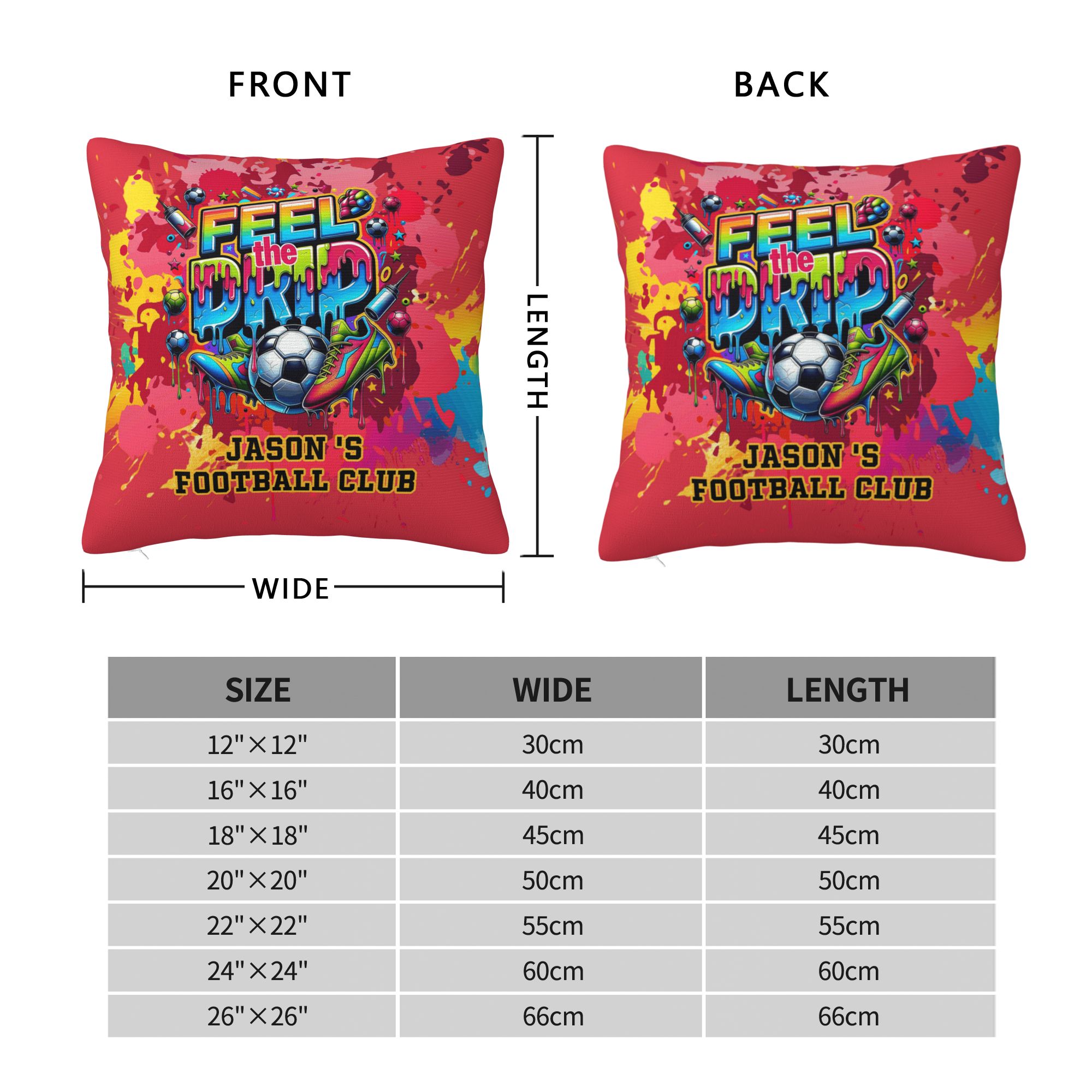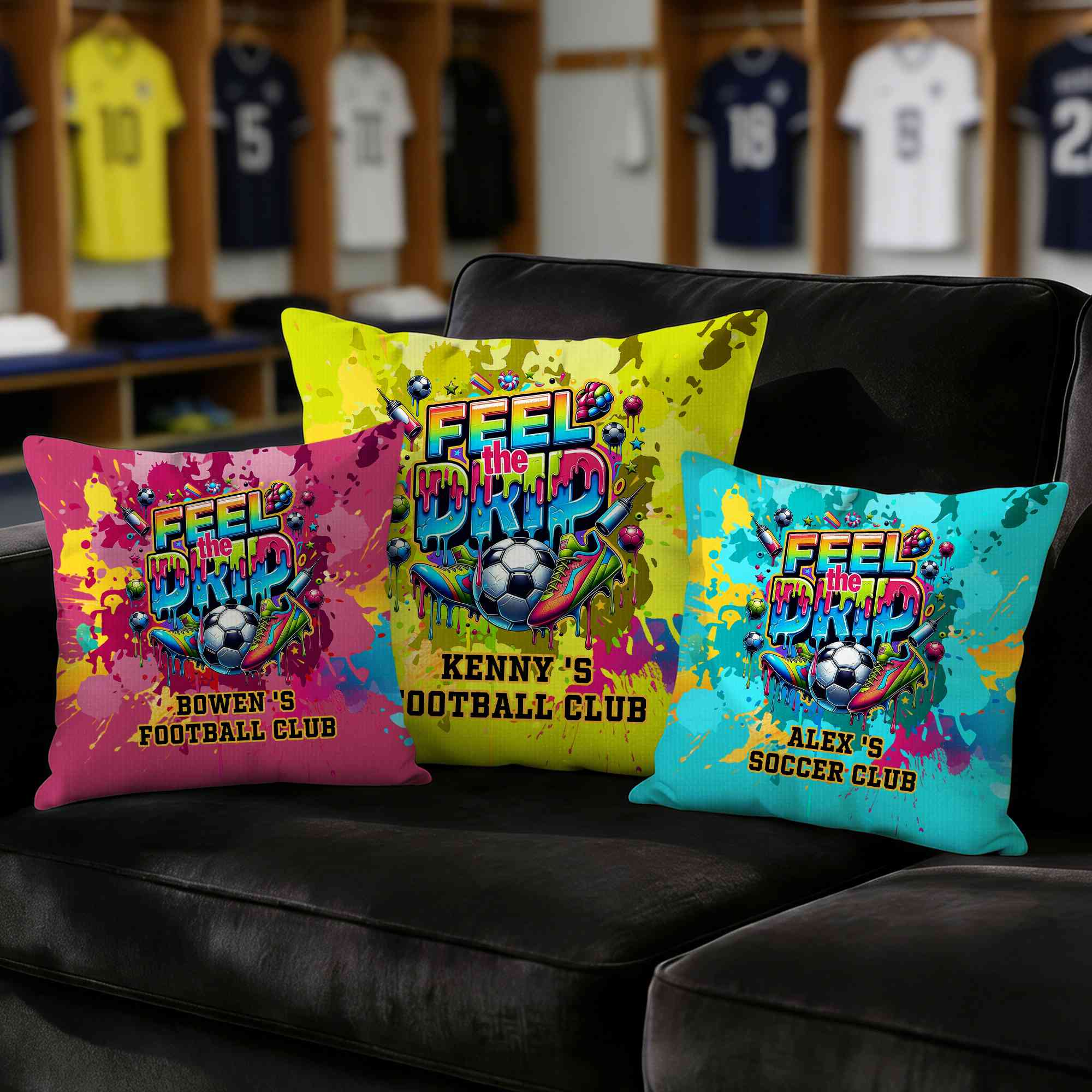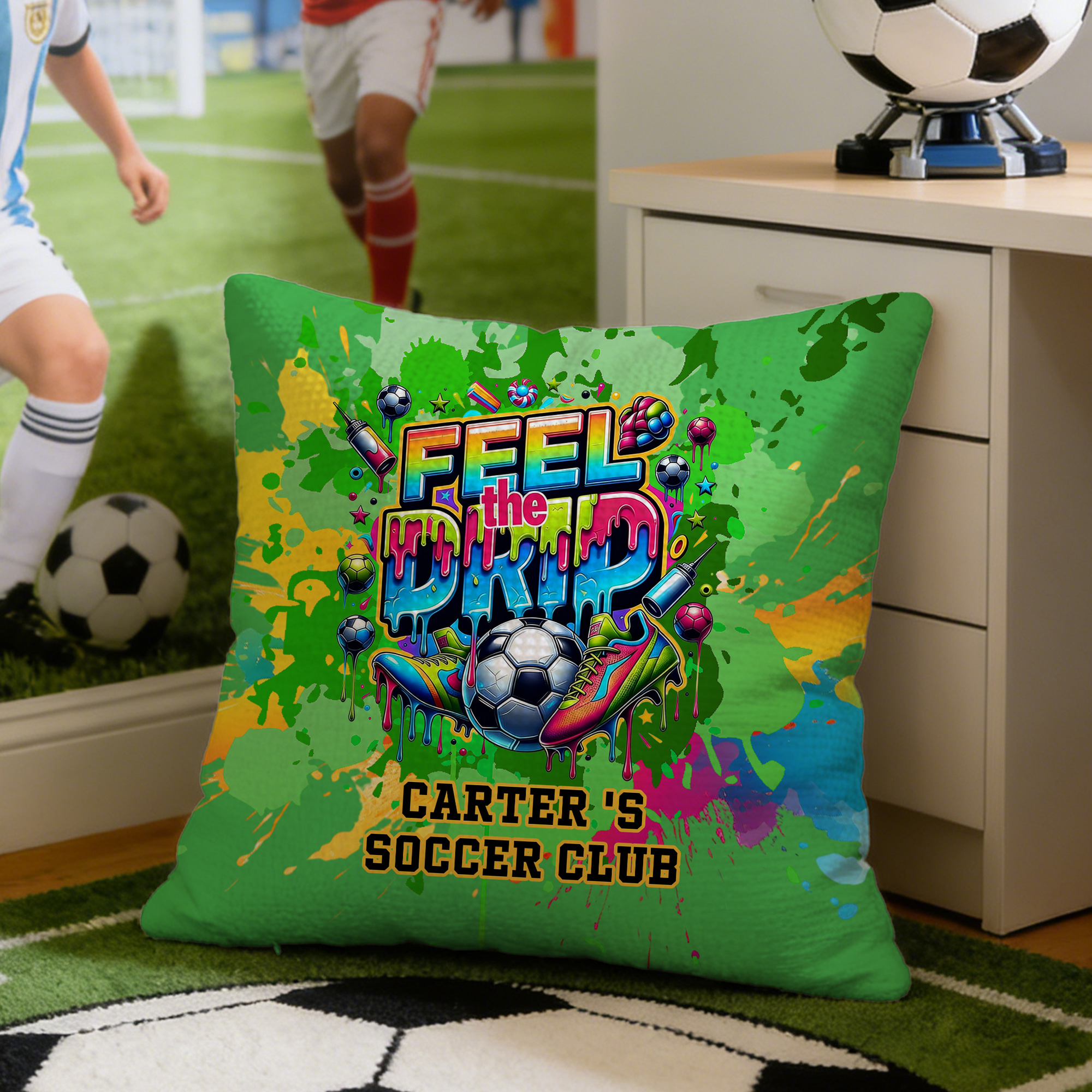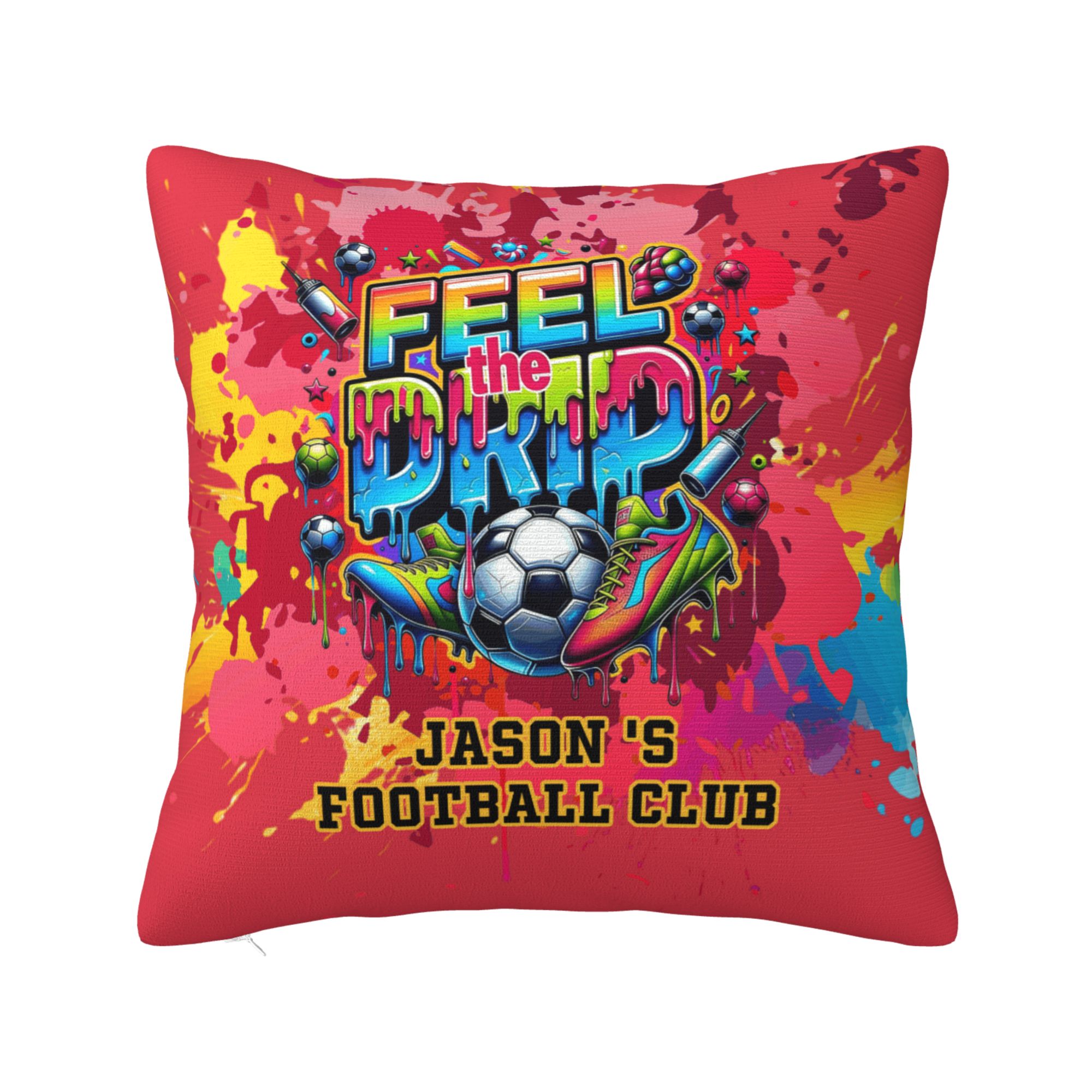 Bold Graffiti Soccer Style - This pillow cover features a vibrant “Feel the Drip” graffiti design blended with dynamic soccer elements, giving it an urban street-art vibe that stands out in any space. The football pattern and splash-style lettering reflect energy, passion, and love for the game.