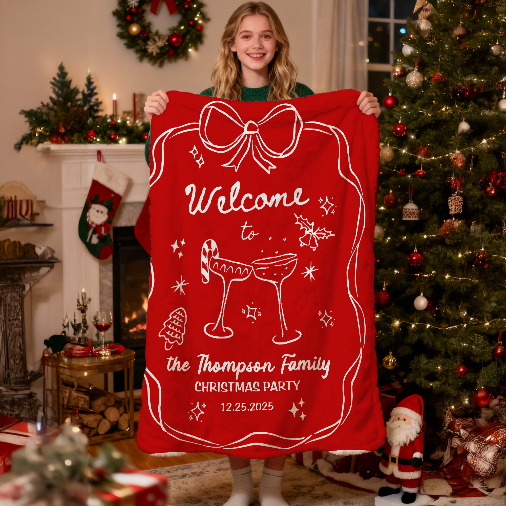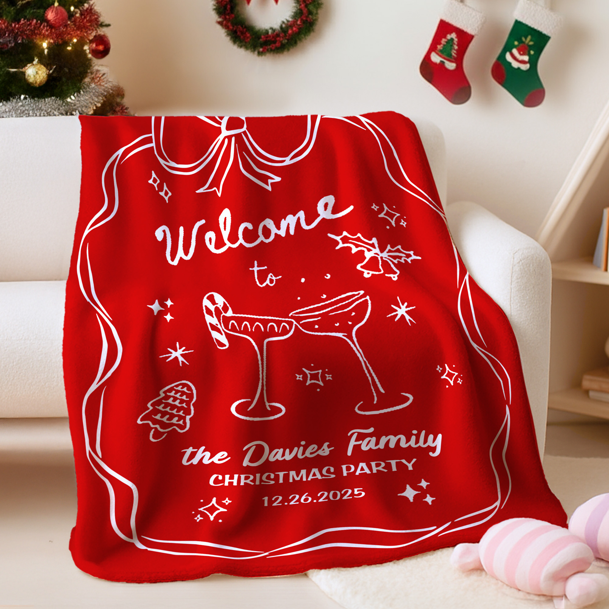 Custom Name Hand-Painted Family Party Christmas Blanket, Knot & Cocktail Glasses Design Flannel/Sherpa Bed Couch Throw, Christmas Gift for Family