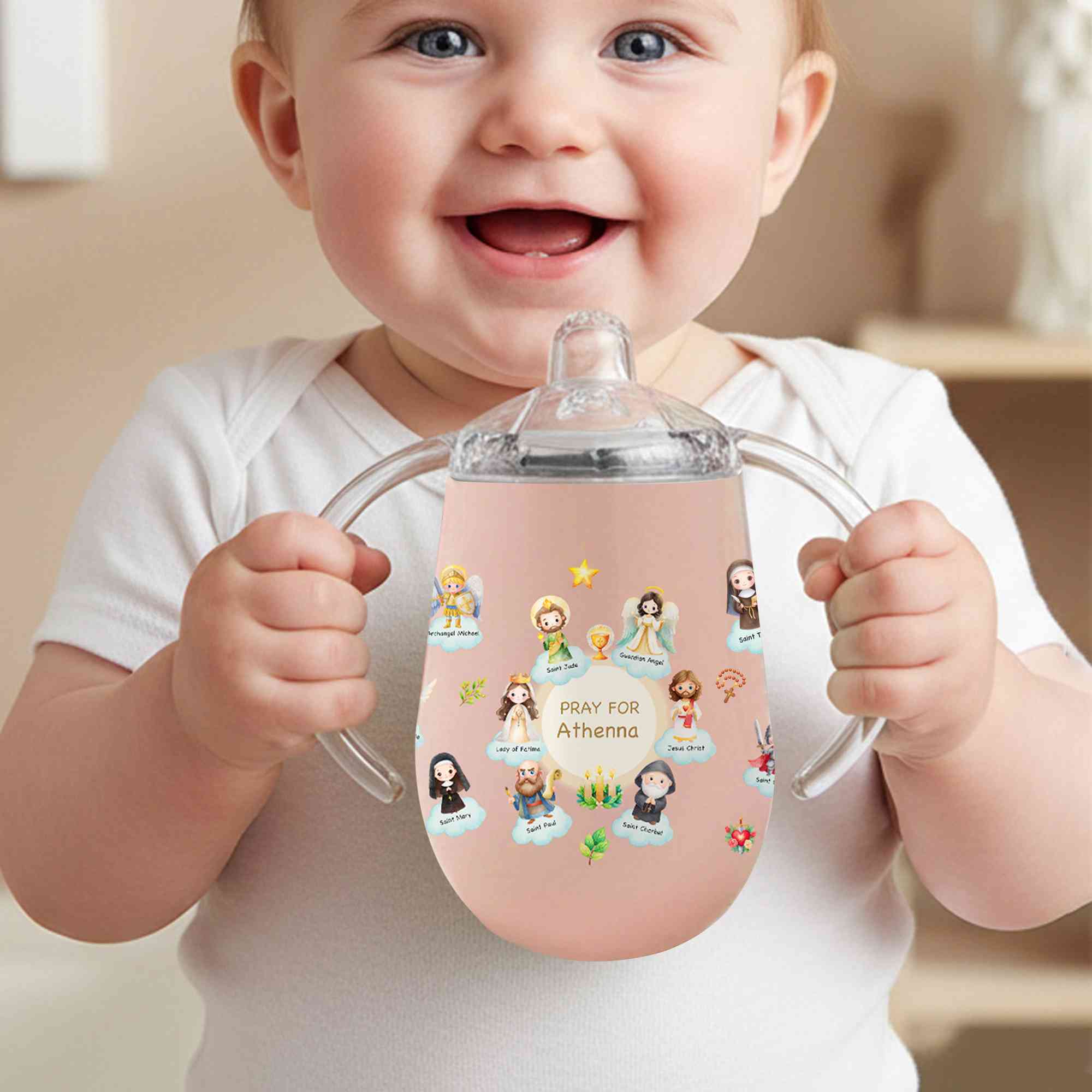 Faith-Inspired Design - This 10oz sippy cup features a sweet Holy Saints of Heaven theme with soft cartoon-style artwork. The egg-shaped body and easy-grip handles fit little hands comfortably, while the gentle religious imagery adds a meaningful touch that reflects love, guidance, and blessings.