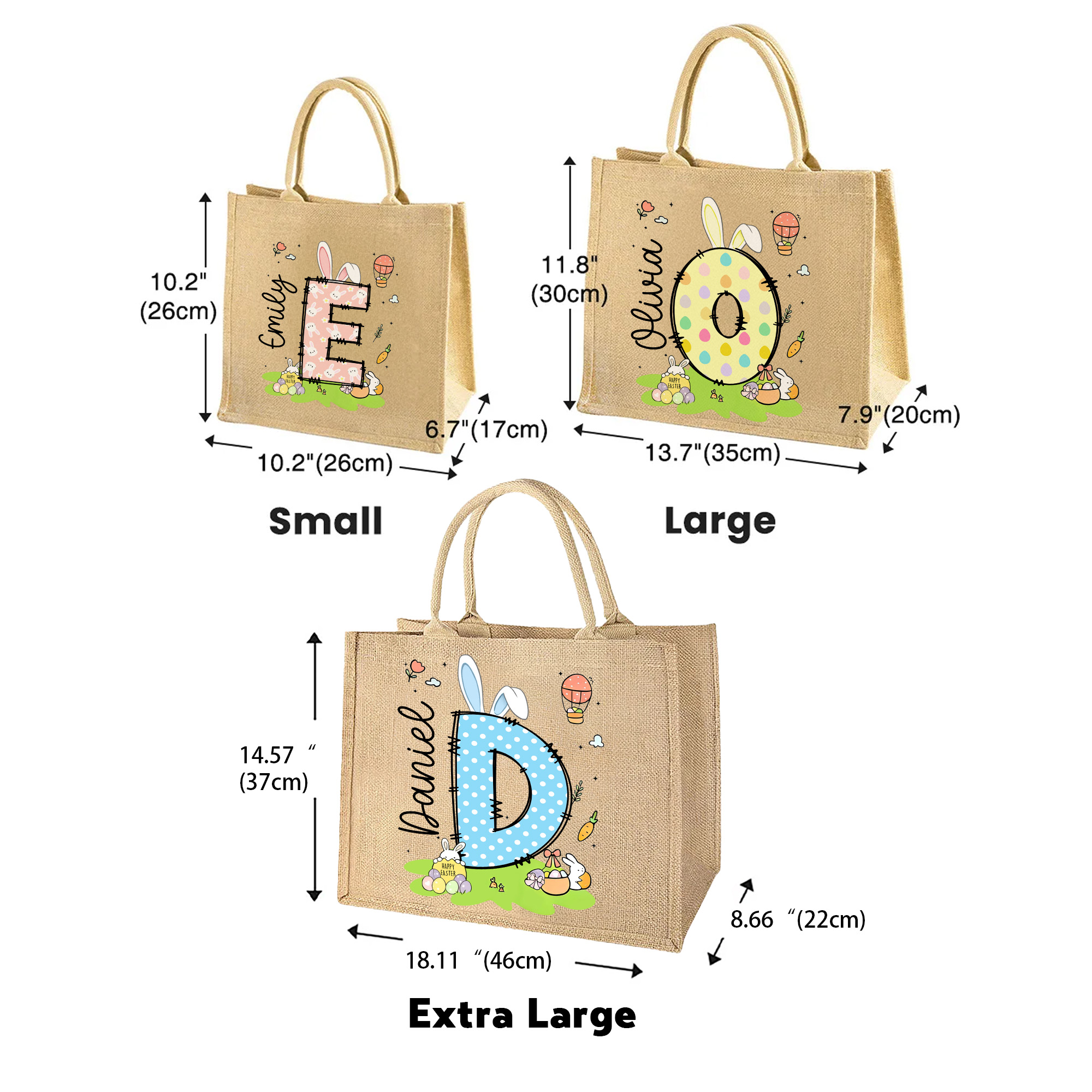 Custom Name Polka Dot Bunny Ears Alphabet Burlap Tote Bag, Large Capacity Jute Bag, Easter Egg Hunt Bag, Easter/Birthday Gift for Kids/Boys/Girls