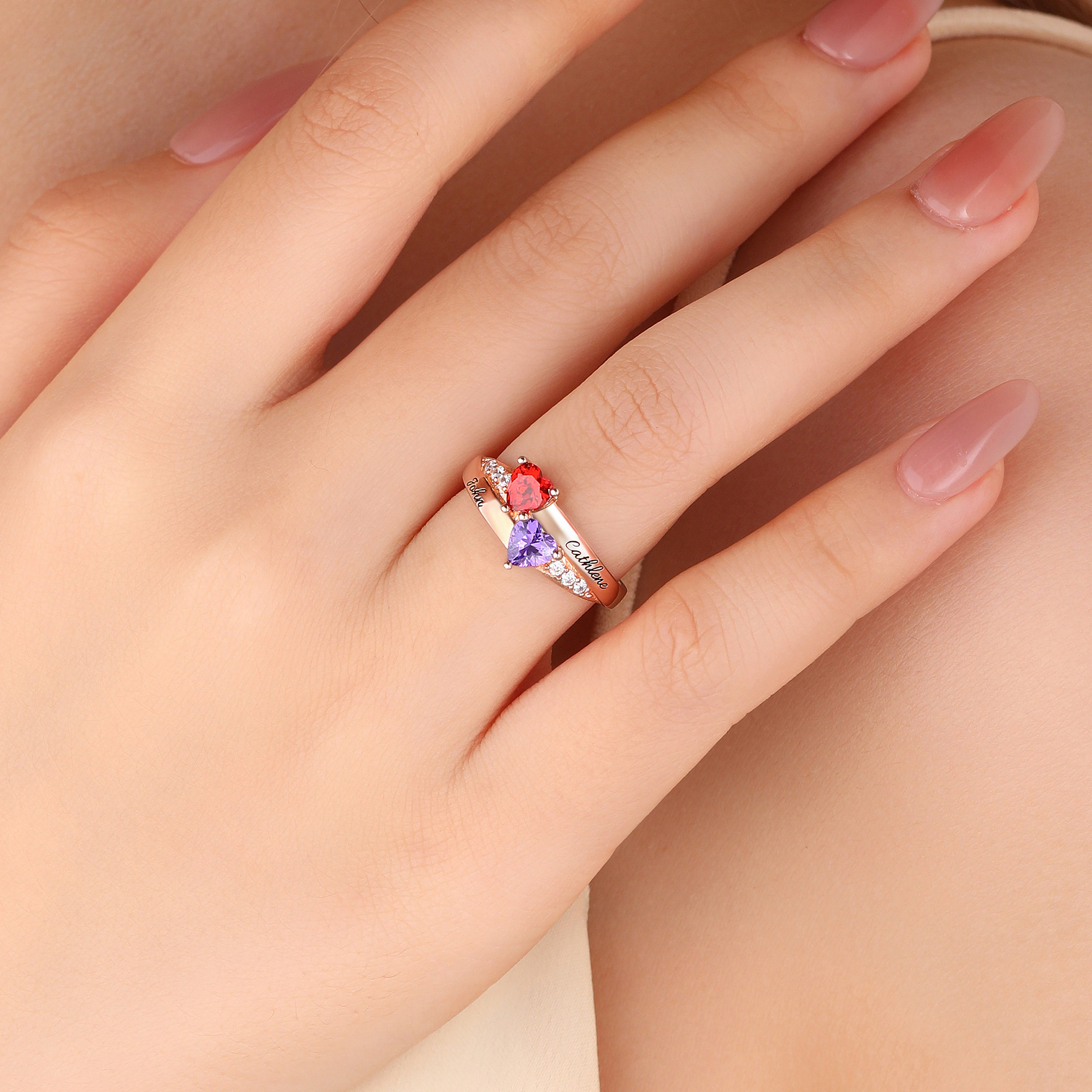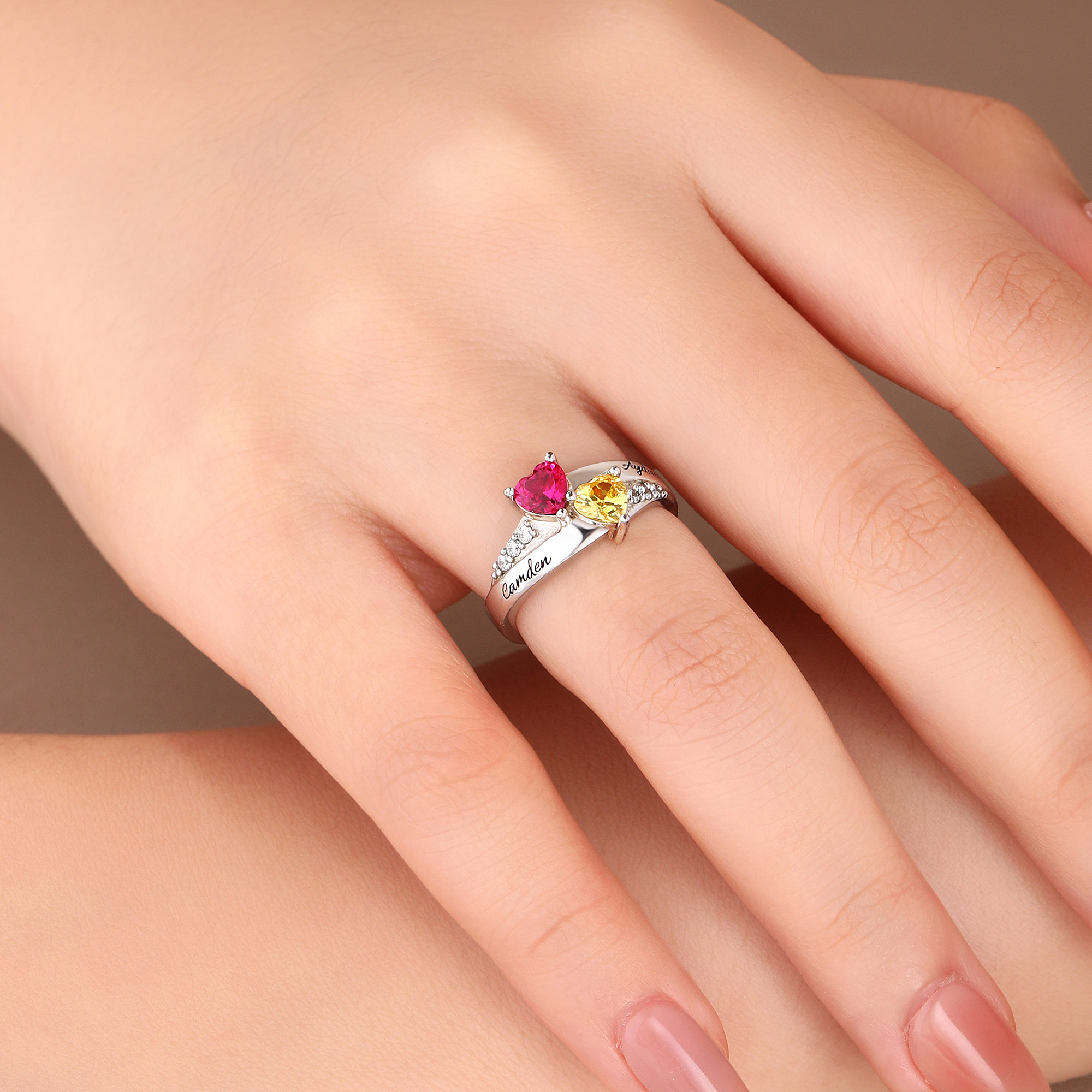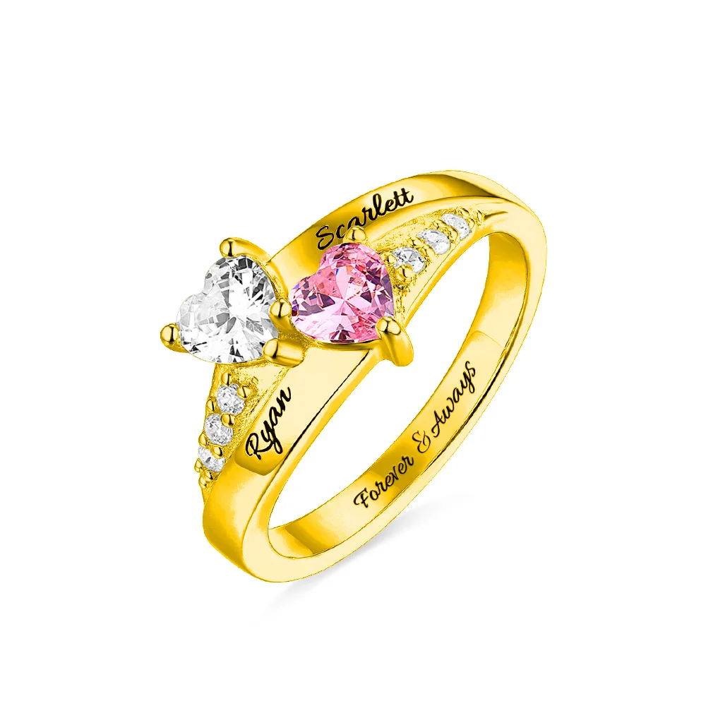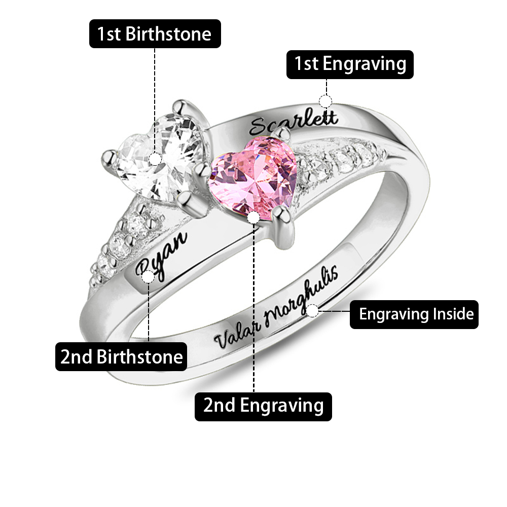 Double Heart Birthstone Design - Featuring two heart-cut birthstone customizable to match any birth month —this ring uses the classic heart shape to symbolize love, connection, and devotion. Each birthstone can be selected to correspond to the birth month of a child, partner, or family member, turning the ring into a wearable timeline of the people who matter most in your life.