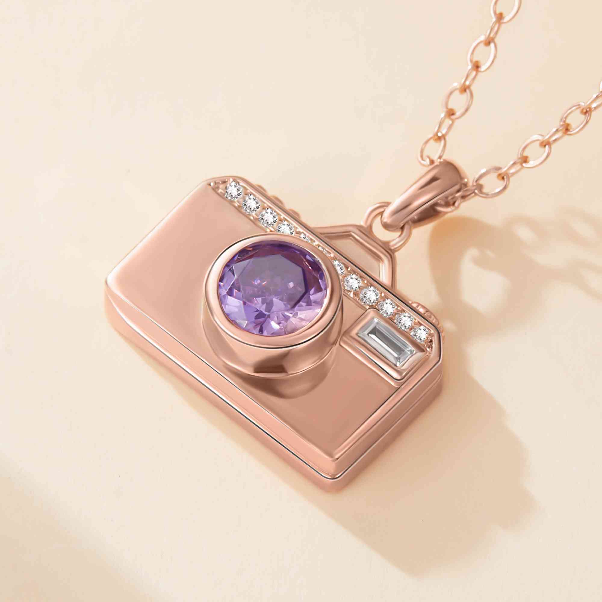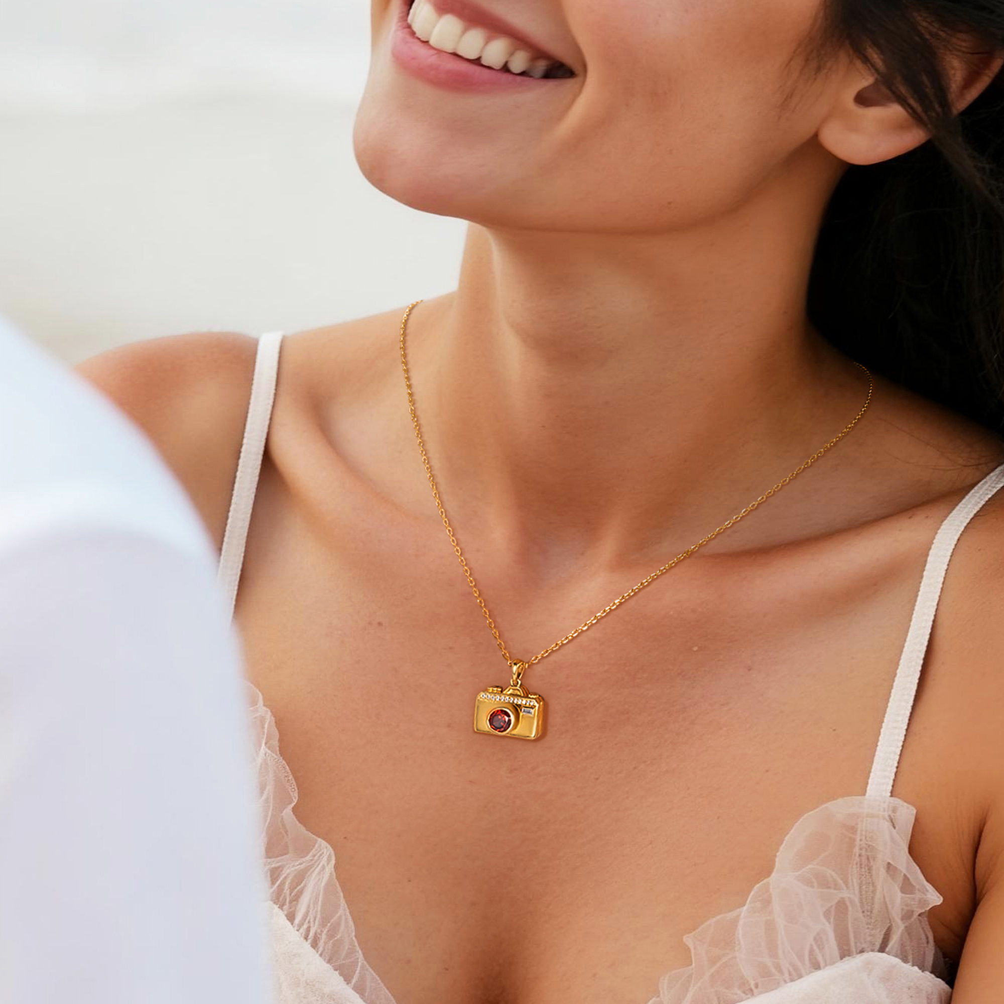 Vintage Camera Locket Design - This necklace features a charming vintage camera-shaped pendant, available in gold, rose gold, or silver finishes, with a birthstone (or custom gem) as the “lens” and tiny accent stones for detail. The retro camera style blends nostalgia with elegance, making it a standout accessory for anyone who loves photography or timeless jewelry.