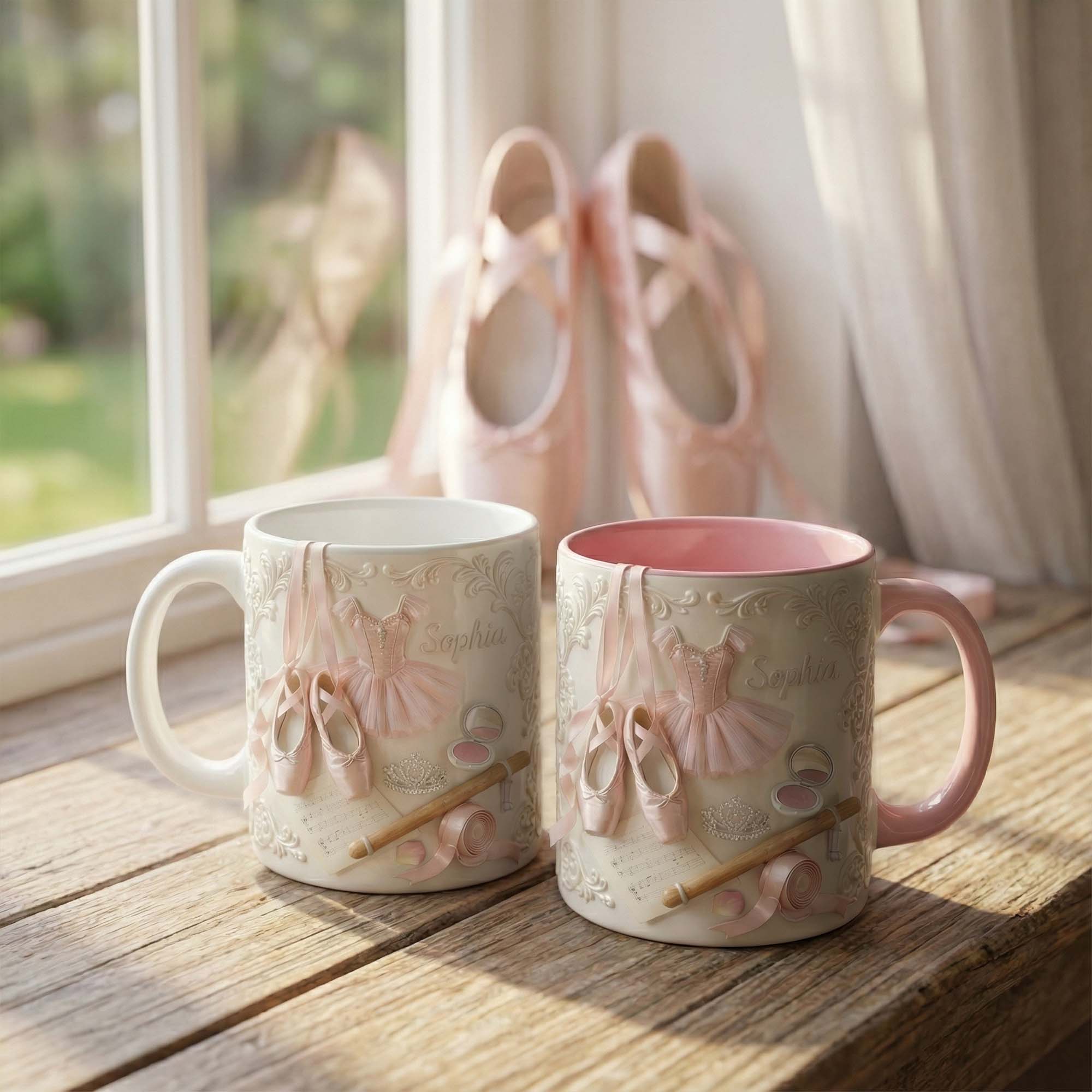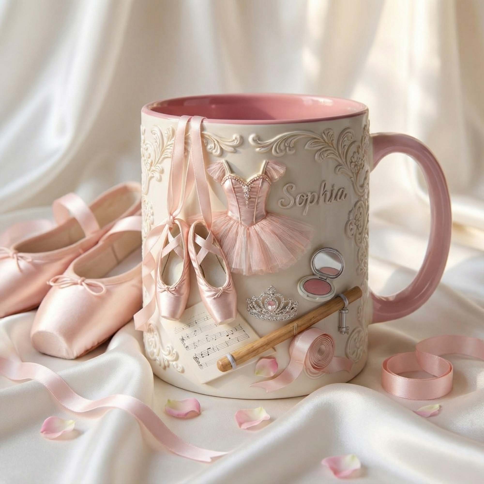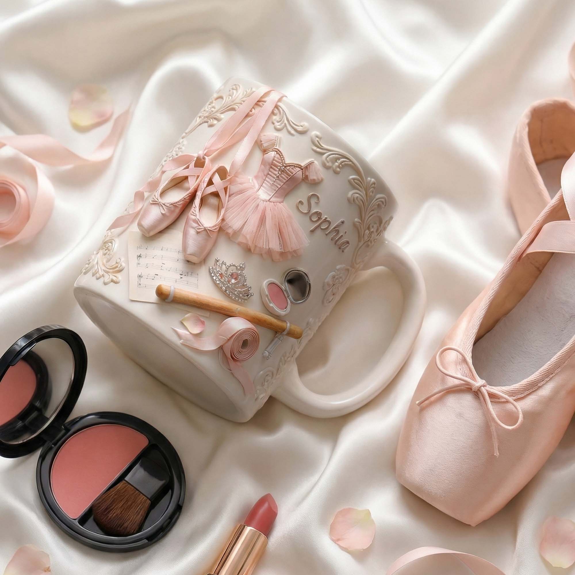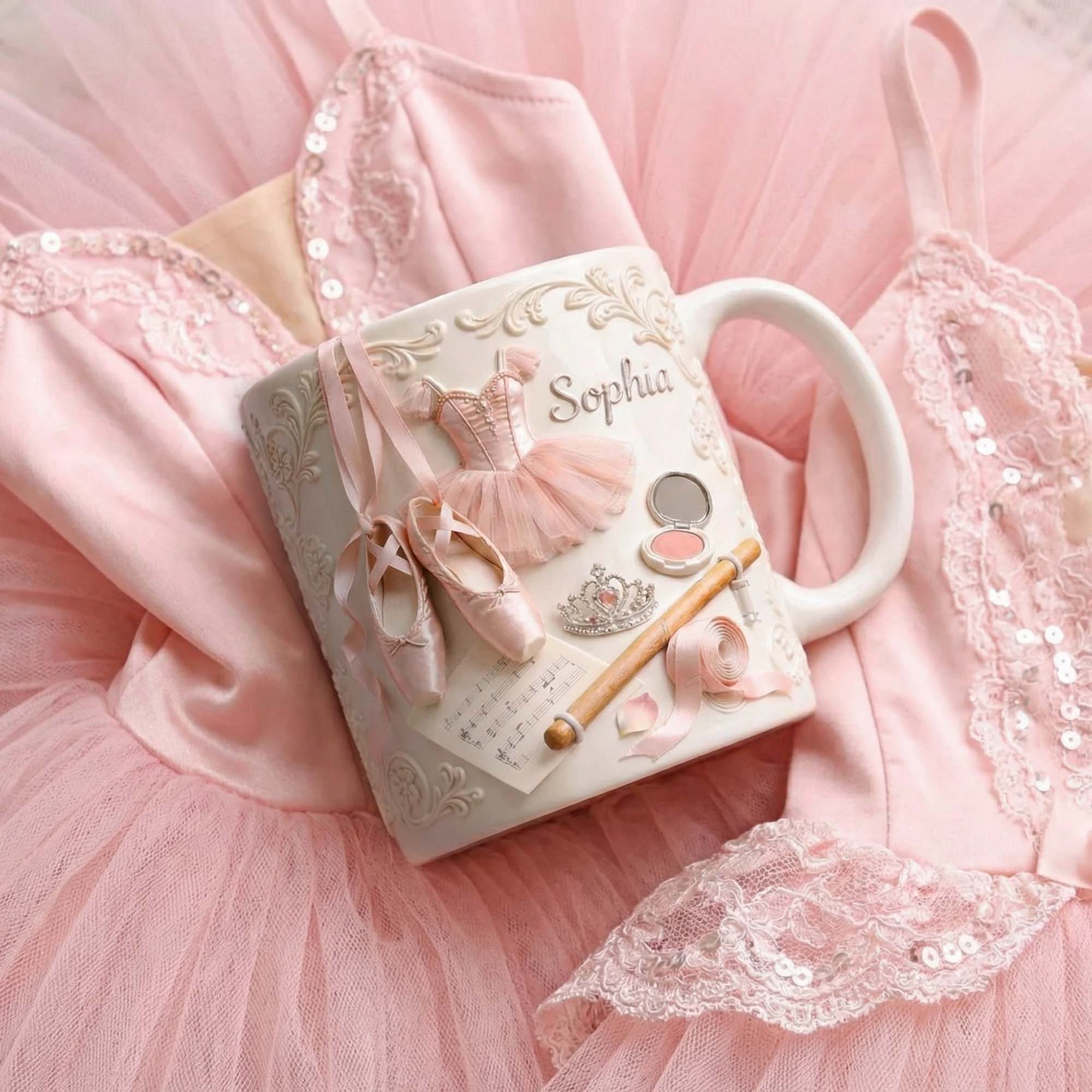 Ballet Tutu 3D Design – A ceramic mug features raised sculptural elements, including a layered tutu, pointe shoes with ribbons, a ballet hand mirror, and decorative hair accessories, all integrated into the body with precise depth and smooth transitions.