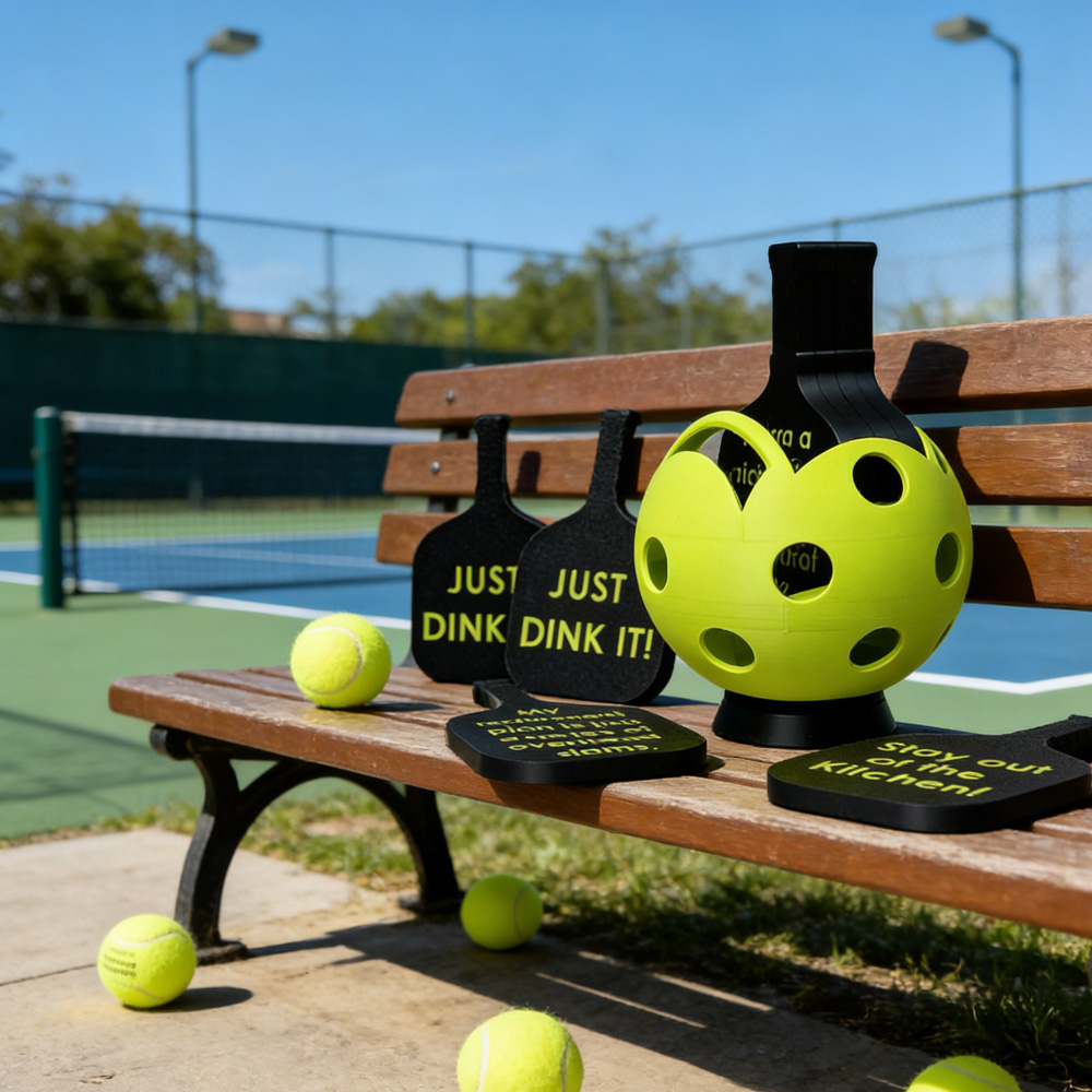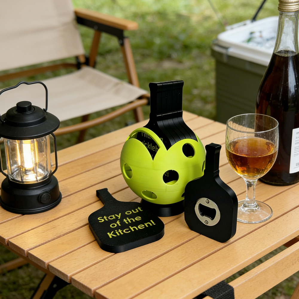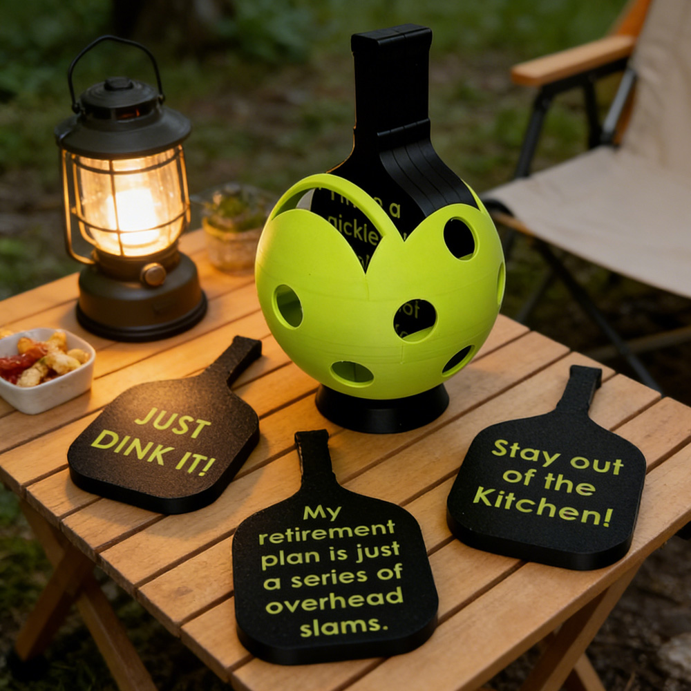 Playful Paddle-Shaped Coasters – Precision 3D-printed in matte material, each coaster mirrors the silhouette of a pickleball paddle with clean edges and subtle grip texture—designed to cradle mugs, cans, or glasses without slipping.