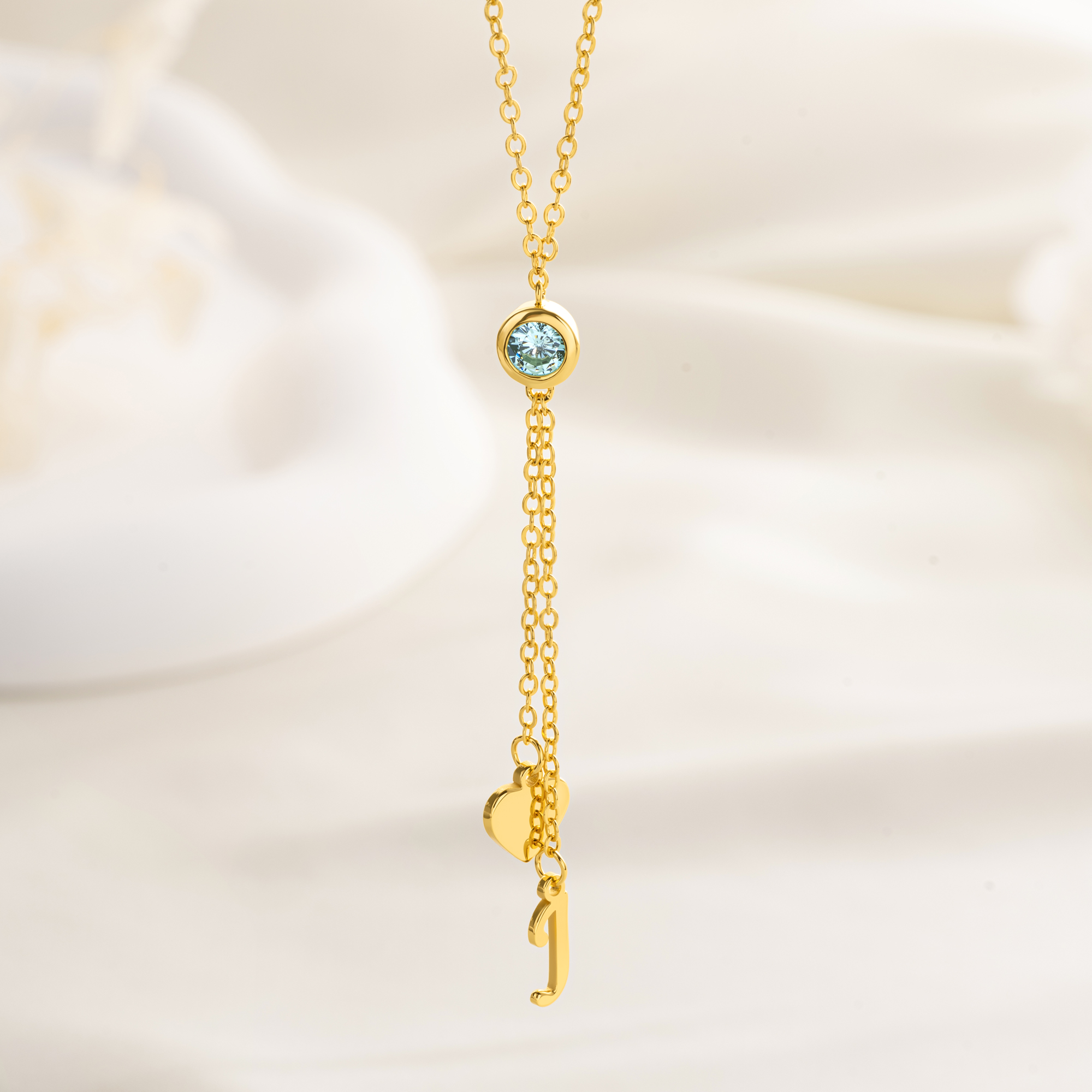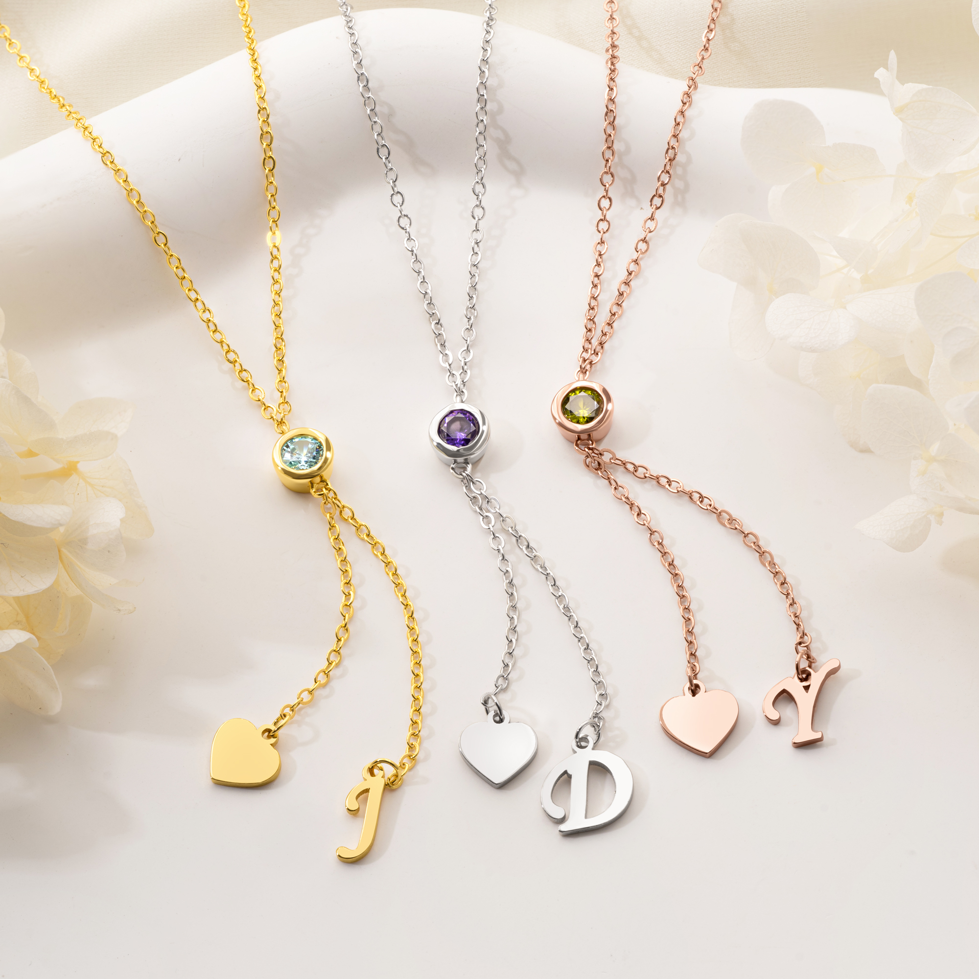 Heart Birthstone Design - This necklace features a sparkling birthstone pendant paired with a heart charm and a small initial. The soft curves and subtle shine create a timeless, dainty look that adds a personal touch to everyday style.