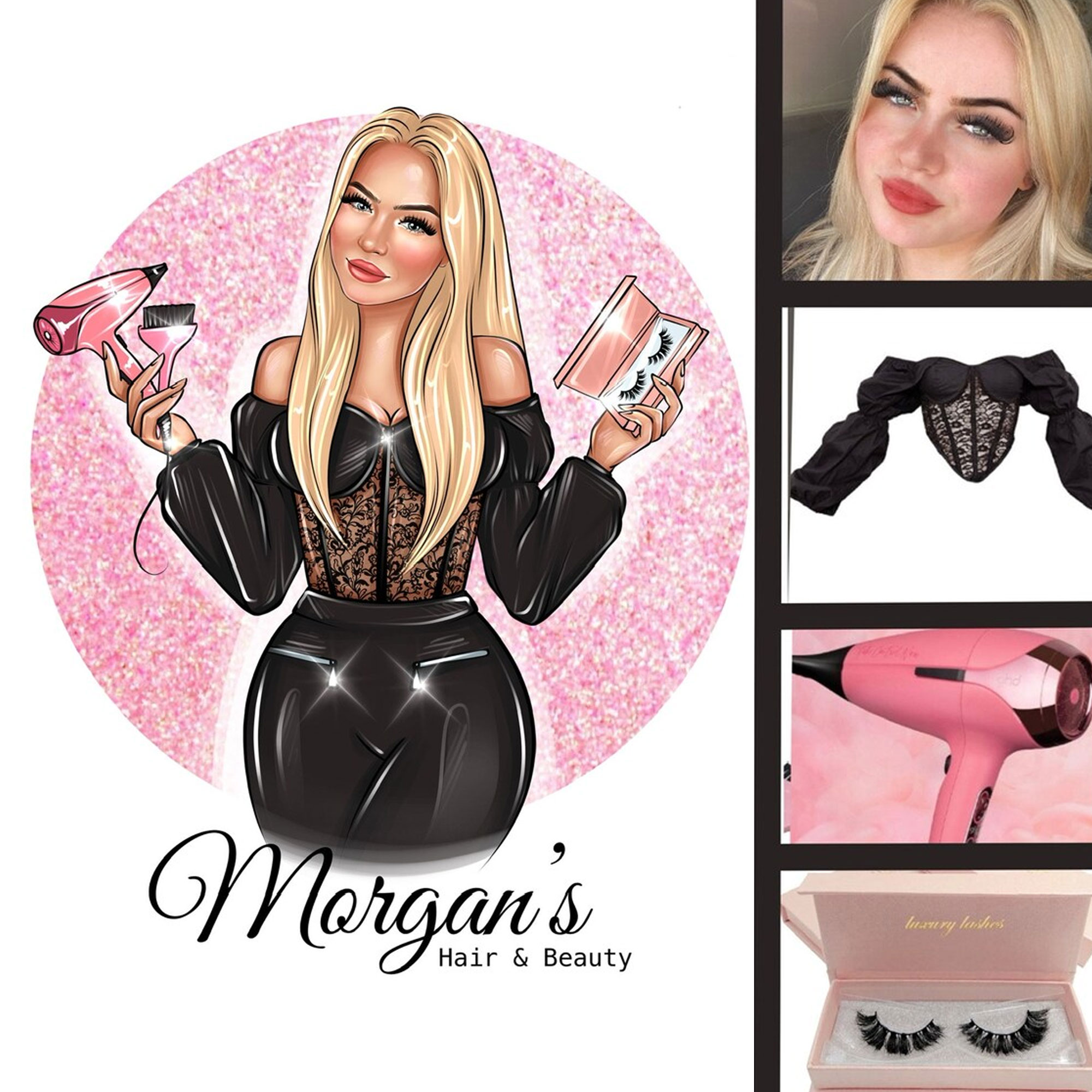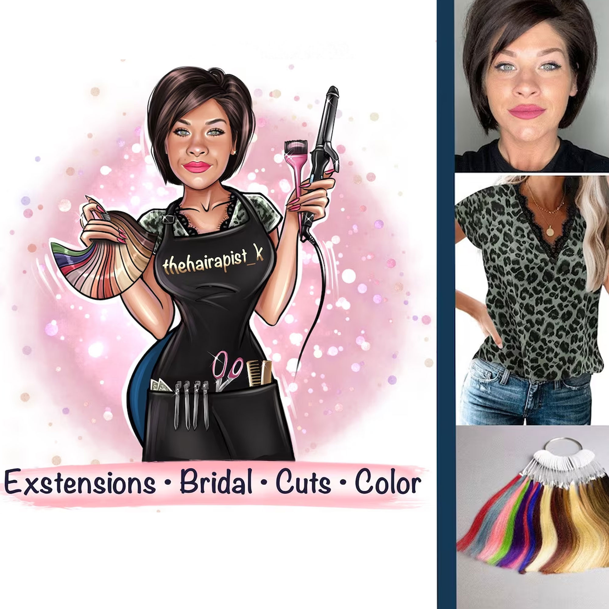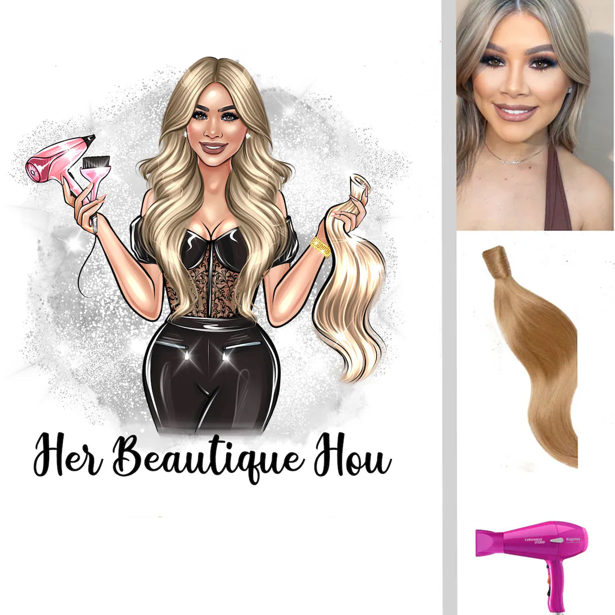 Professional Artwork – The final illustration includes your name in elegant script, a custom logo, and thematic props like a hairdryer or lashes. It’s designed to stand out on social media, business cards, or salon signage.