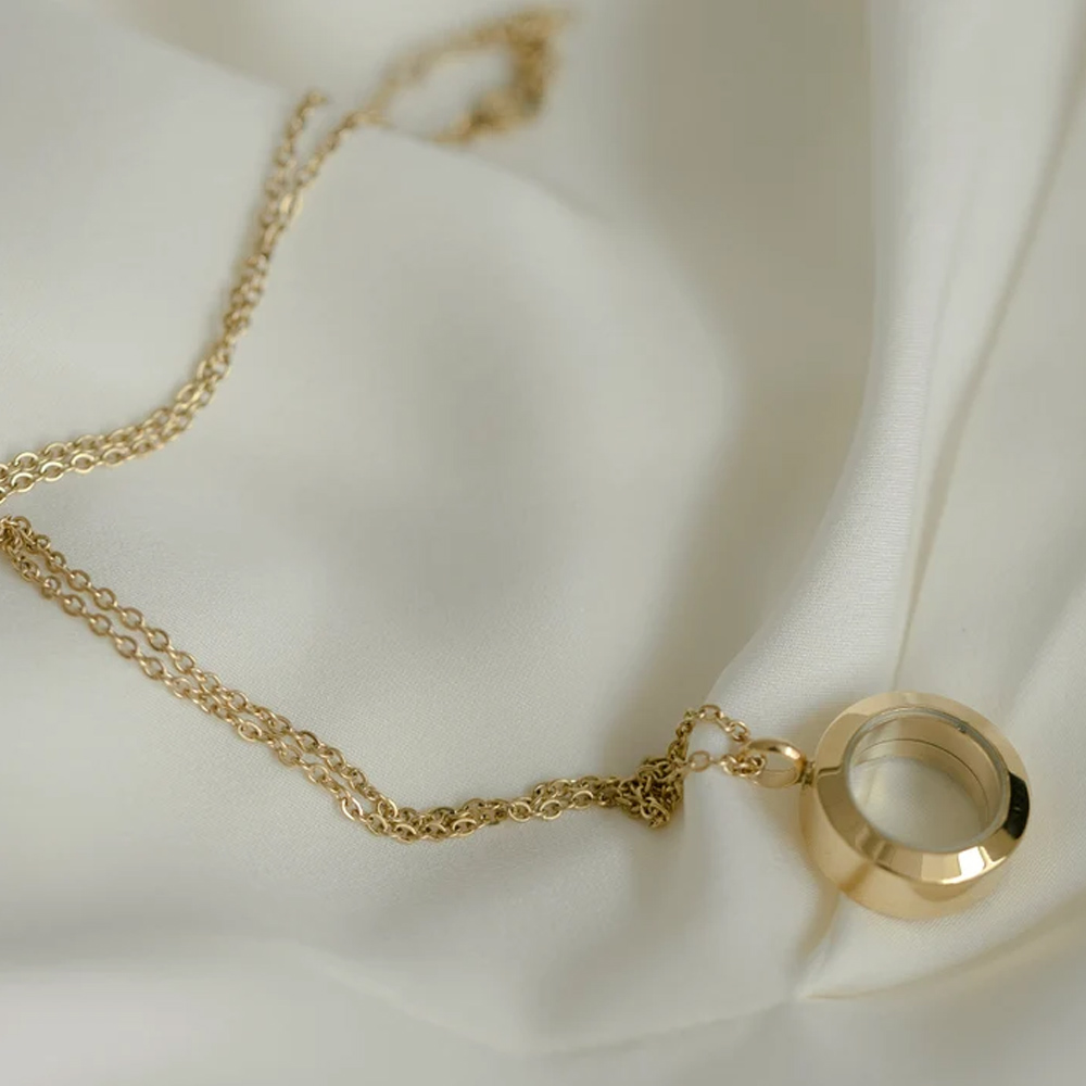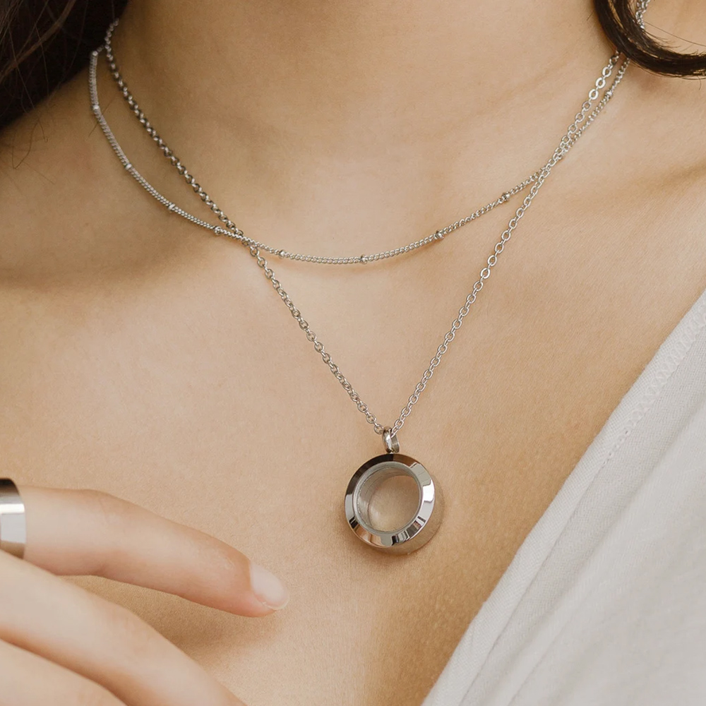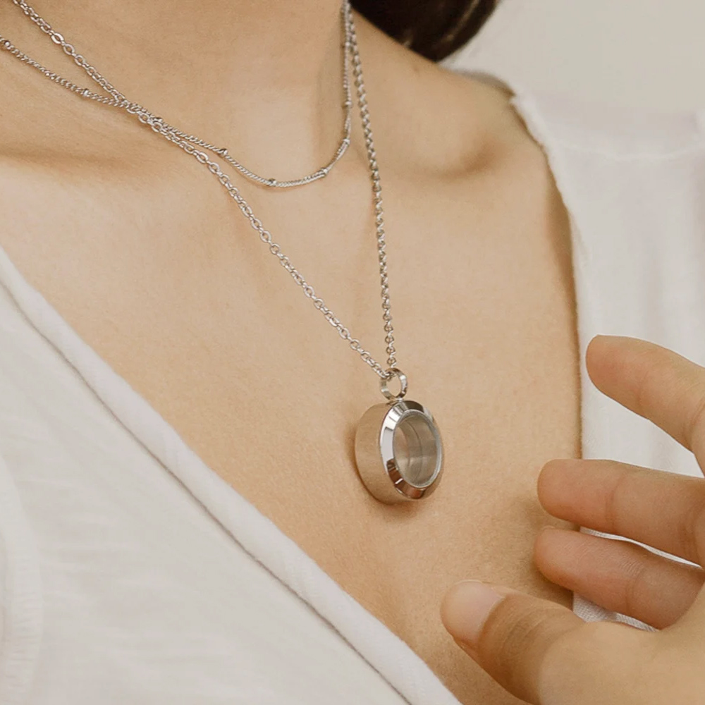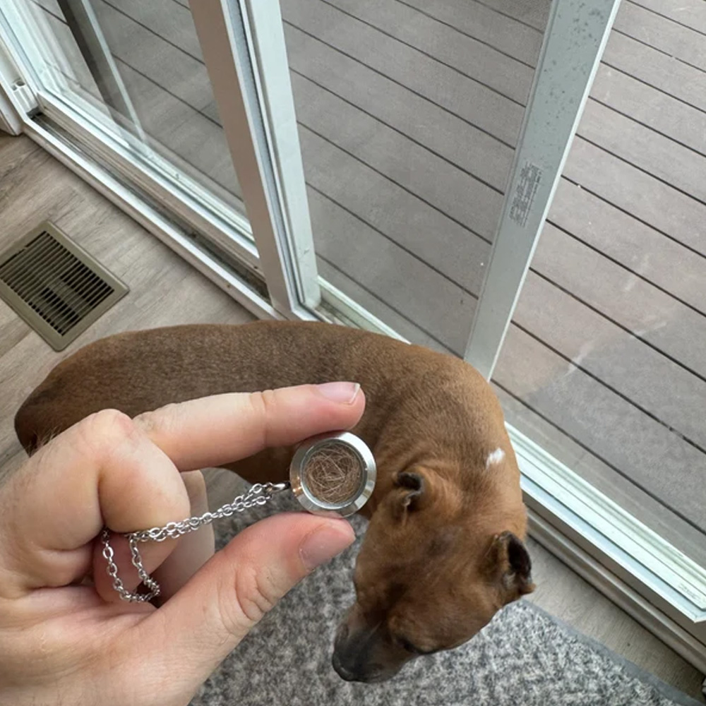 Personalized Memorial Locket – A sleek, circular pendant with a crystal-clear front capsule designed to hold a treasured trace of your pet—soft fur, a pinch of ashes, or a tiny lock of hair—sealed gently yet securely for lifelong preservation.