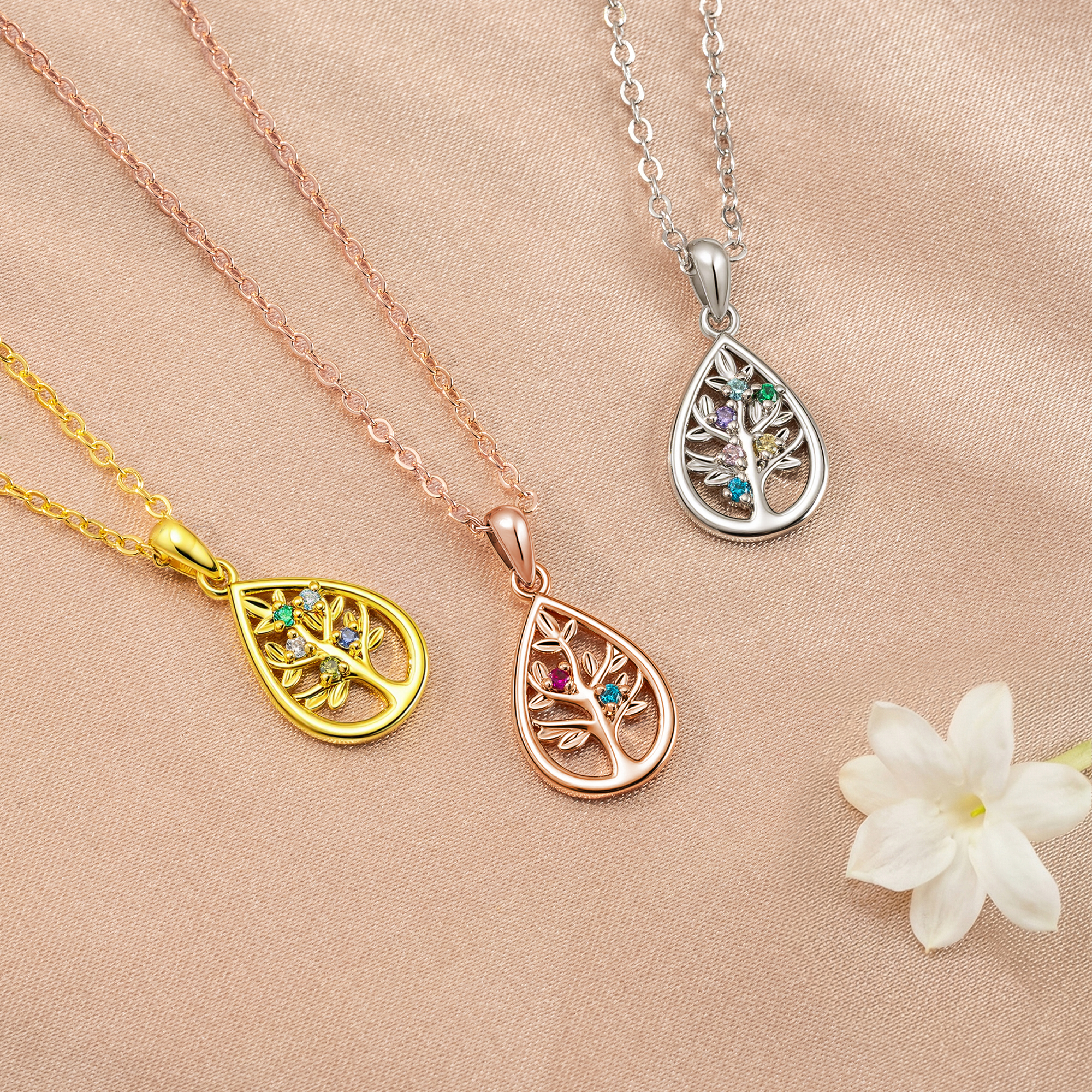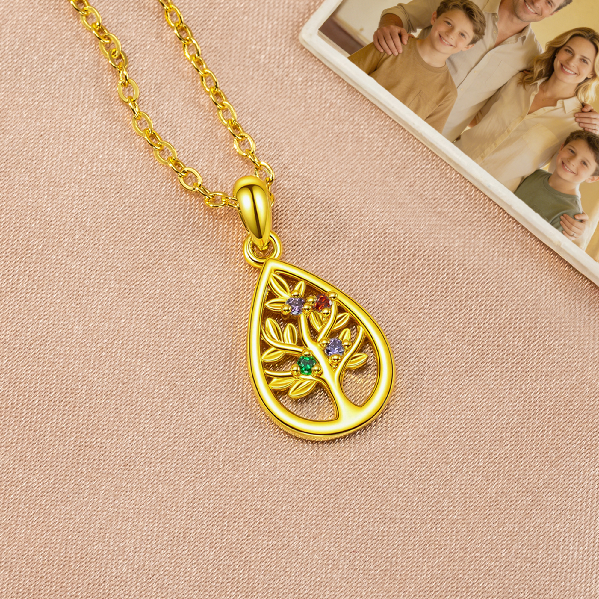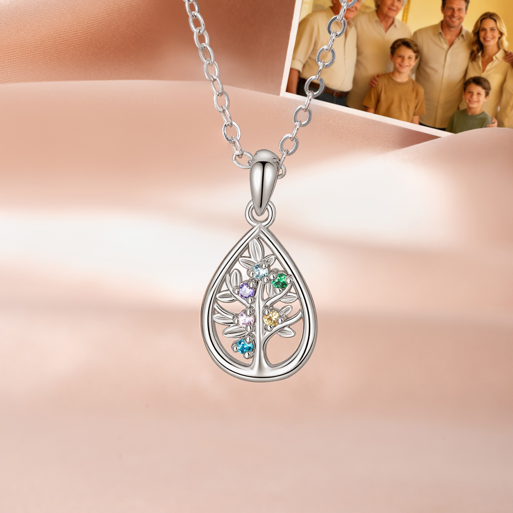 Family Tree Design - This necklace features a delicate tree of life design that symbolizes love, strength, and the deep bond between family members. Accented with sparkling birthstones, it carries a timeless and elegant style that is perfect for everyday wear or special occasions.