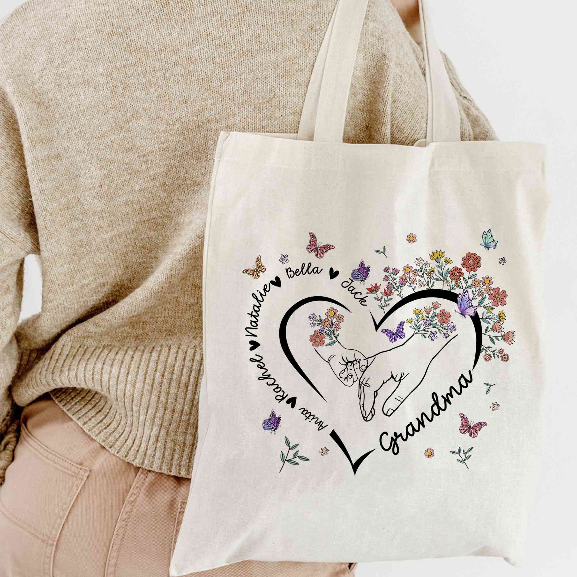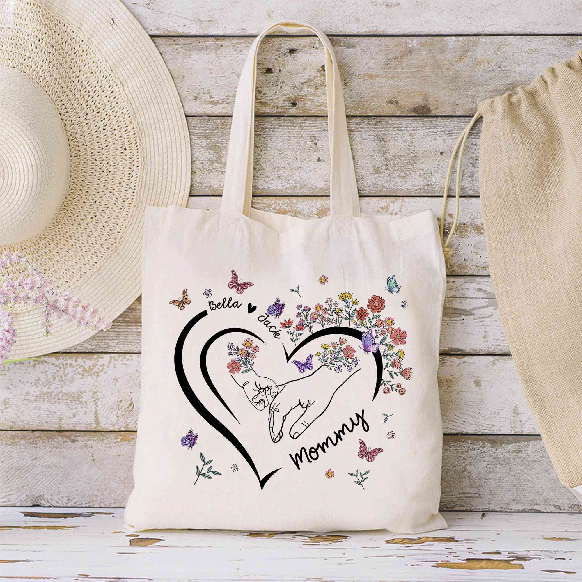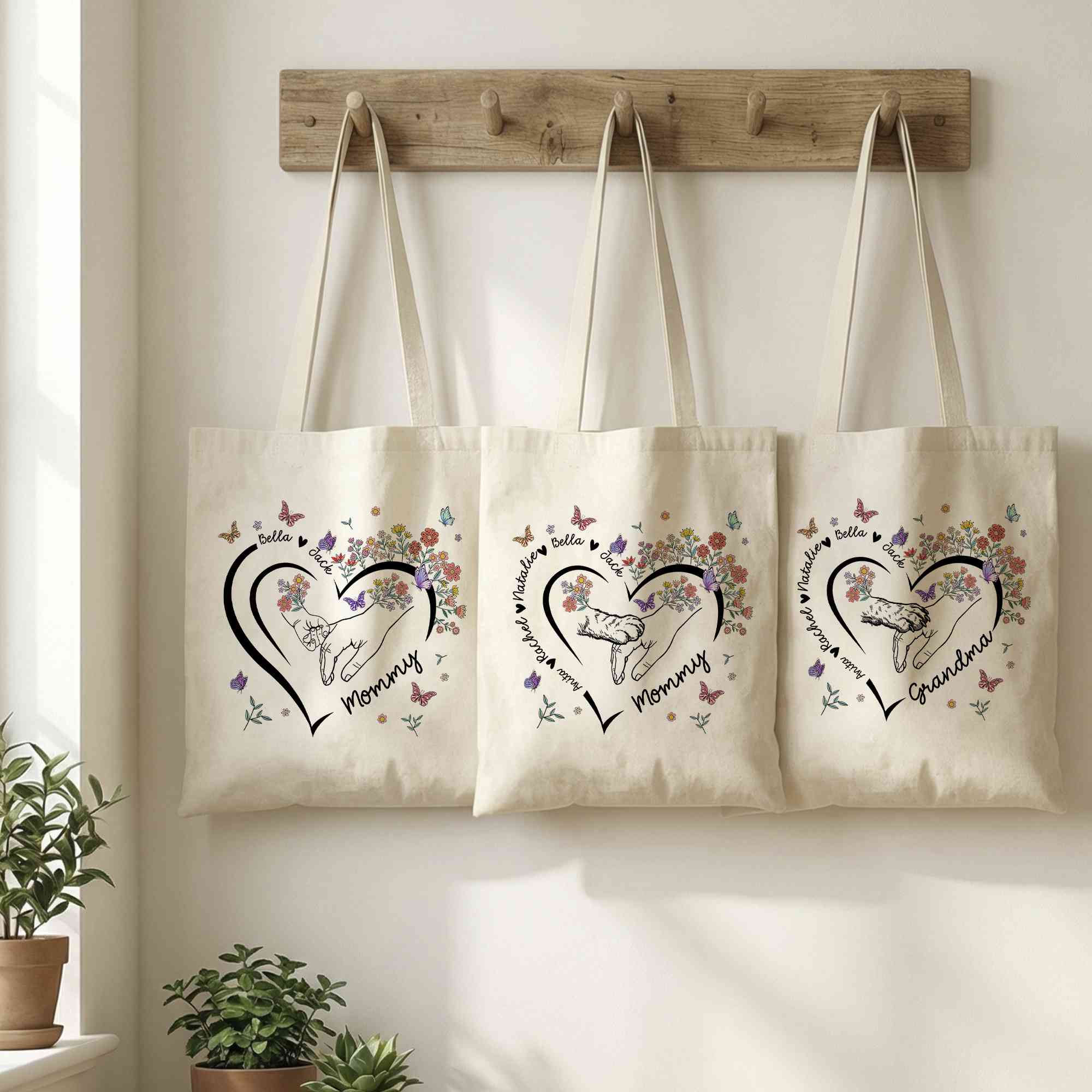 | Style | Personalized Floral Handprint Love Heart Tote Bag with Names |