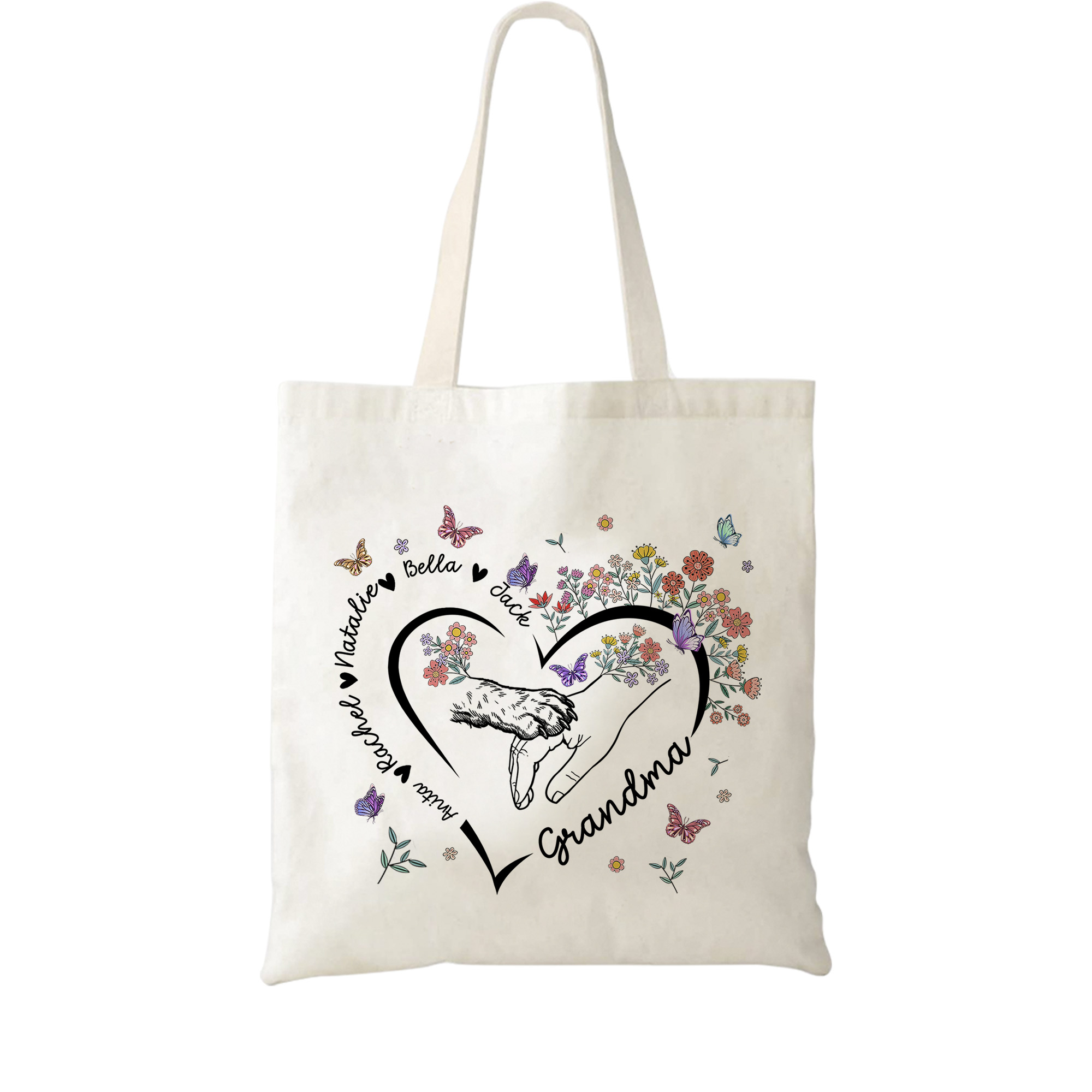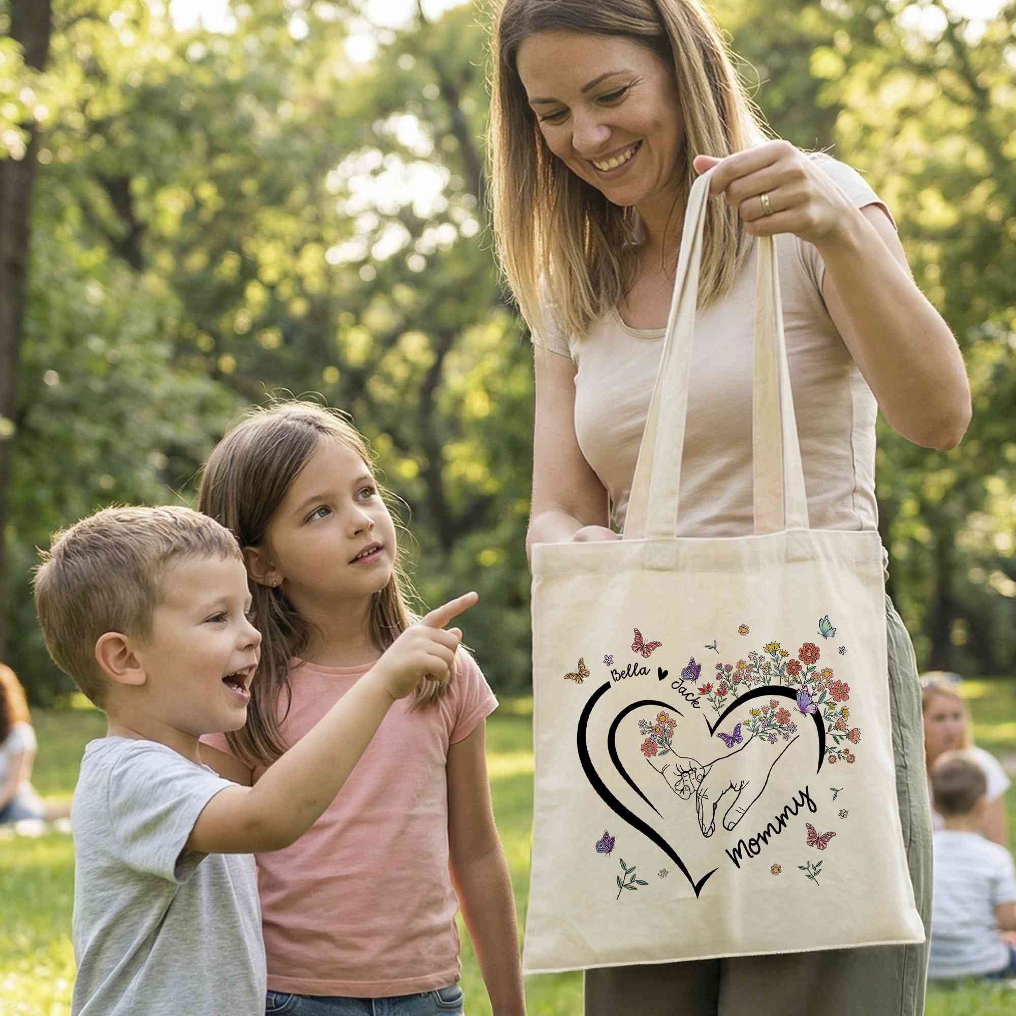 Tender Handprint Art – This tote features a beautifully illustrated heart formed by two interlocking hands, blooming with colorful flowers and fluttering butterflies. The design evokes warmth, connection, and timeless love.