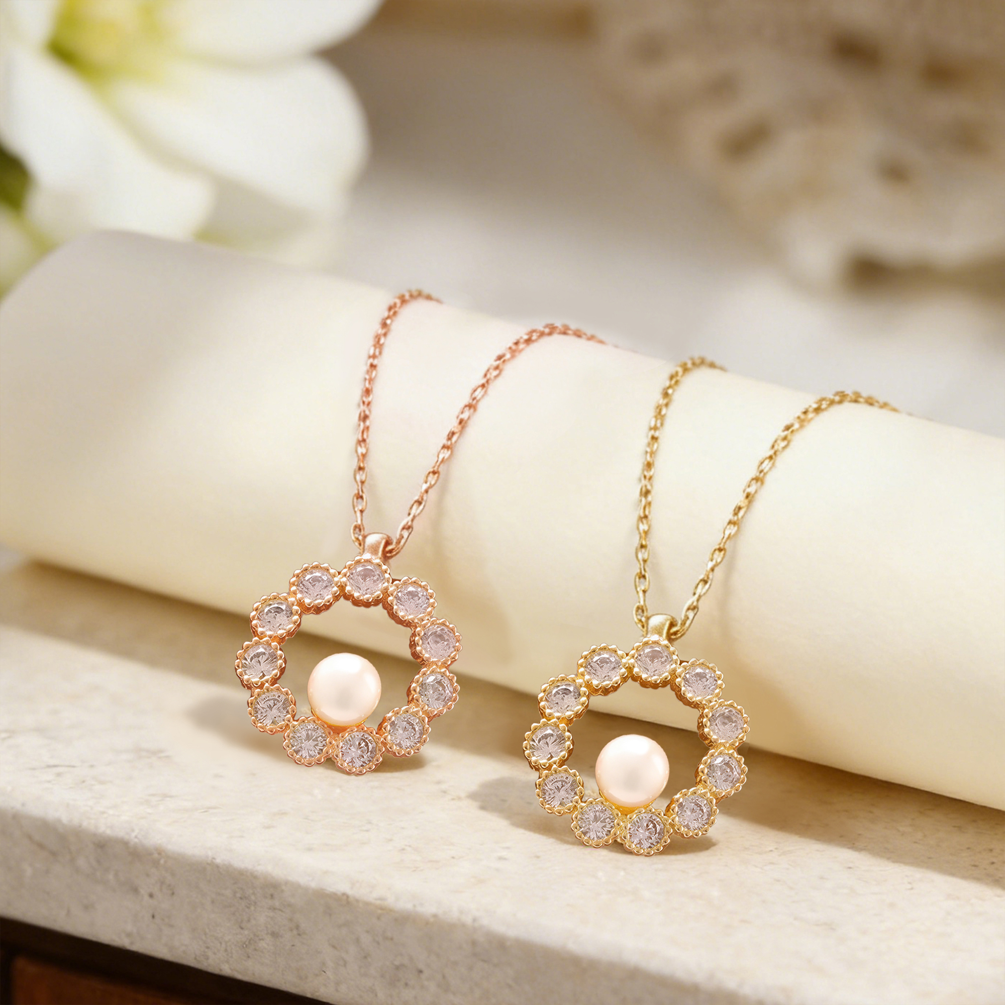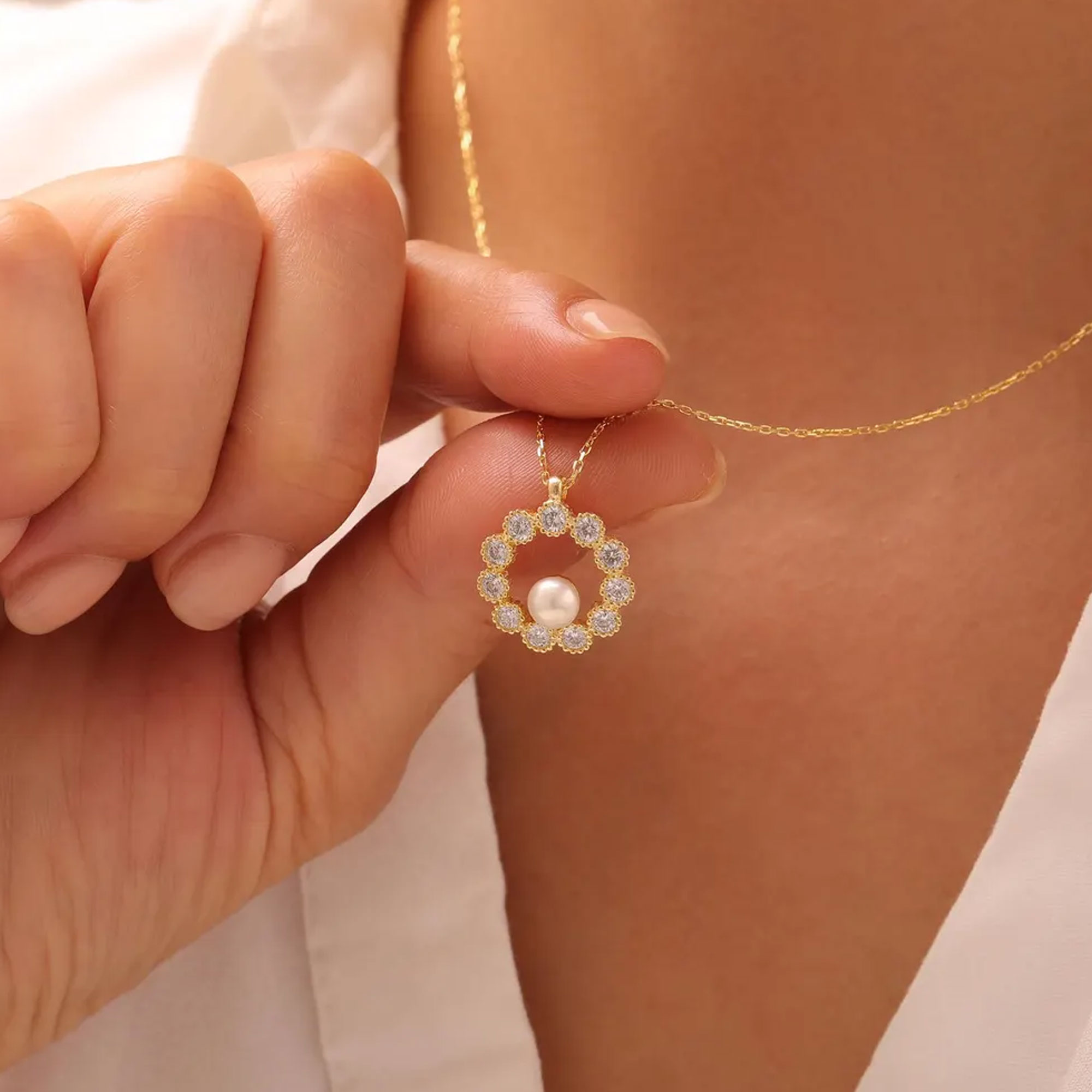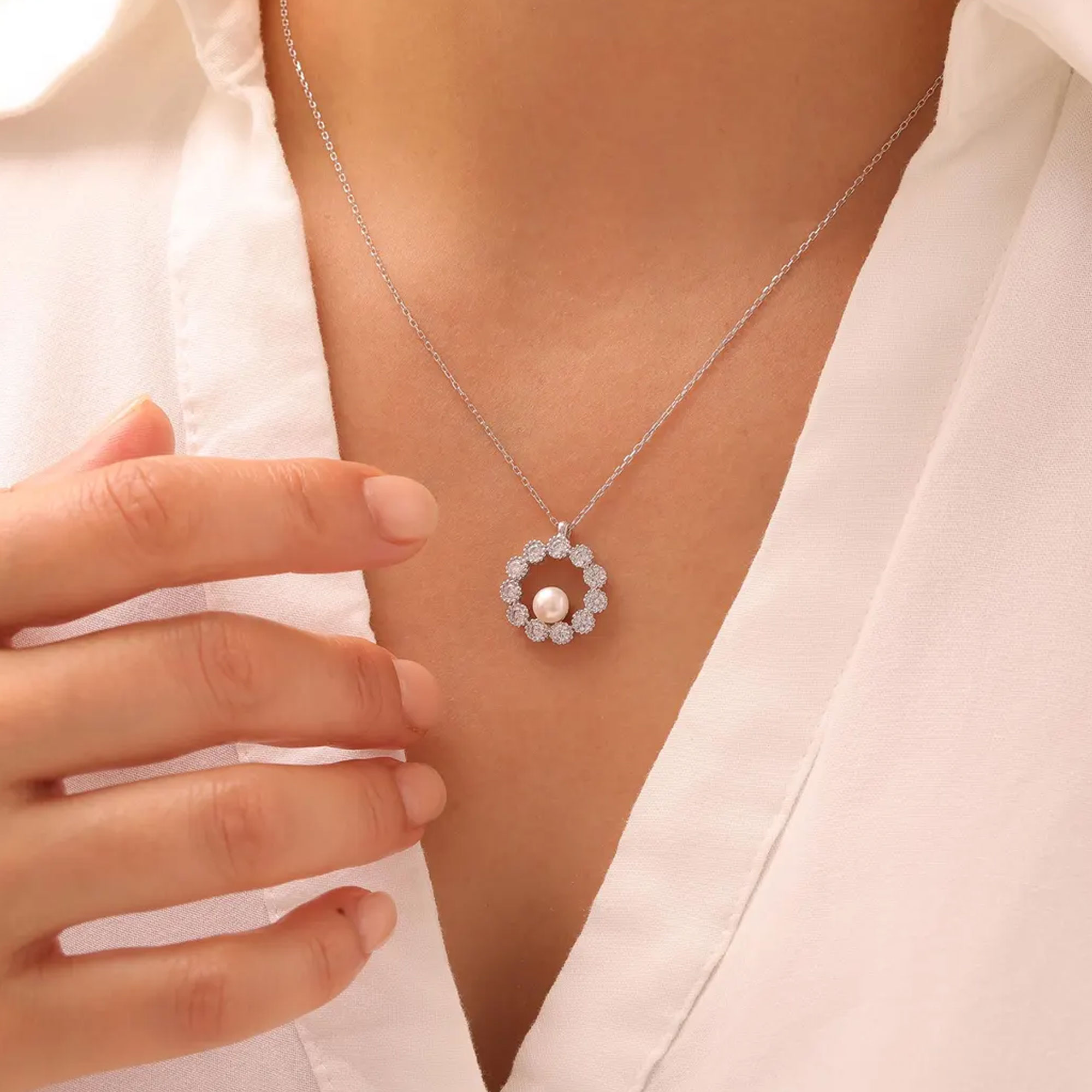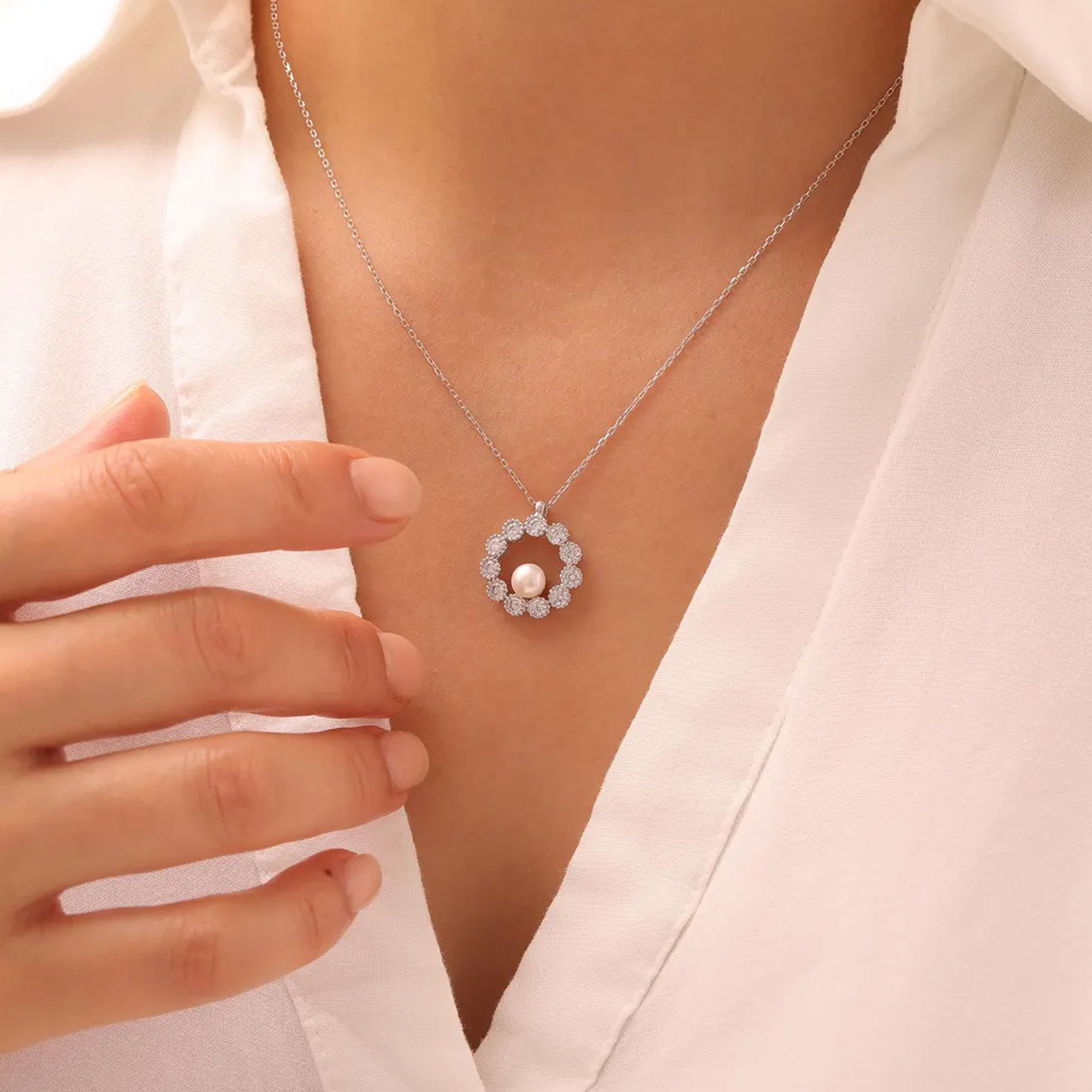 Timeless Circle Design – A luminous freshwater pearl rests at the heart of a delicate circle adorned with sparkling cubic zirconia, creating a perfect balance of classic elegance and modern charm. The pendant’s harmonious shape symbolizes unity and everlasting affection.