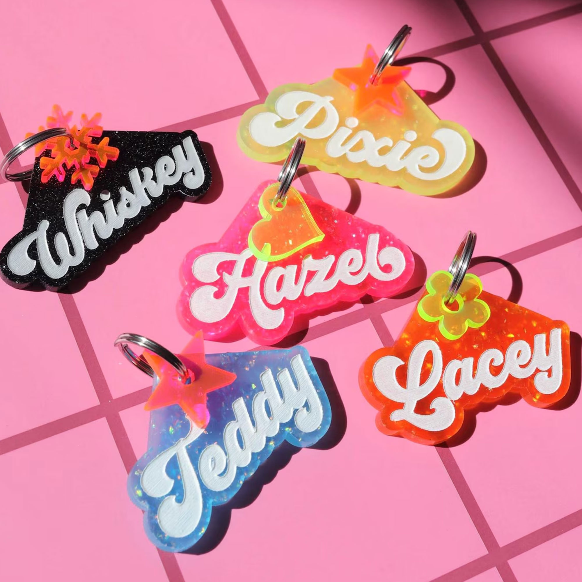 Customizable Design - Create a unique pet tag with your pet's name on the front and the option to add custom text on the backside. Choose from vibrant colors and glitter finishes for a fun, retro look.