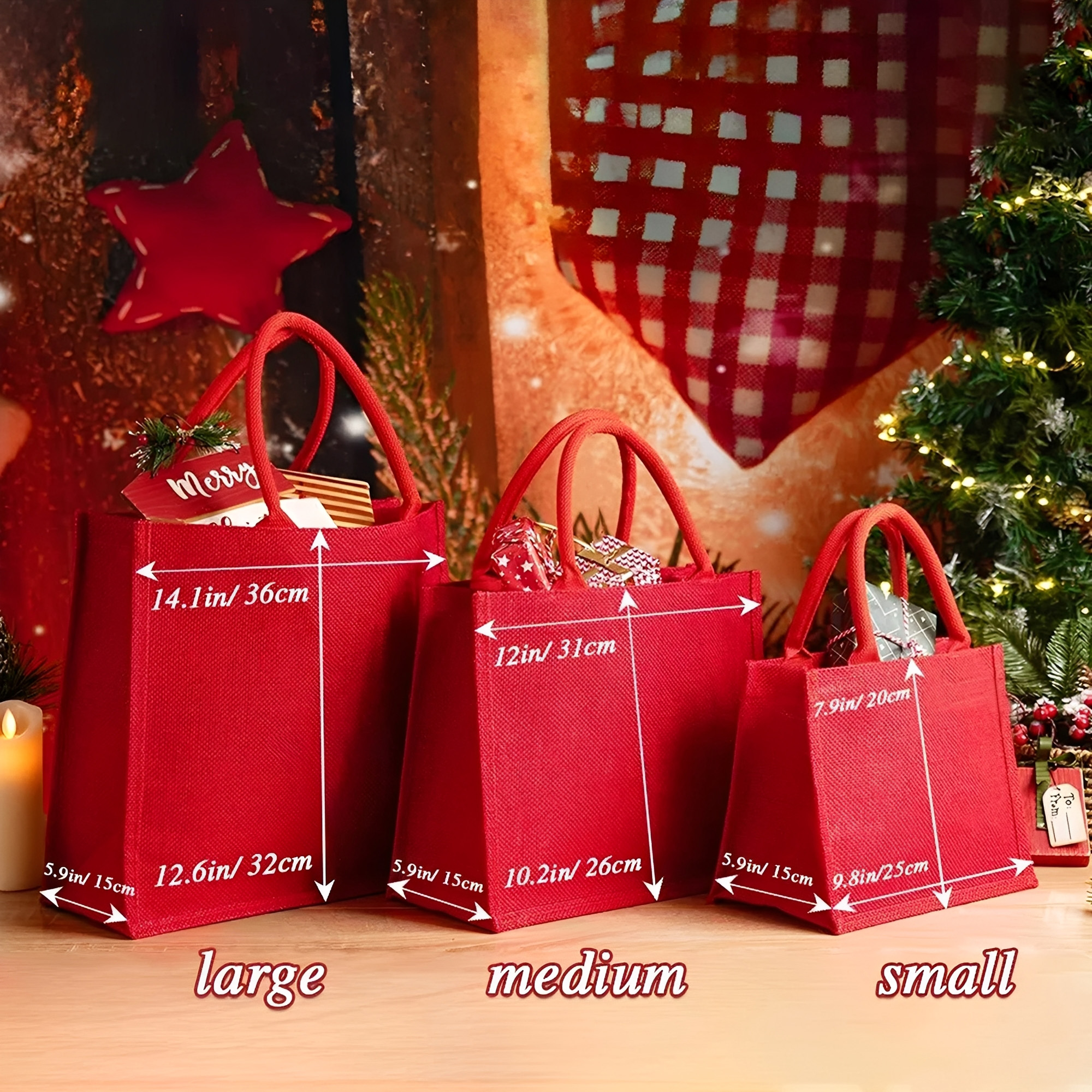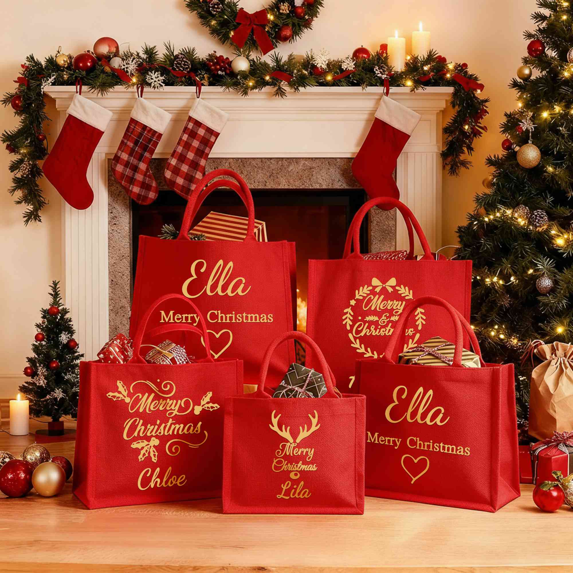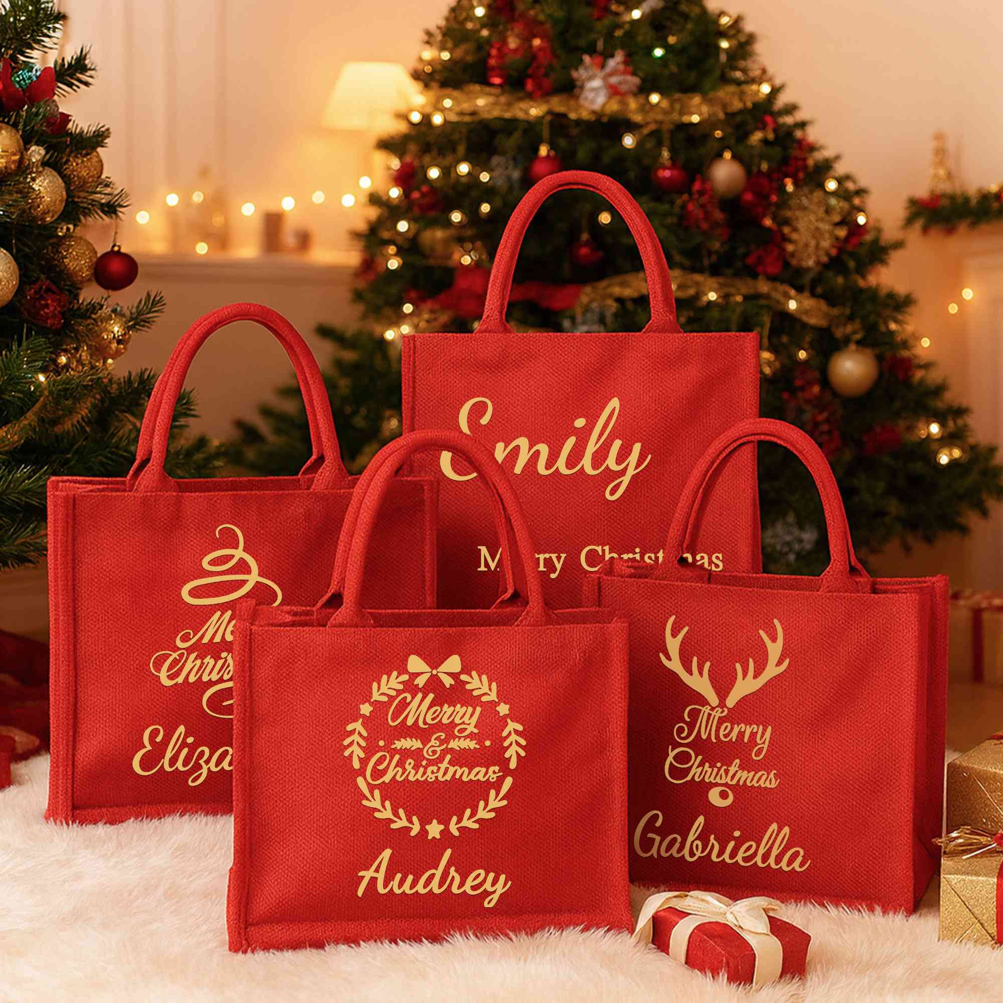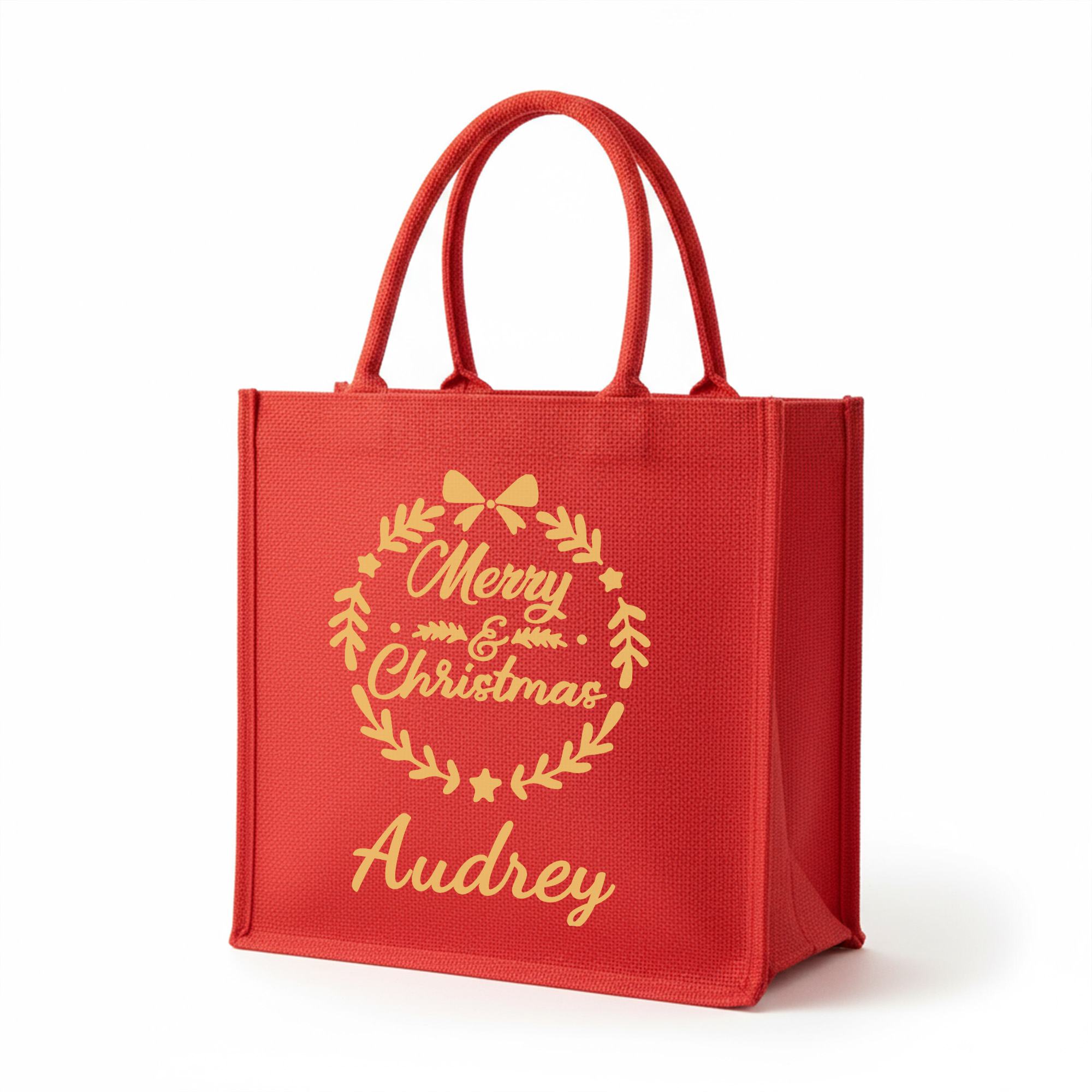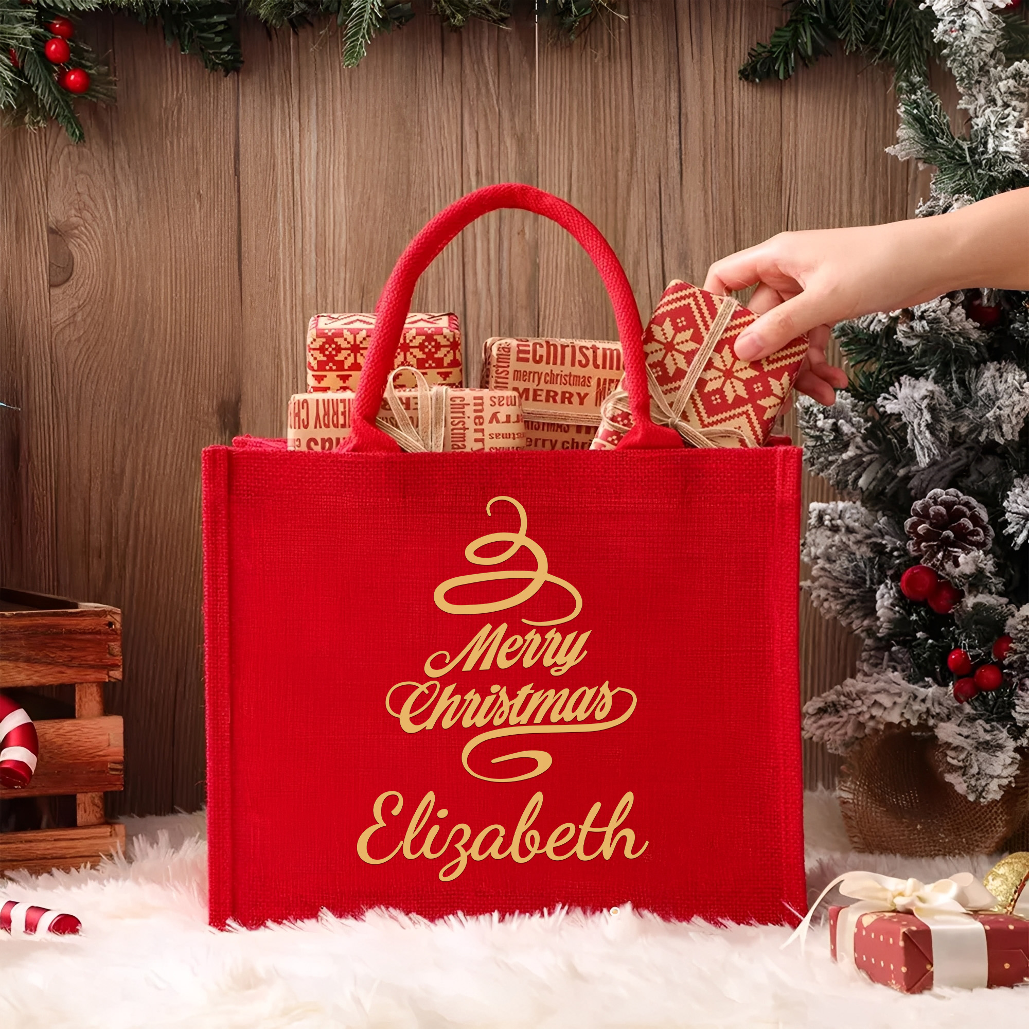 Festive & Elegant Design - This Personalized Gold Foil Merry Christmas Tote Bag features a joyful “Merry Christmas” message in gold font, available in different styles, bringing a cheerful holiday touch to your celebrations. The bright red jute fabric and elegant typography create a warm, festive look that complements Christmas trees, ornaments, and winter décor beautifully.