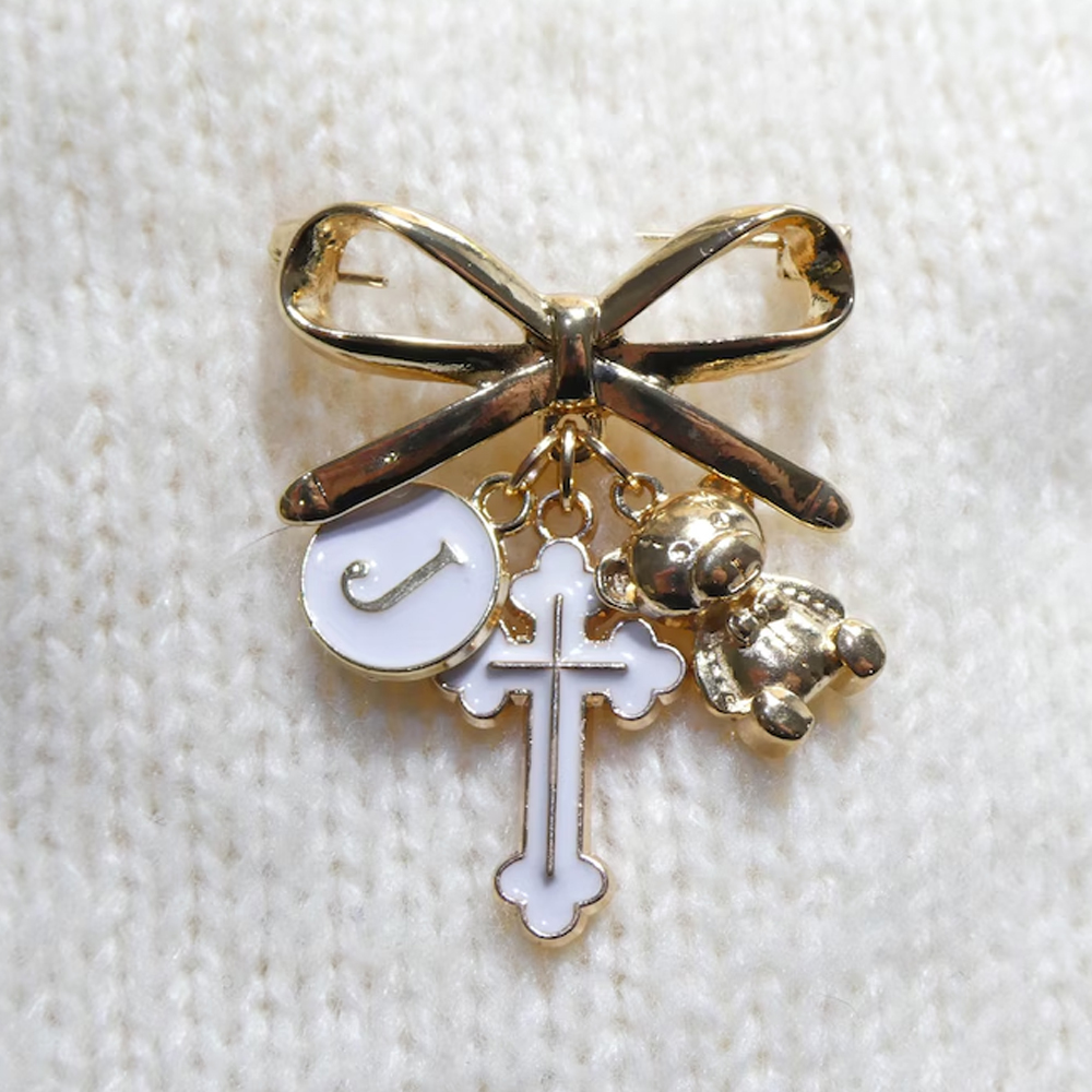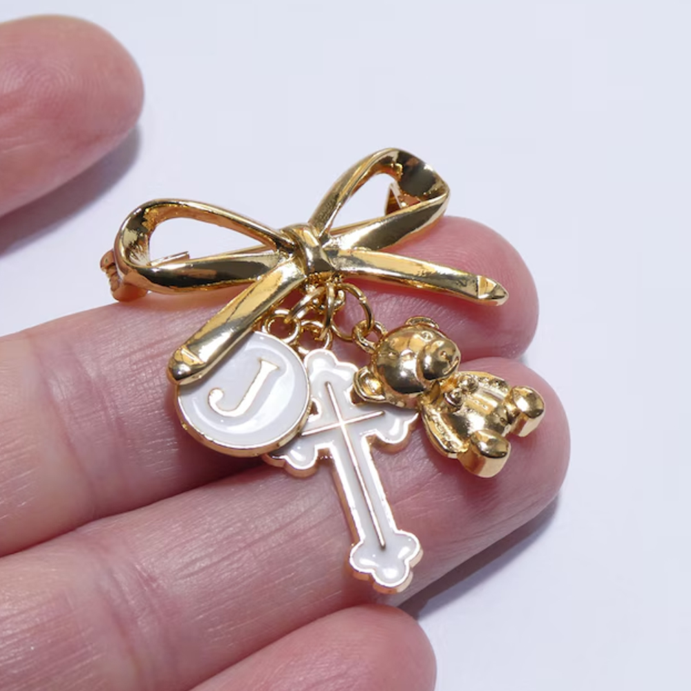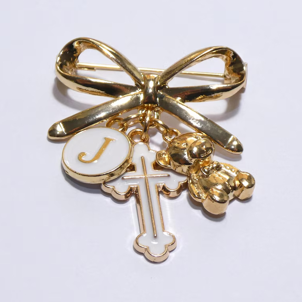 | Style | Personalized Initial Catholic Brooch with Teddy Bear Charm |