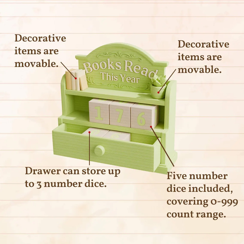 Elegant Design with Functional Display – Crafted from smooth, high-quality wood, this tracker combines rustic charm with modern style. Movable Decorations: Customize the placement of stacks of books and plants. Dice Set Included: Includes 5 dice ranging from 0 to 999. The clean, minimalist design fits perfectly on any bookshelf, desk, or nightstand.
