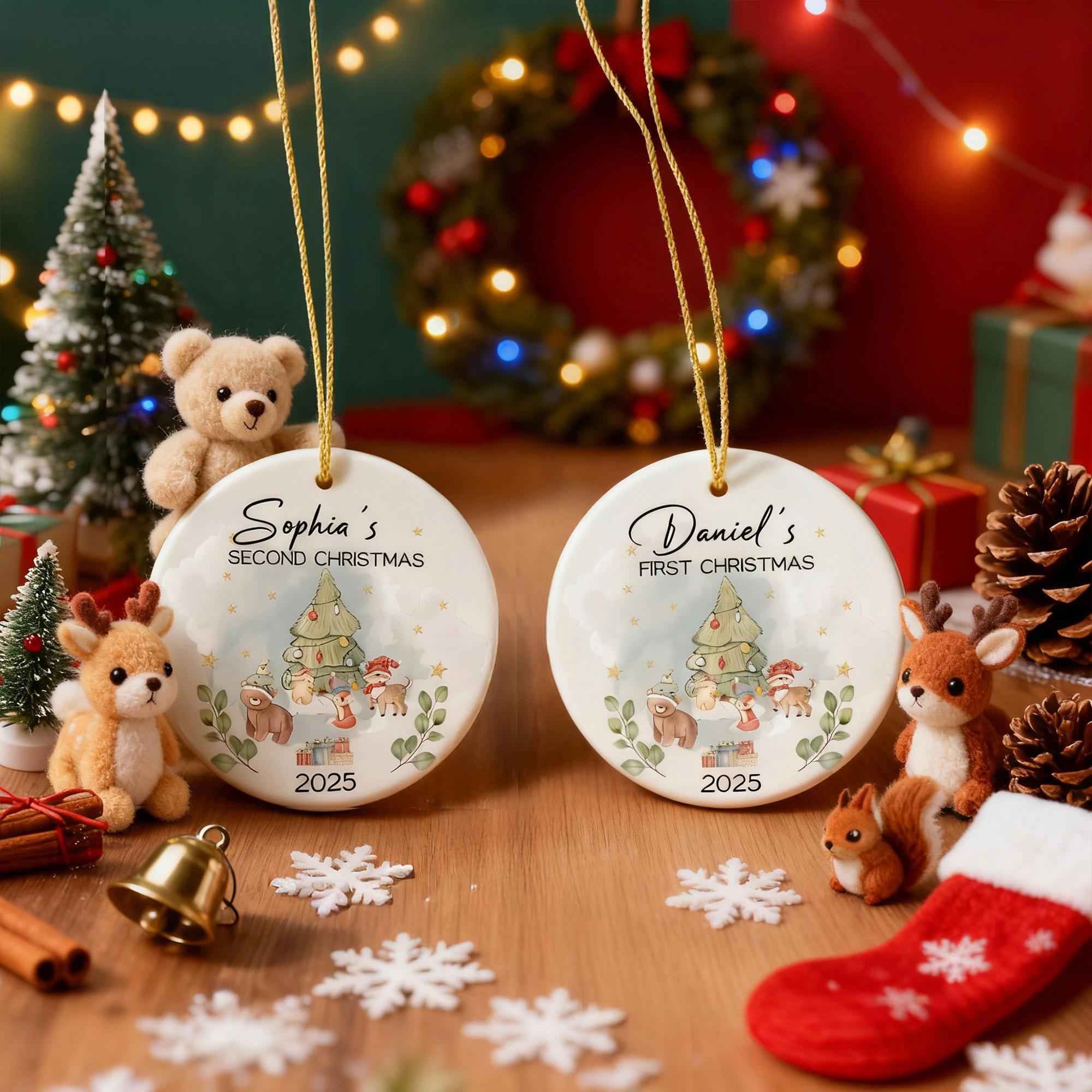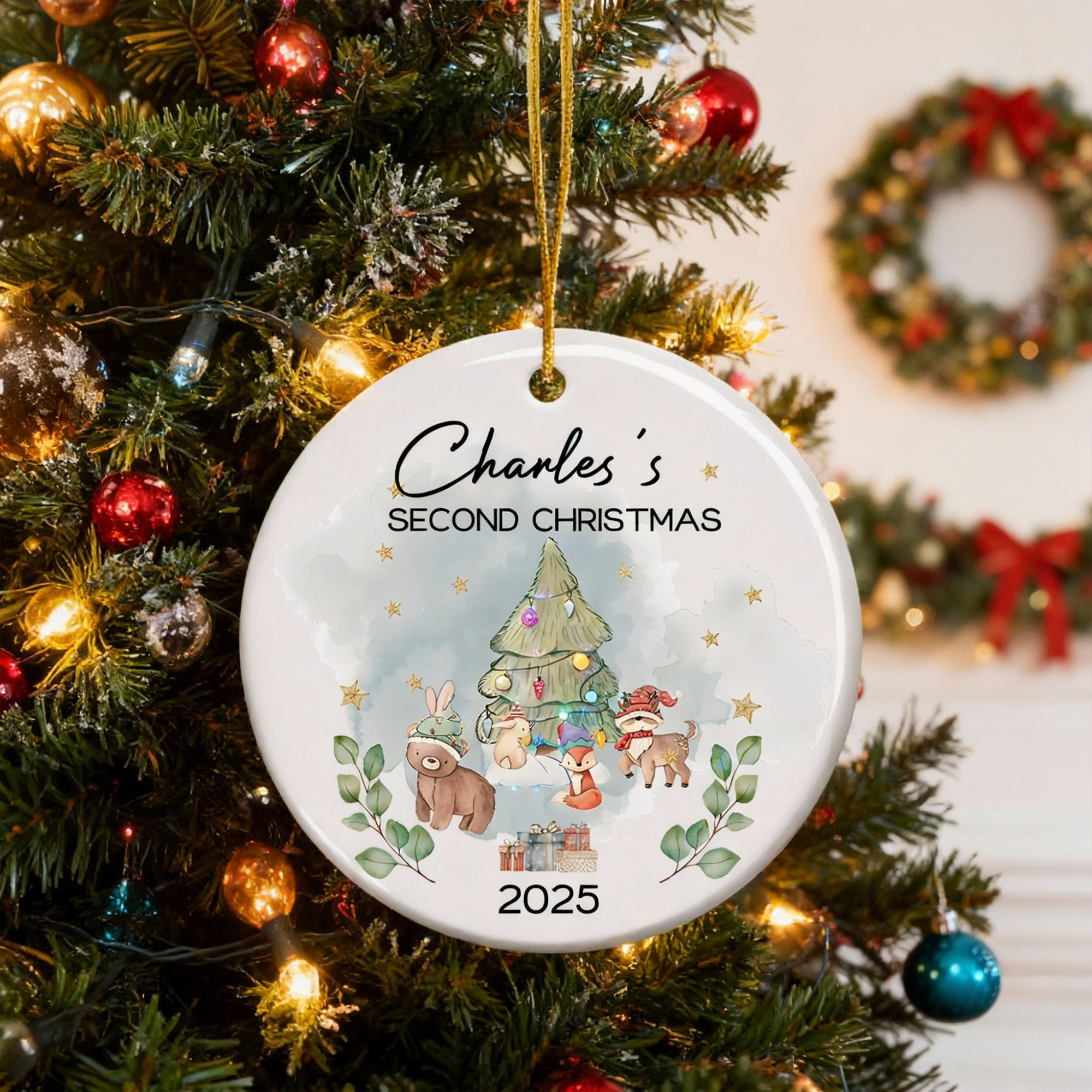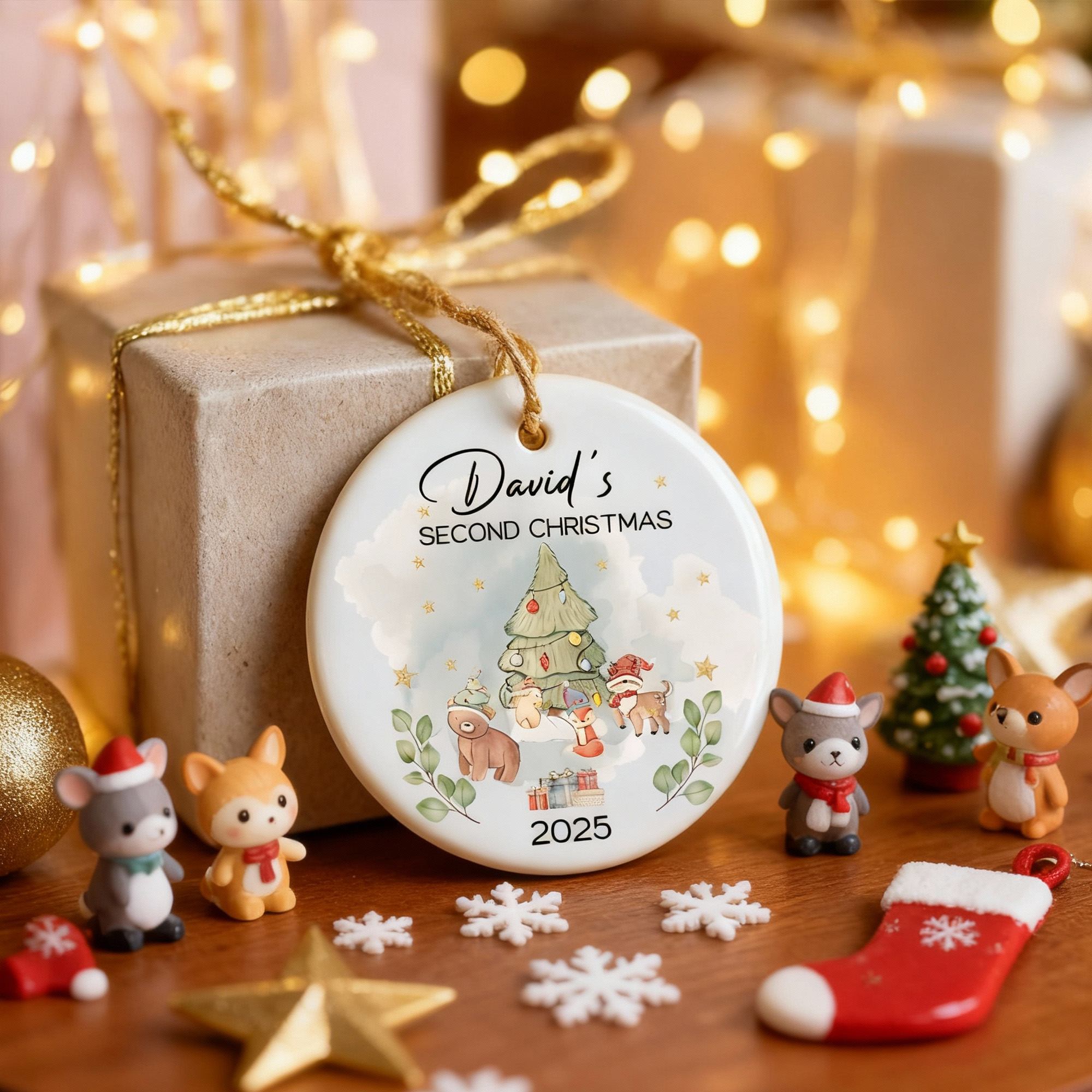 Cartoon Animals Design - This round ceramic ornament shows adorable cartoon animals gathered around your baby’s First or Second Christmas 2025. The playful artwork brings a warm, storybook feel to your holiday tree, adding a sweet touch to your seasonal décor.