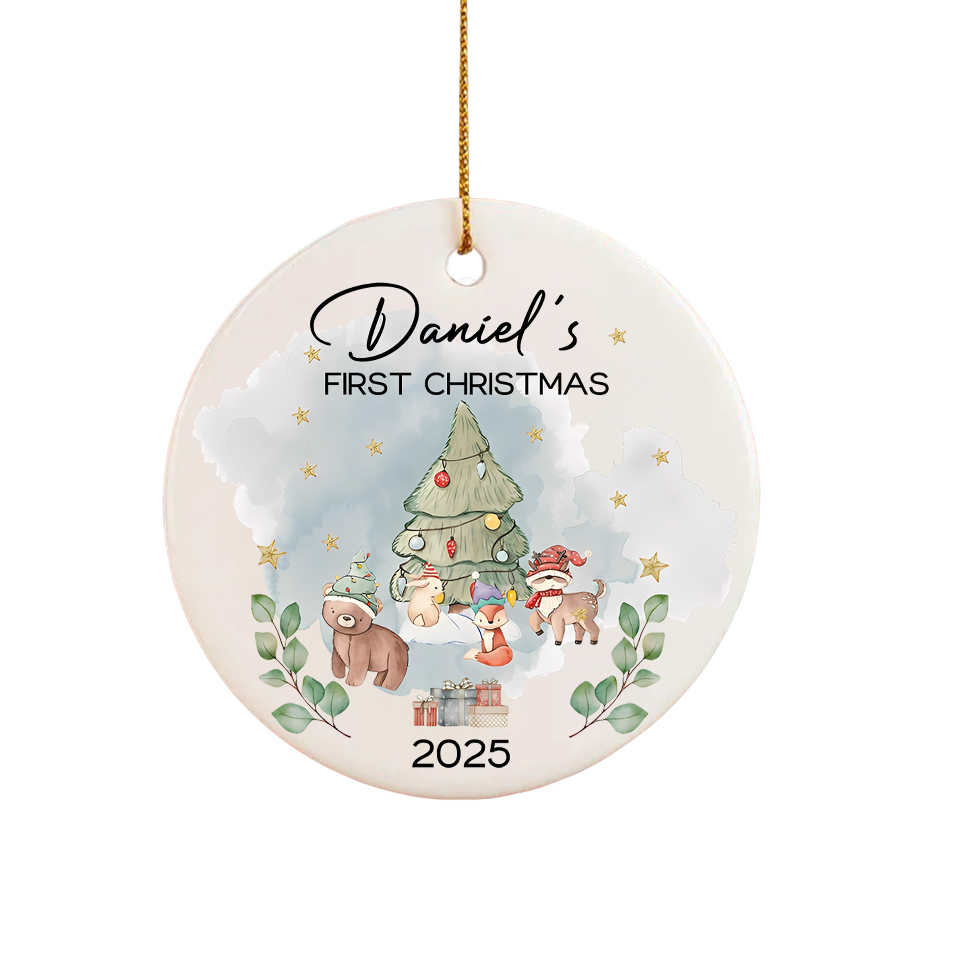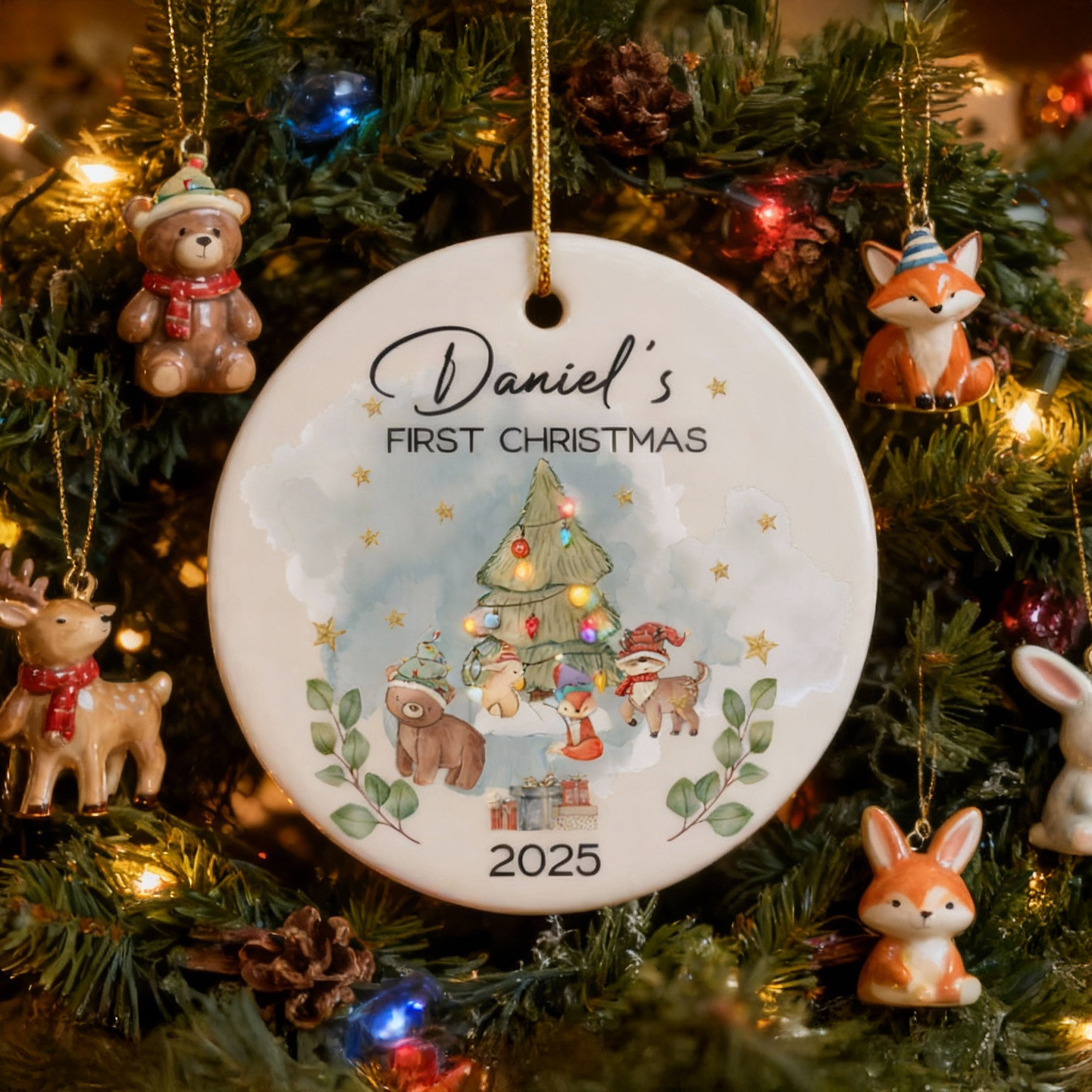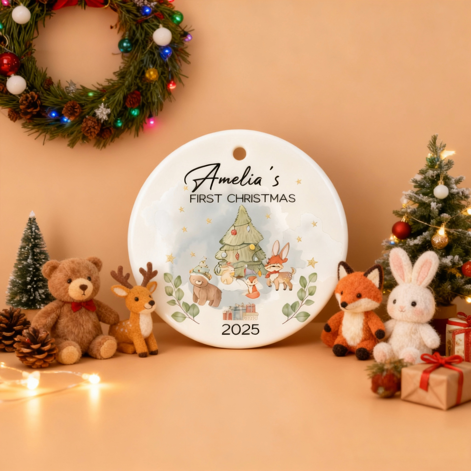 Cartoon Animals Design - This round ceramic ornament shows adorable cartoon animals gathered around your baby’s First or Second Christmas 2025. The playful artwork brings a warm, storybook feel to your holiday tree, adding a sweet touch to your seasonal décor.