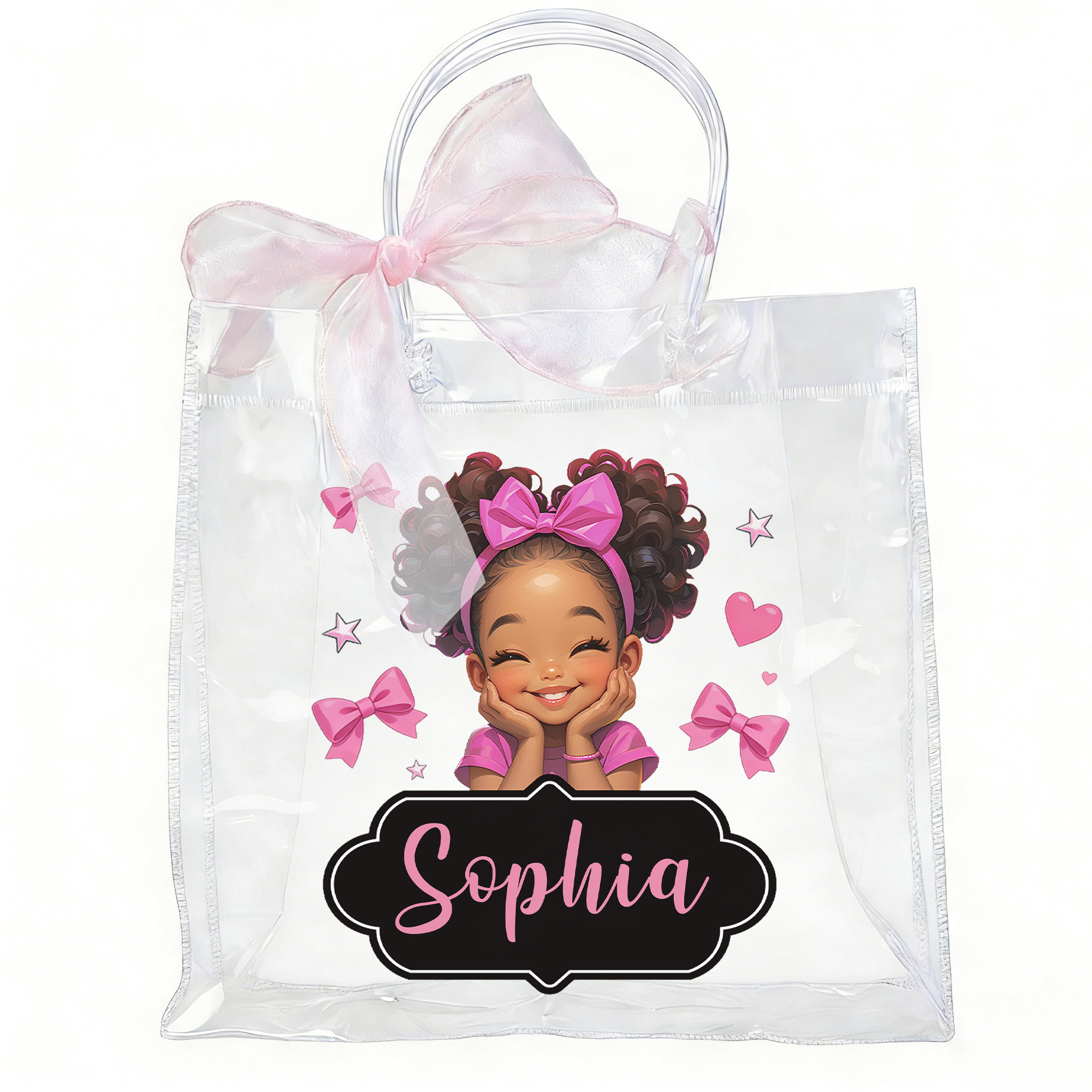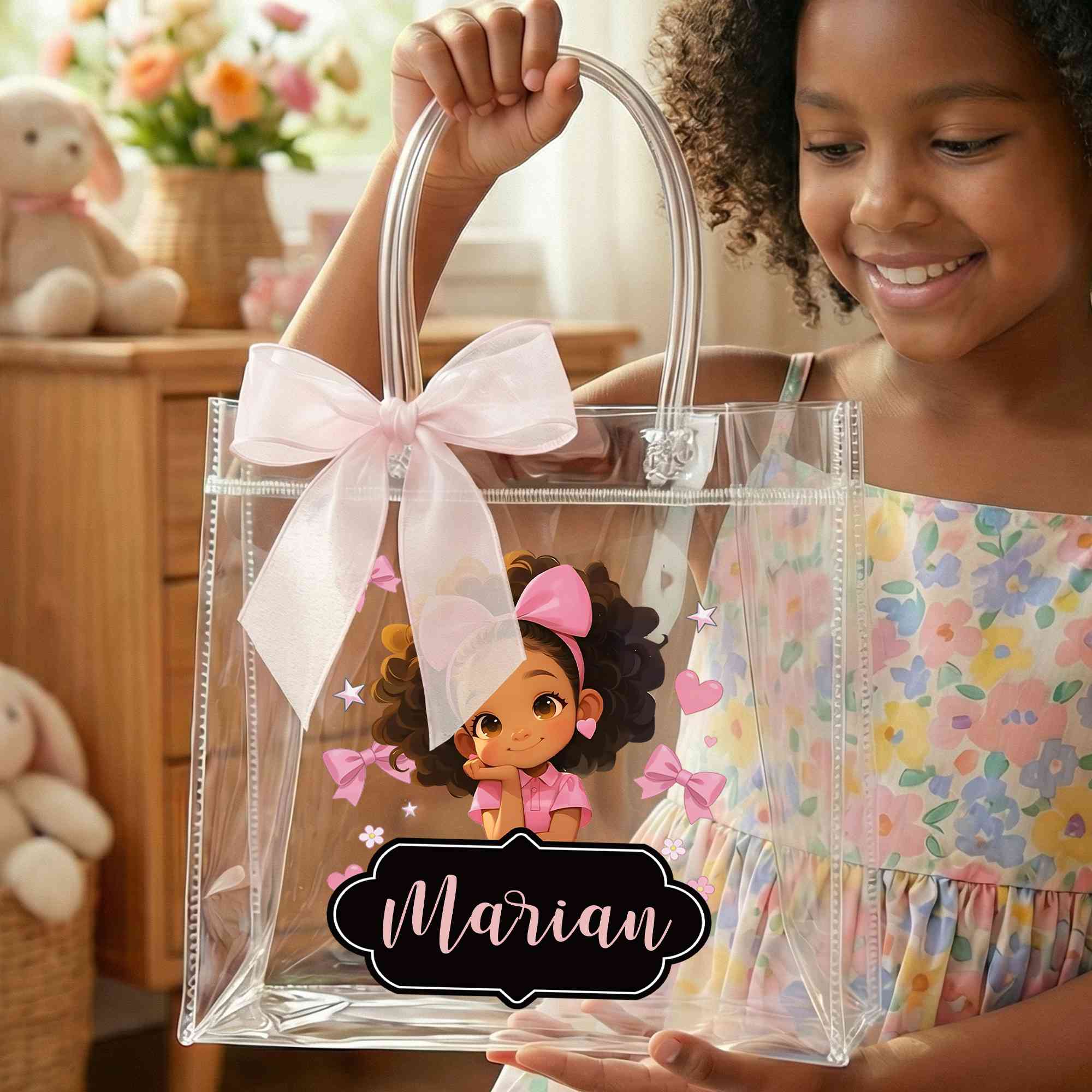 Cute Cartoon Black Girl Design - This gift bag with pink bow ribbon features a sweet cartoon character of a black little girl with a bright smile and a bow in her hair. The playful style celebrates confidence and joy, while the clear body shows off colorful Easter eggs, candy, or small toys inside. It is a lovely way to highlight personality and cultural pride.