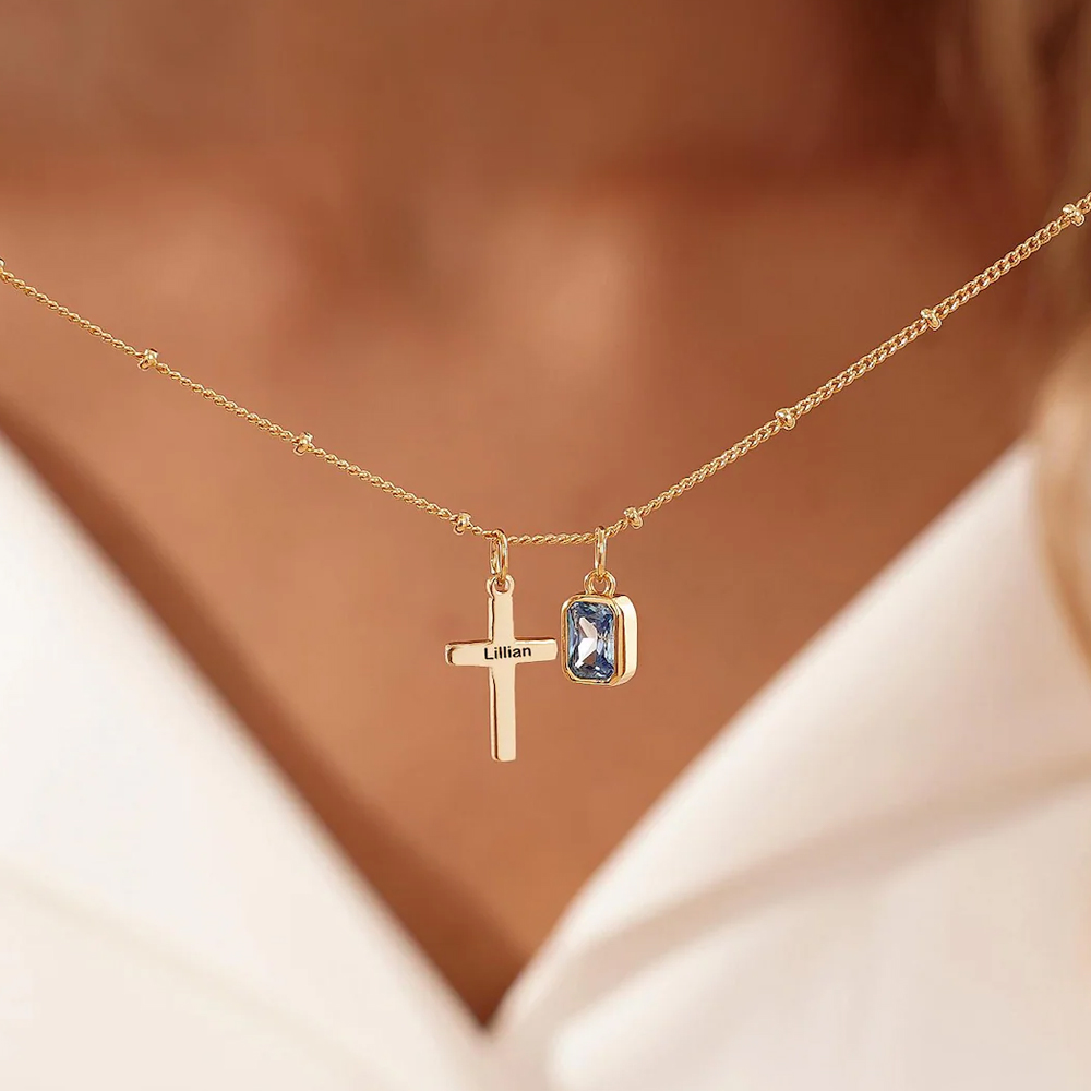 | Style | Personalized Name Cross Necklace with Birthstone |