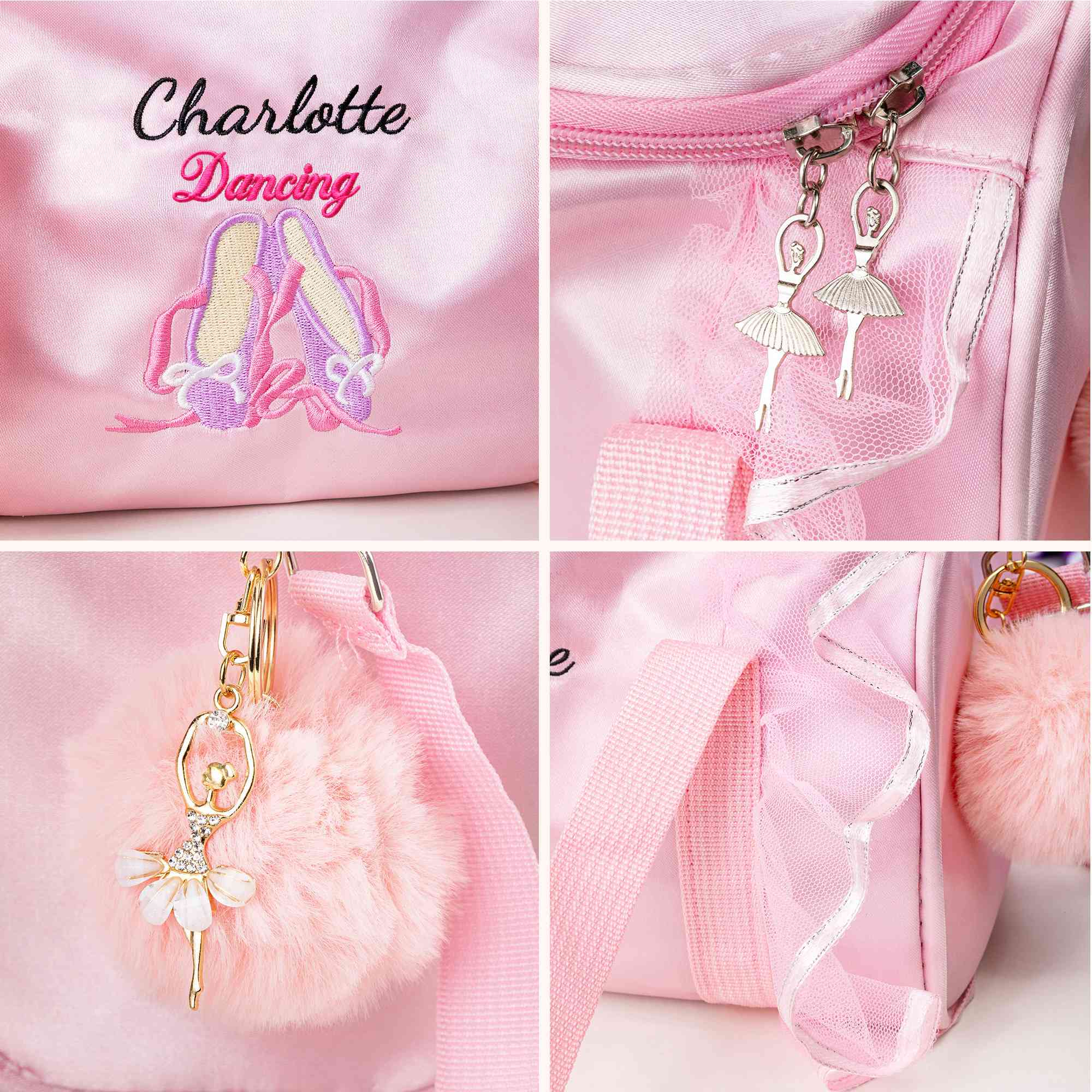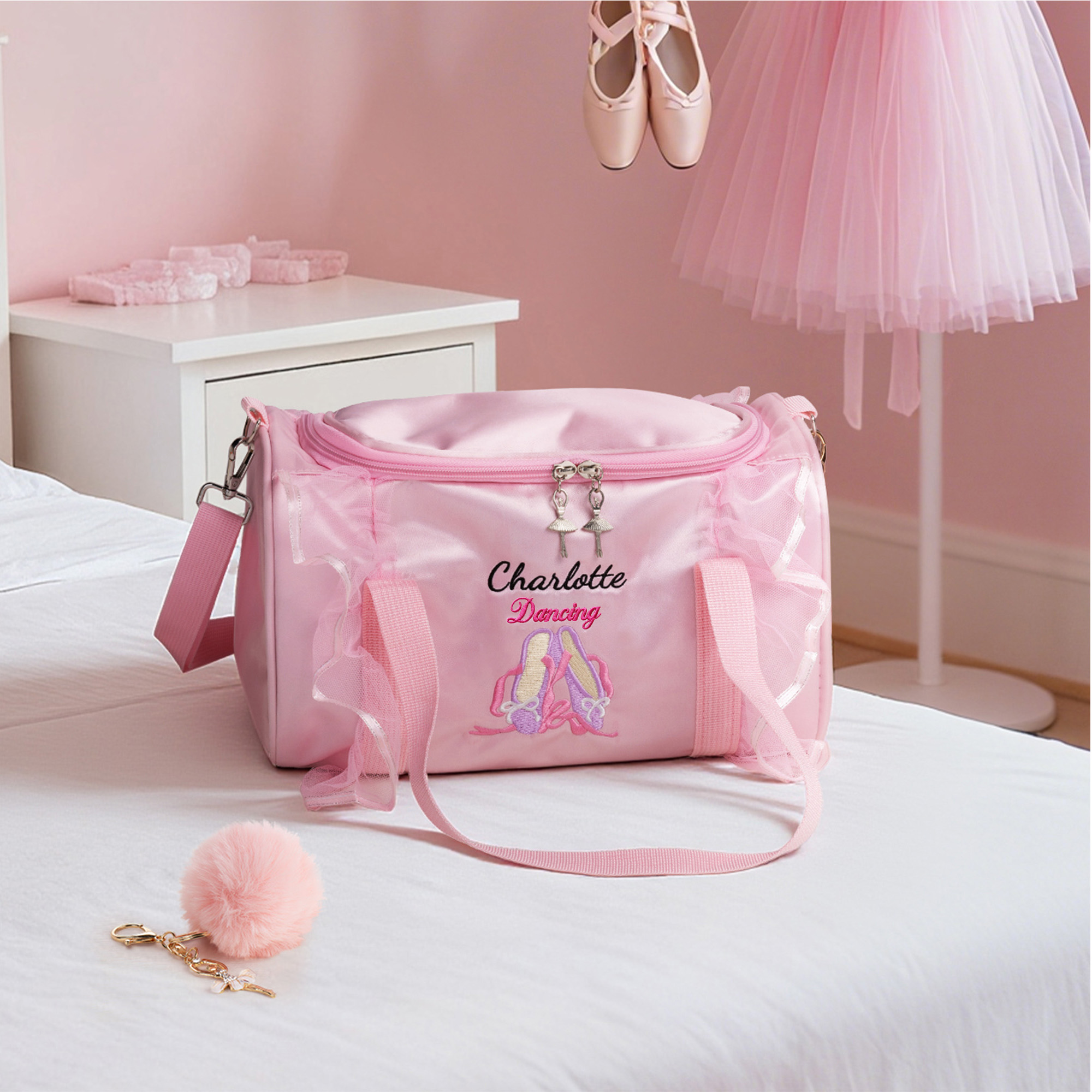 Custom Design - Choose from various embroidery thread colors and add a personalized name for a truly special touch. The bag showcases embroidered ballet shoes, the word “Dancing,” and charming ballet-inspired accents like ballerina zipper pulls and a pink pom-pom keychain. These details transform a practical bag into a meaningful keepsake that reflects a dancer’s style and spirit.