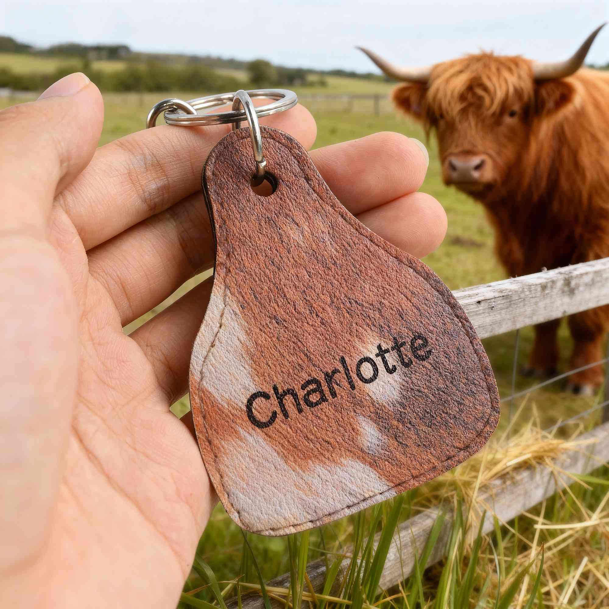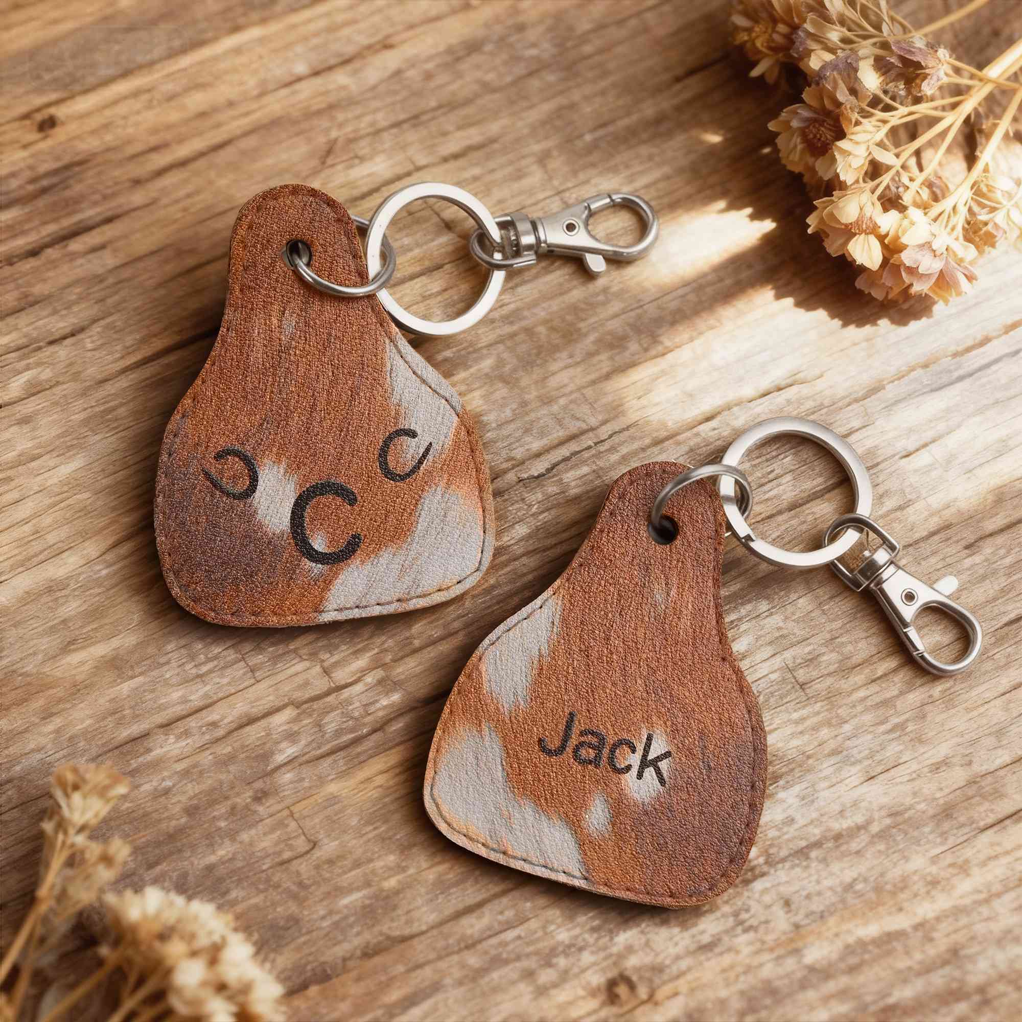 Custom Western Design - Showcasing a rugged cowboy-brown fur texture print, this keychain perfectly embodies the classic spirit of the American West. It features double-sided personalization — one side for a full name and the other for a single initial. The rich texture and custom details combine to create a standout accessory that honors Western heritage with modern flair.