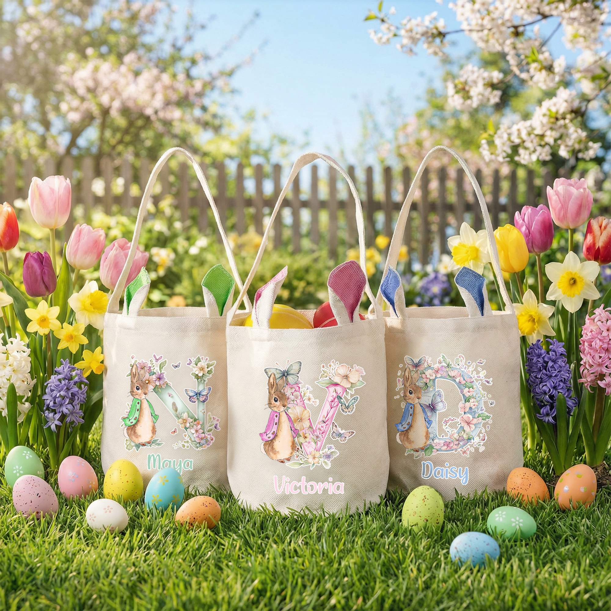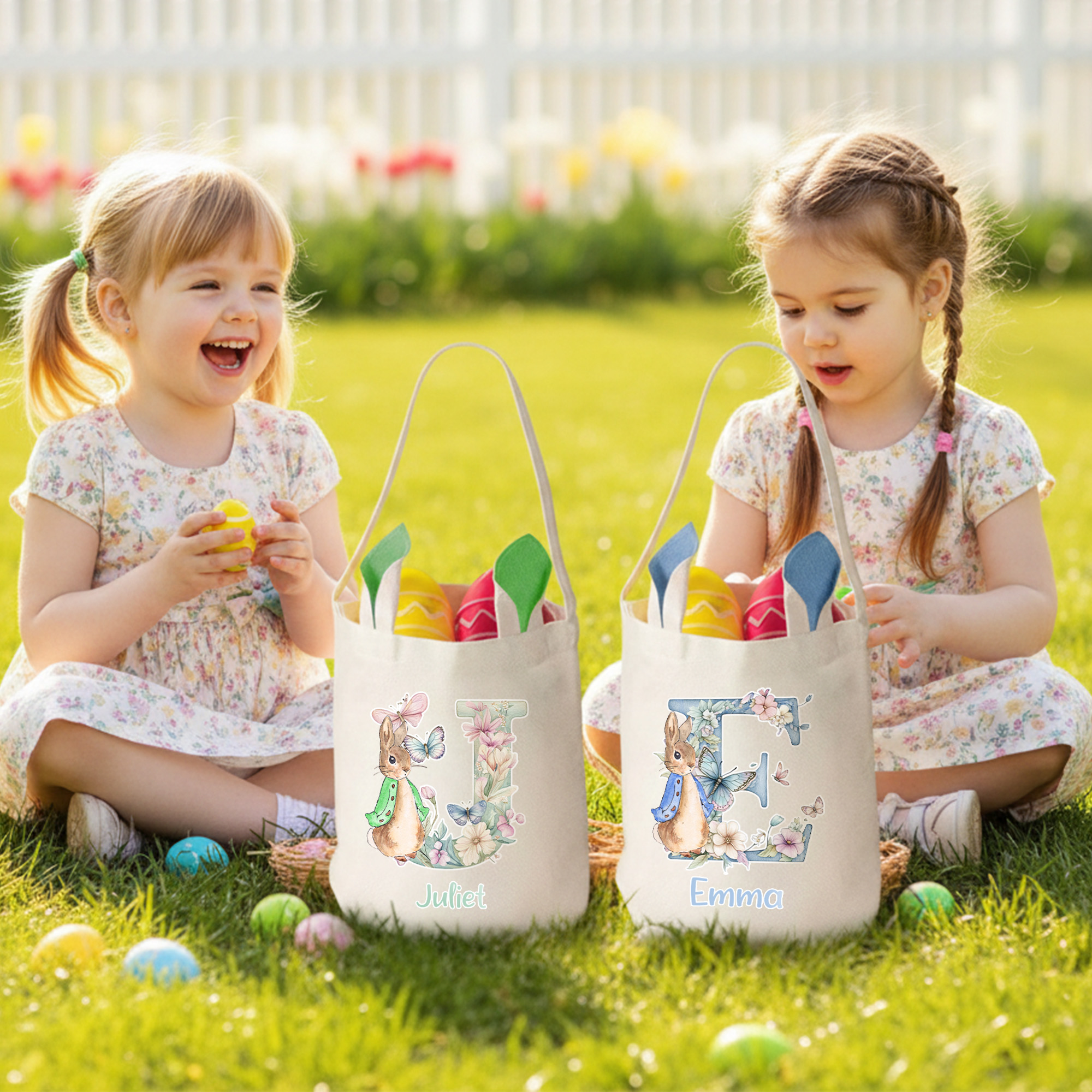 Whimsical Peter Rabbit Design - This kids Easter basket features a charming Peter Rabbit illustration paired with an alphabet initial, accented by soft flowers and butterfly details. The playful bunny ears add a cute and festive touch that children love during Easter egg hunts and parties.