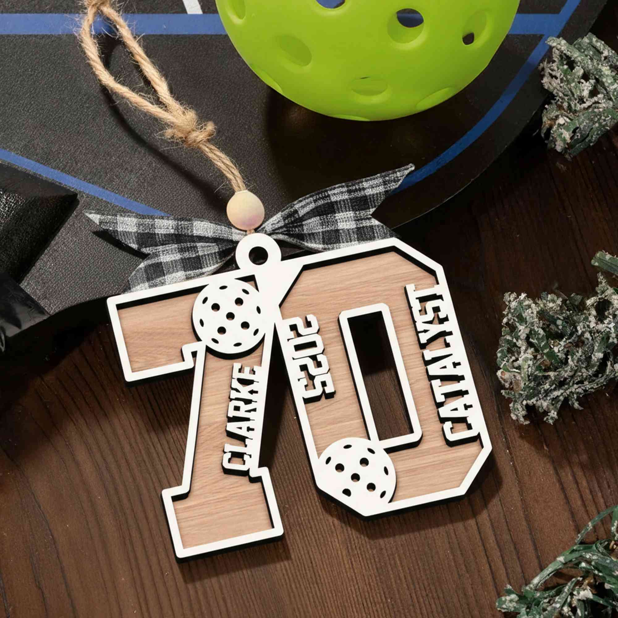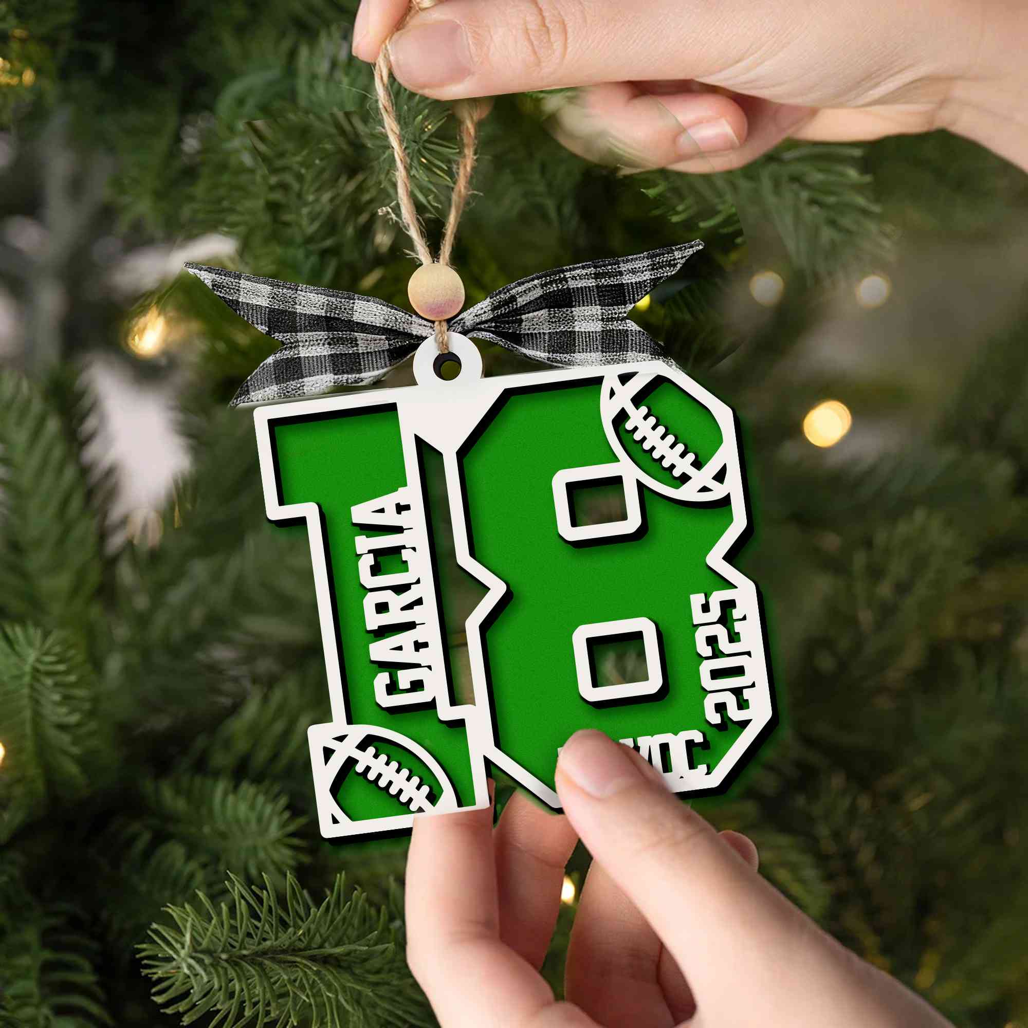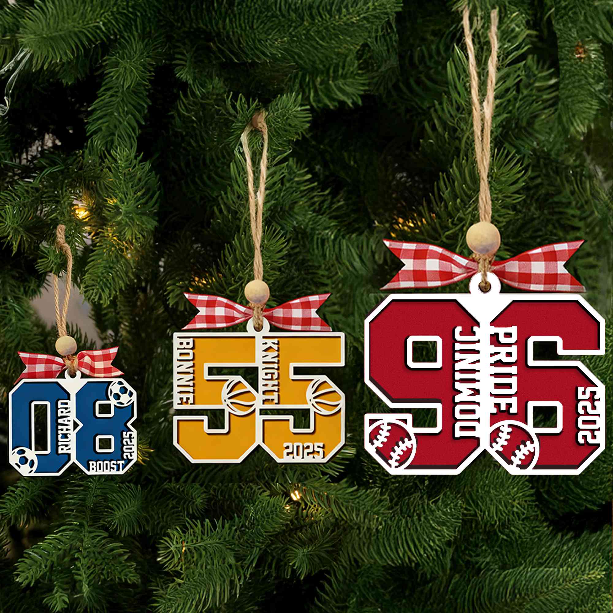 Custom Sports Design - This ornament features bold number shape adorned with bow and offers eight sports themes: American football, basketball, baseball, soccer, volleyball, pickleball, tennis, and softball. You can personalize it with your favorite team’s color and player number (00–99). The number must be in a two-digit format. Additionally, you can add a name and even include a team name and year, turning it into a festive decoration that perfectly combines sports enthusiasm with holiday cheer.