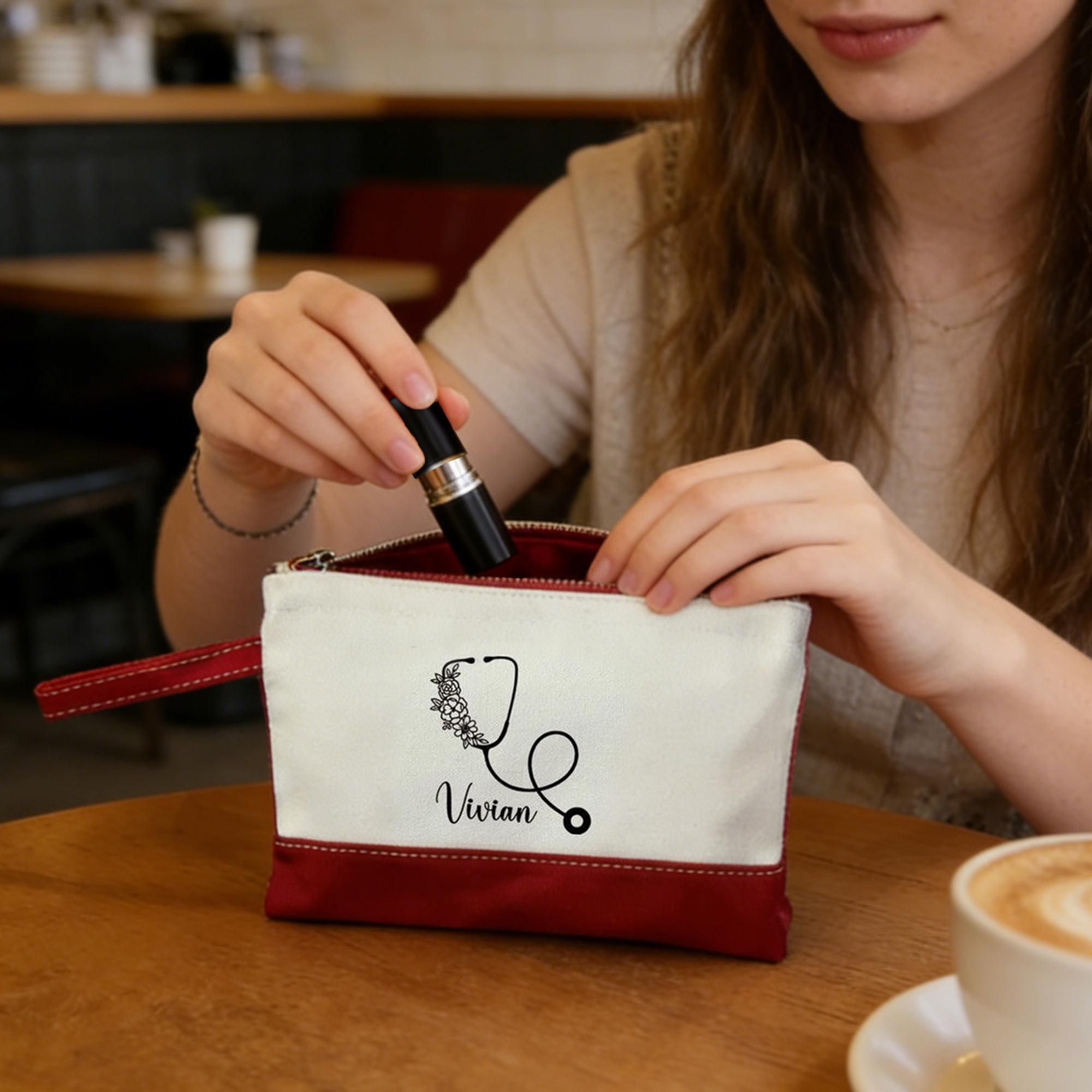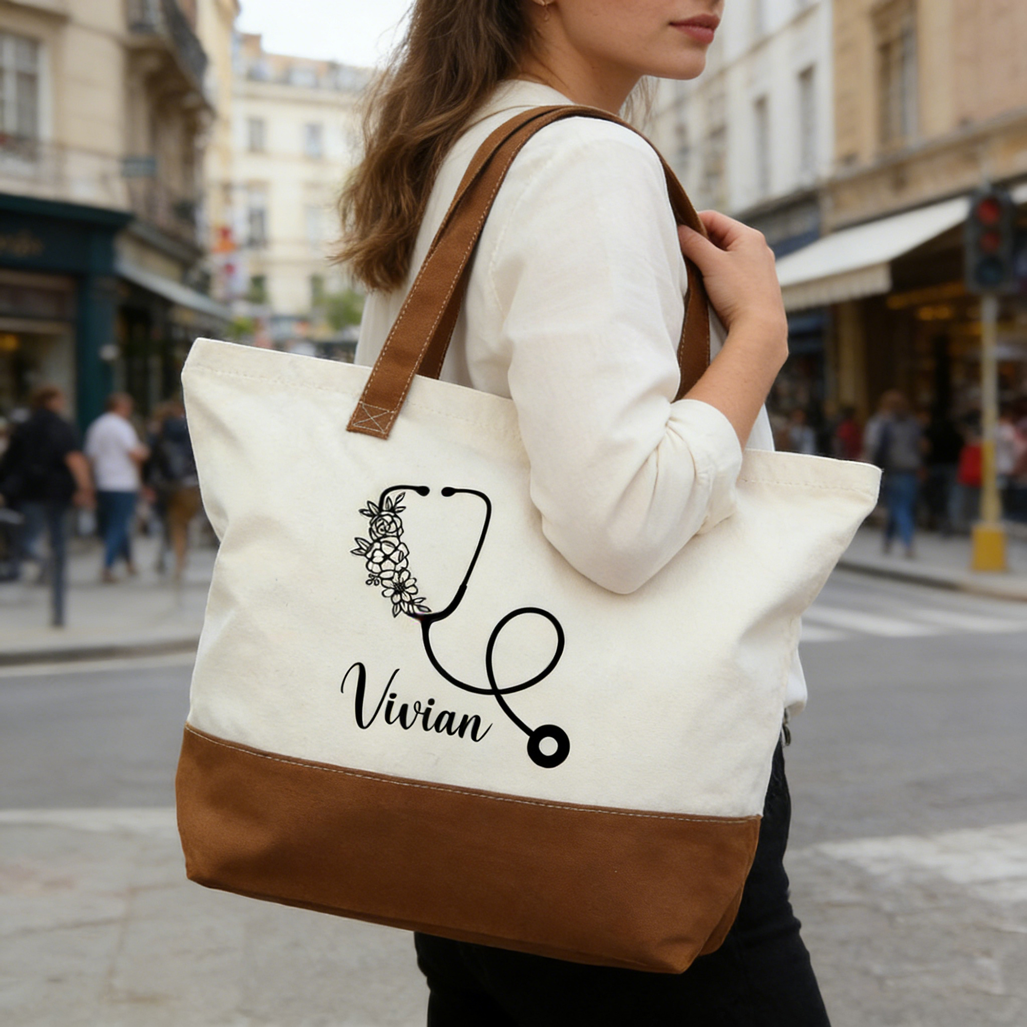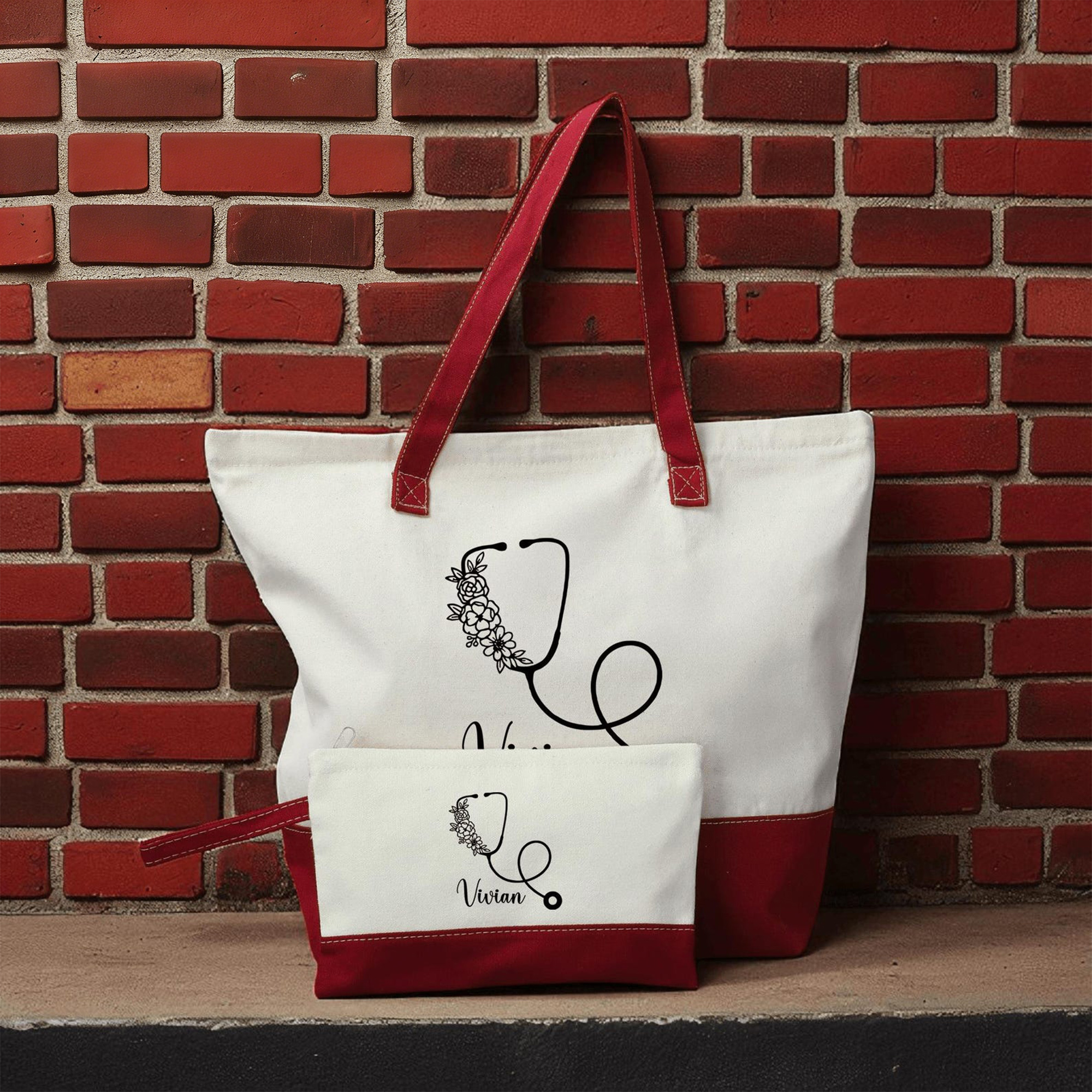 Personalized with Name — Engrave or print your name in clean, modern script beneath the stethoscope motif—positioned centrally on both the tote and pouch for cohesive recognition. The floral accents wrap organically around the tubing, adding grace without overwhelming the professional silhouette.