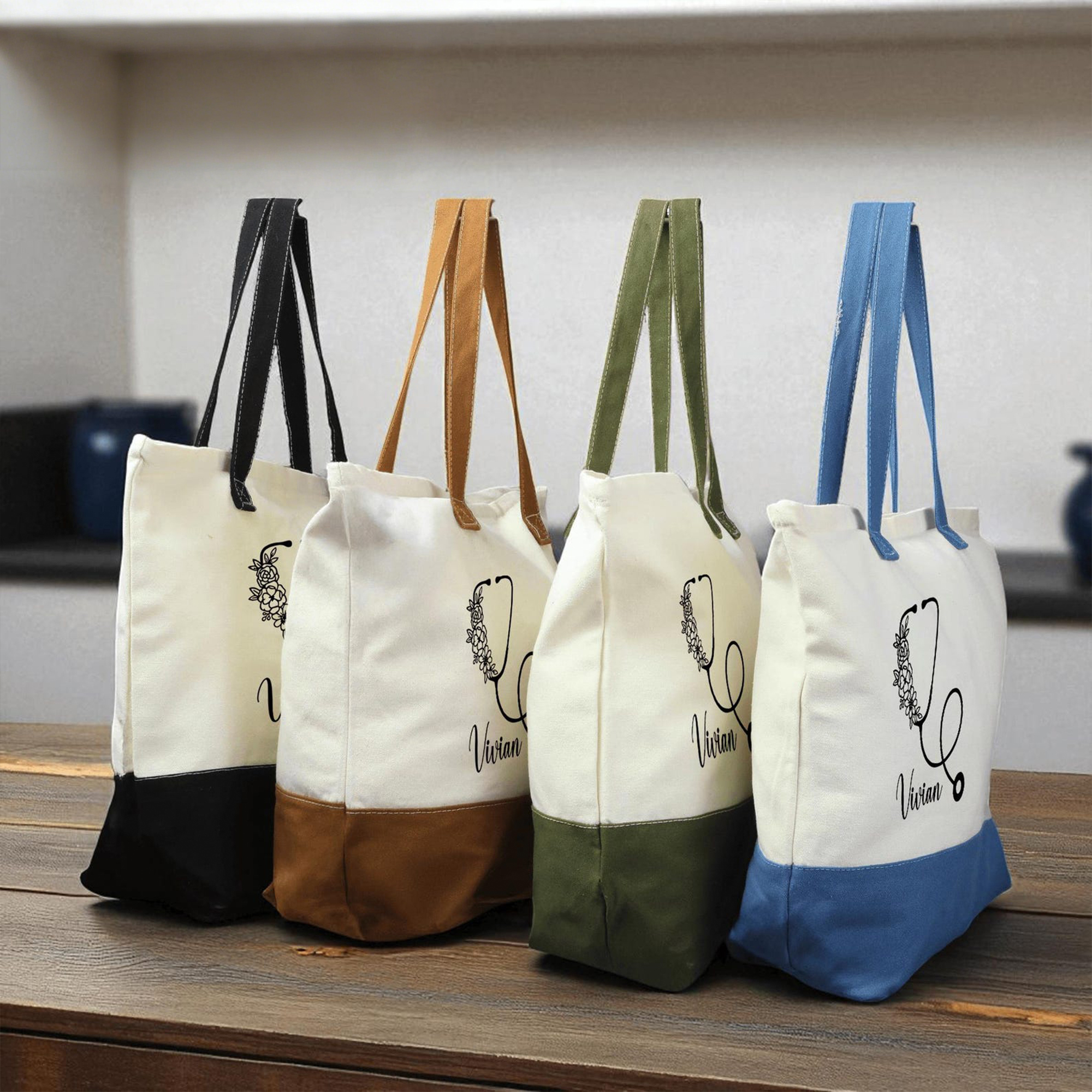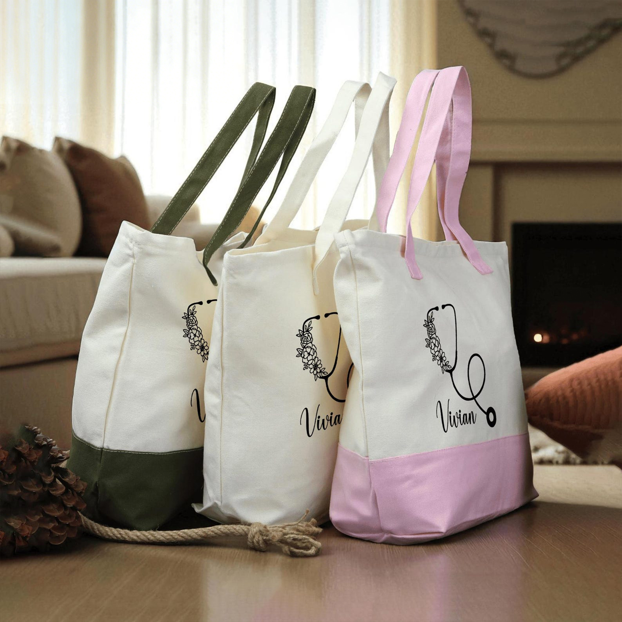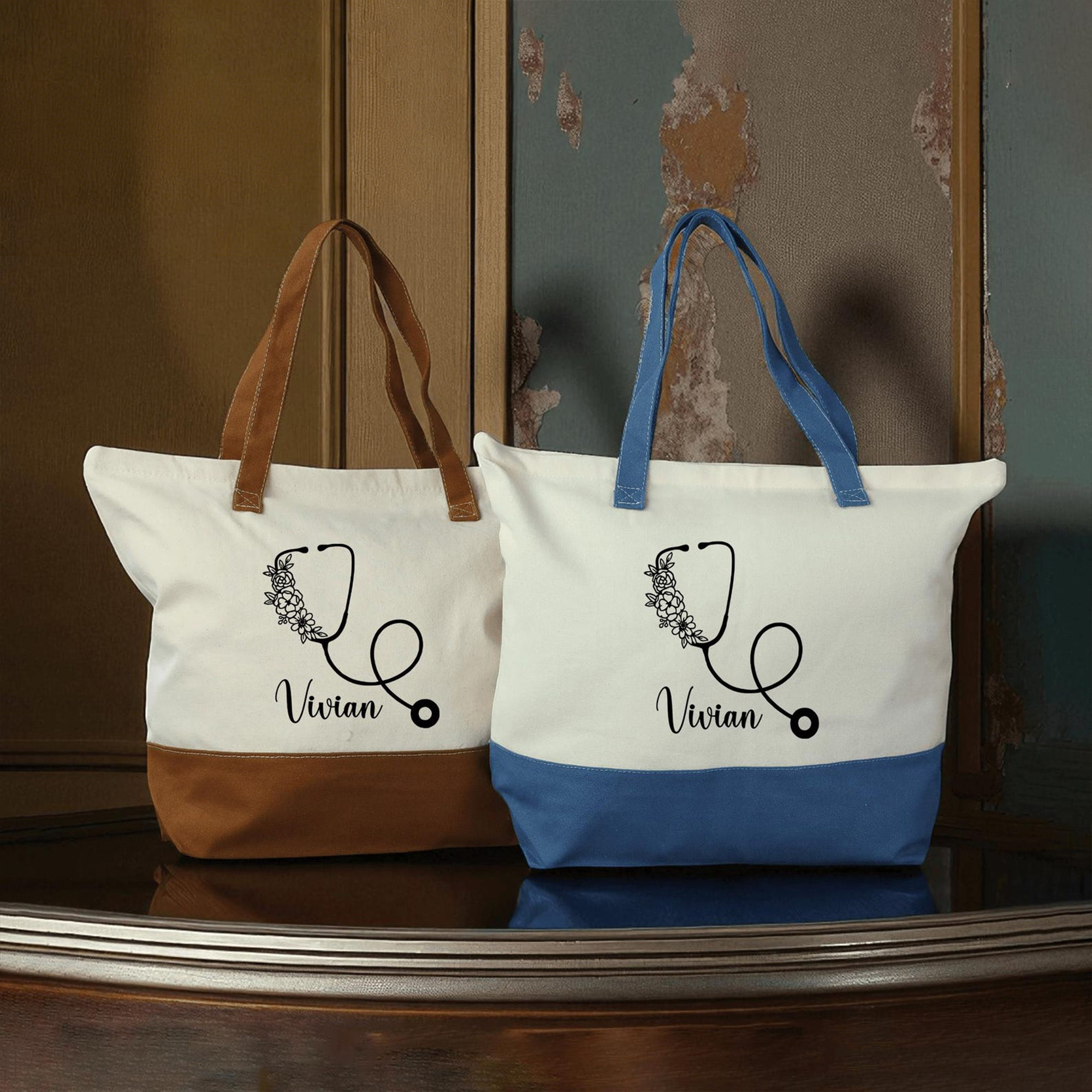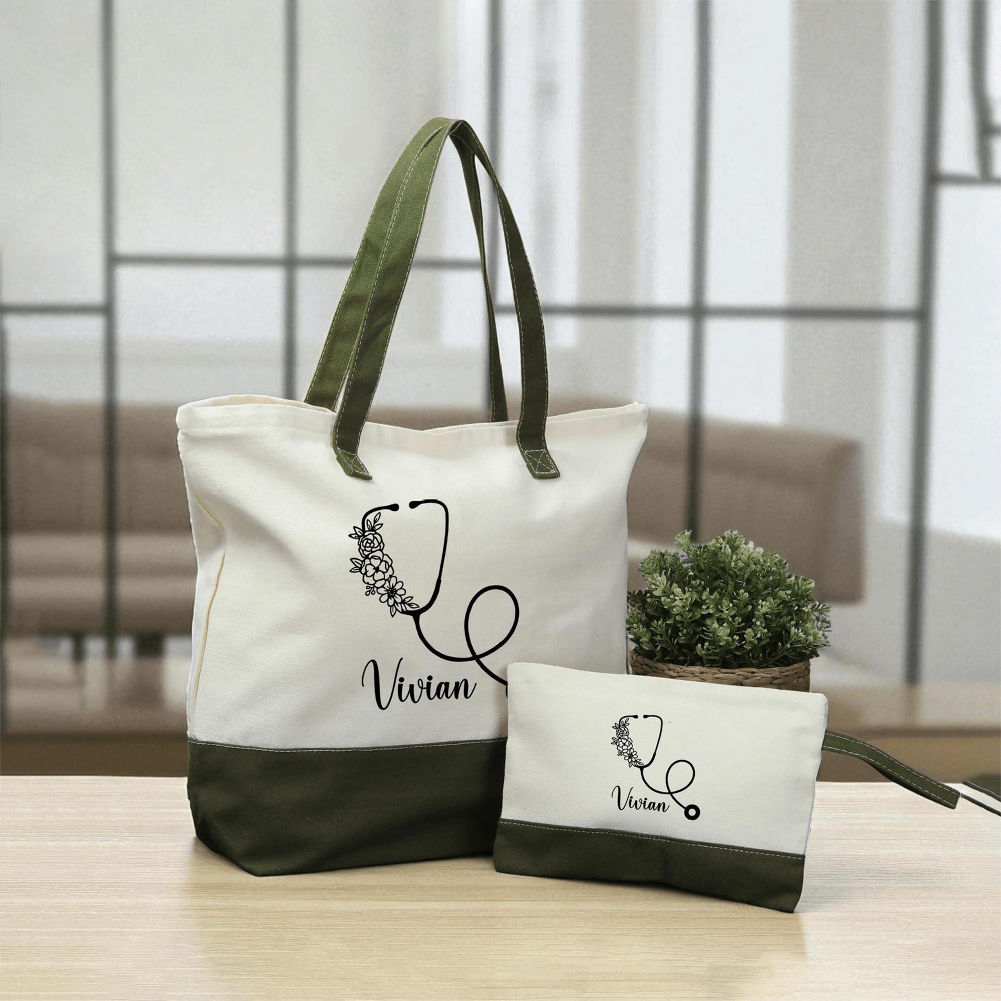 Personalized Nurse Floral Stethoscope Canvas Bag Set with Name, Multicolor Reusable Work Tote Bag & Pouch, Appreciation/Graduation Gift for Nurses
