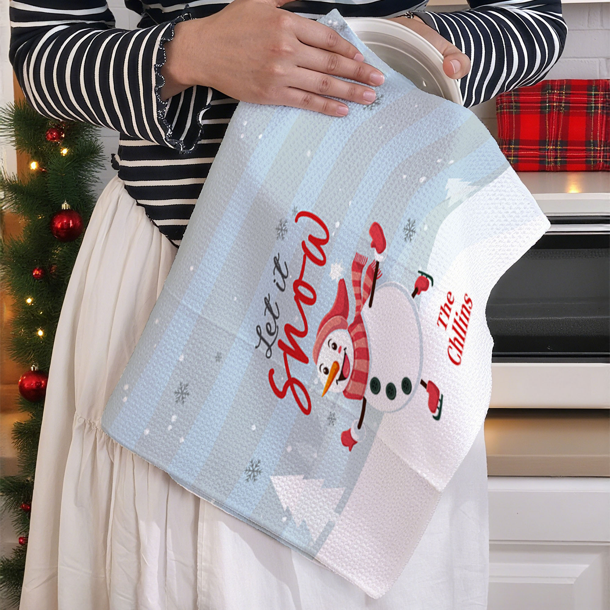 Festive Snowman Design - This waffle weave dish towel features a skating snowman surrounded by soft winter tones, bringing a joyful and cozy Christmas vibe to your kitchen. Its charming artwork adds a playful seasonal touch that brightens up any countertop or oven handle during the holidays.