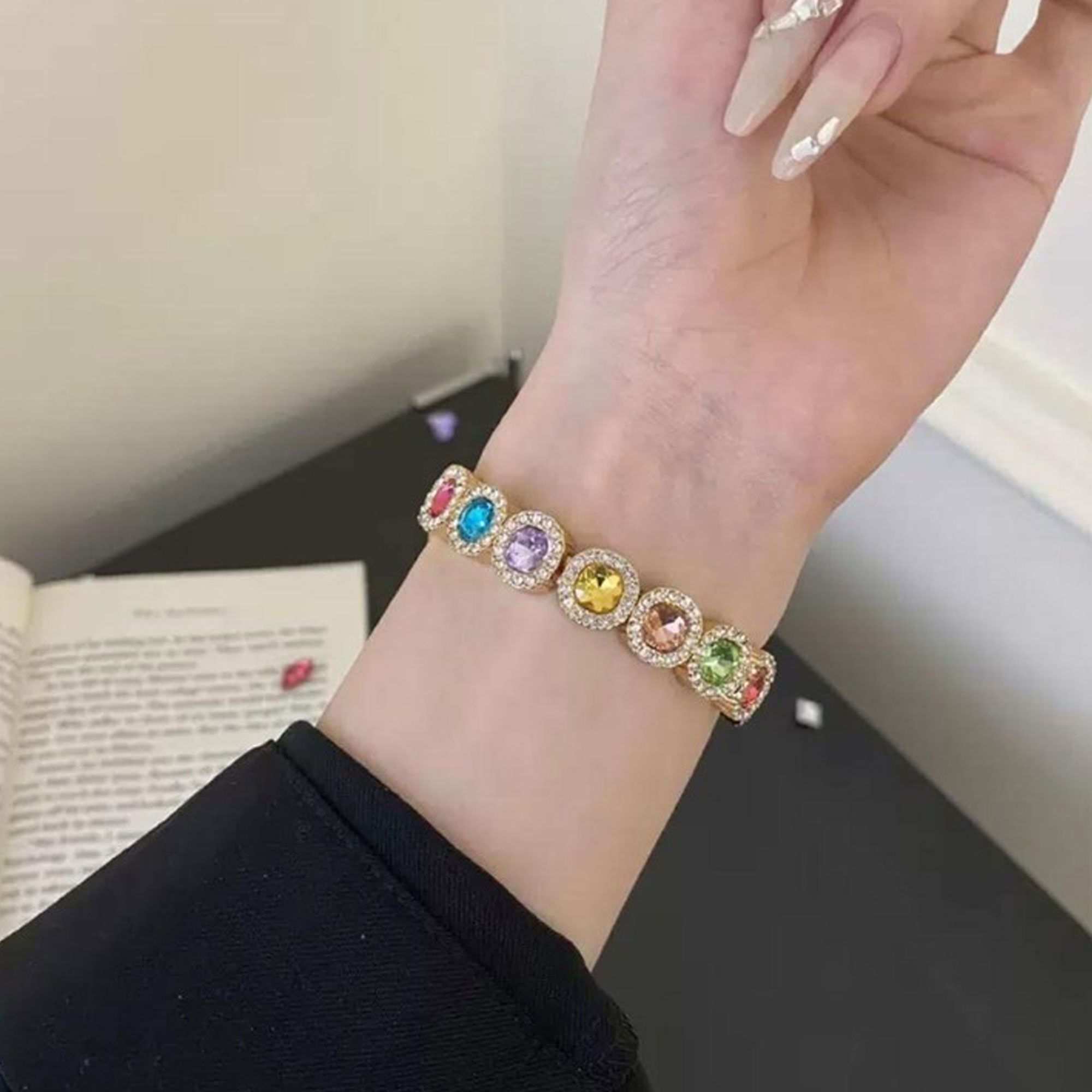 Colorful Gemstone Accents – Vibrant gemstones in shades of pink, blue, green, yellow, and red are embedded along the band, adding personality and flair. The mix of hues brings a playful yet elegant touch to any outfit.